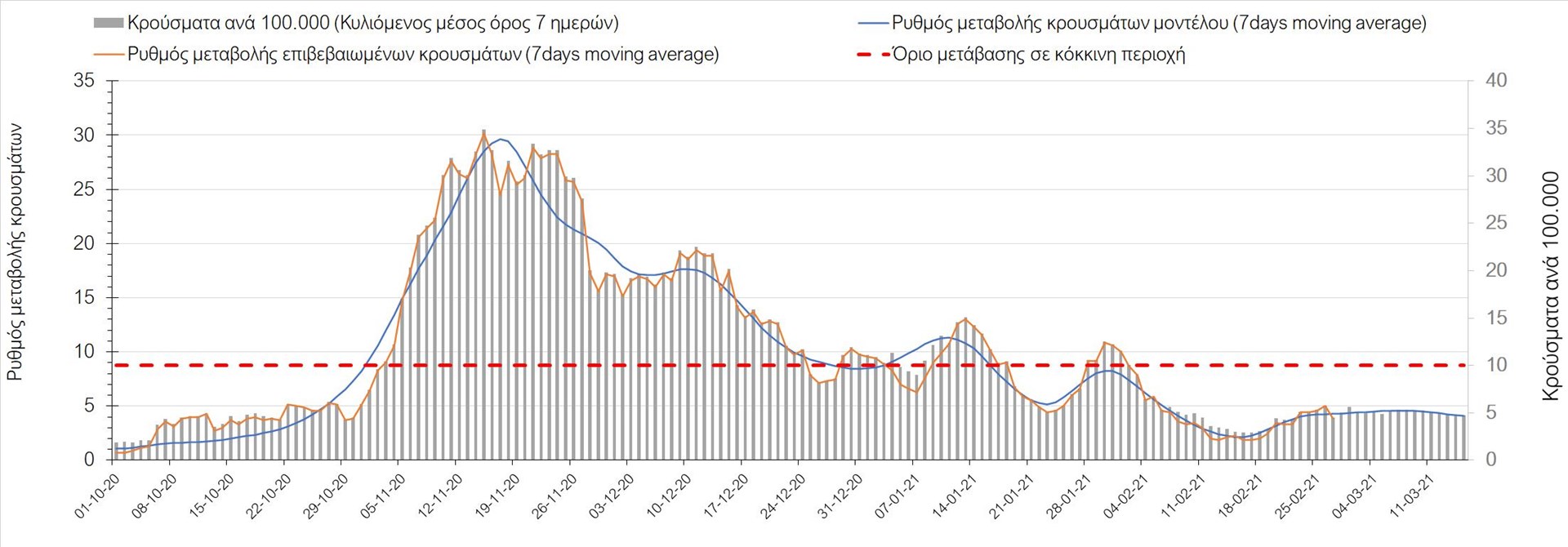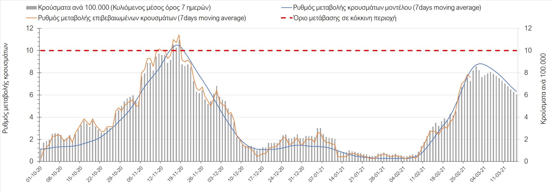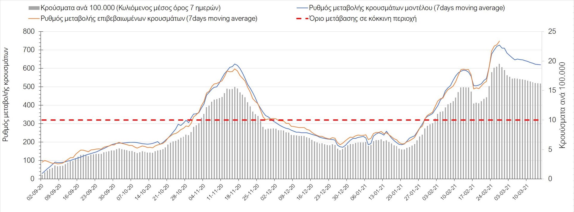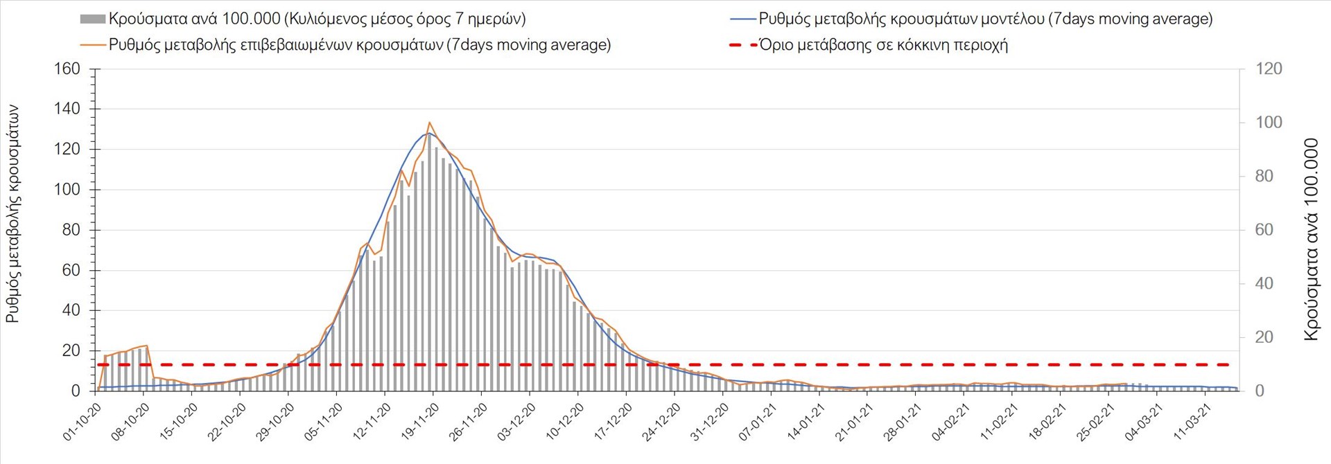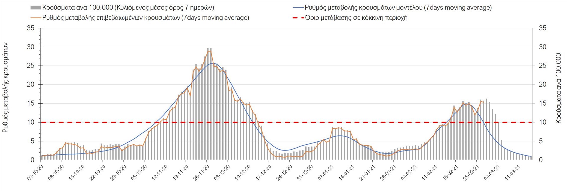 Mε βάση τα δεδομένα αυτής της εβδομάδας, καλώς εφαρμόσθηκαν τα περιοριστικά μέτρα που ισχύουν από τις 6 Φεβρουαρίου, τα οποία ίσως χρειαστούν επιπλέον αναθεώρηση, με βάση την επιδημιολογική εικόνα που θα επικρατήσει, ενώ επίσης καλώς εφαρμόσθηκε το lockdown μέχρι τις 28 Φεβρουαρίου στην Αθήνα, το οποίο προτείνεται να παραταθεί τουλάχιστον μέχρι τις 14 Μαρτίου. Με τα μέχρι τώρα δεδομένα, τα μέτρα αυτά δεν φαίνονται να είναι ικανά να αναχαιτίσουν προσωρινά την επέλαση ενός τρίτου κύματος, εν αναμονή και επιπλέον στοιχείων, τόσο για τη μεταδοτικότητα του στελέχους B.1.1.7. του SARS-CoV-2, όσο και της διασποράς του στην κοινότητα.