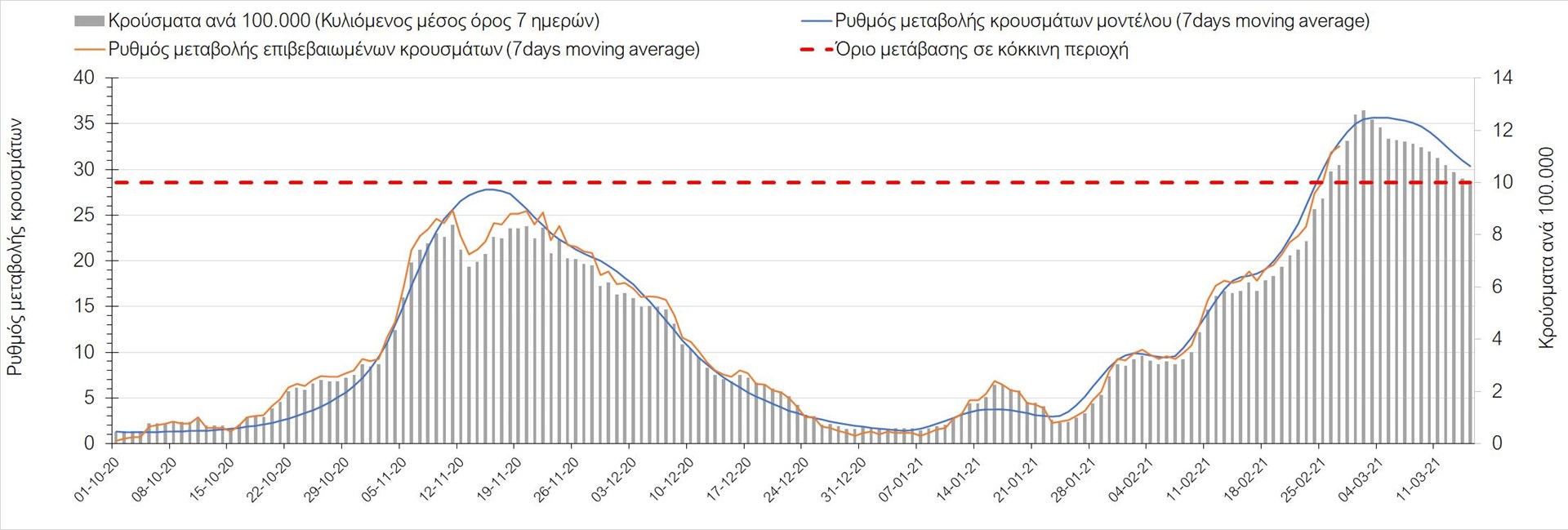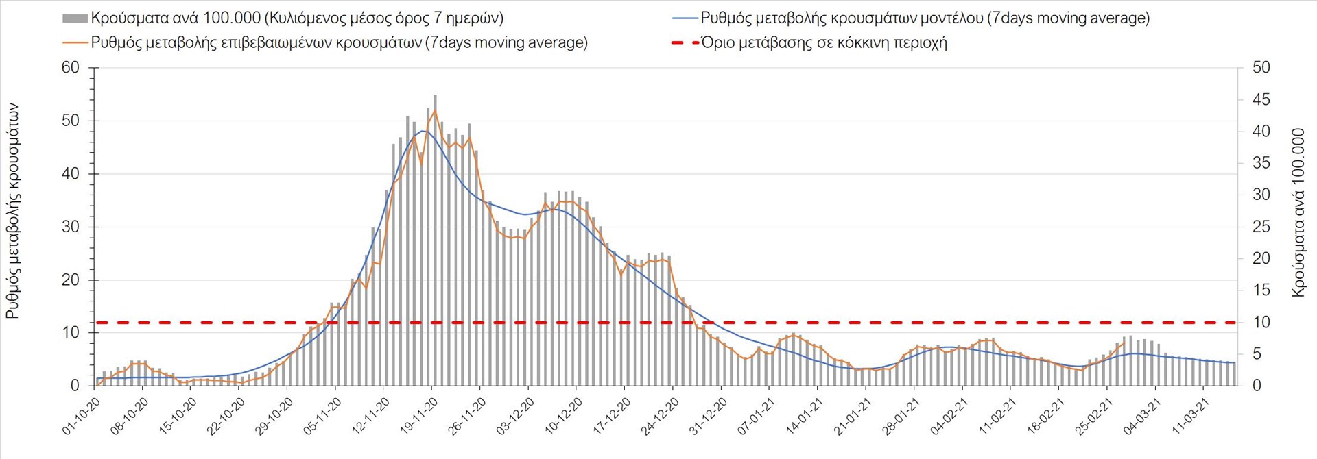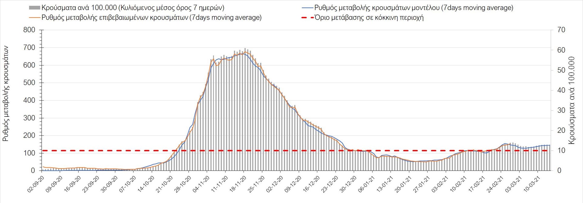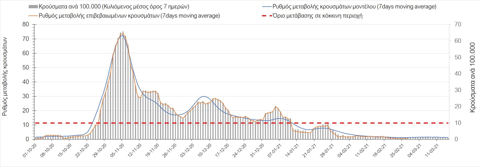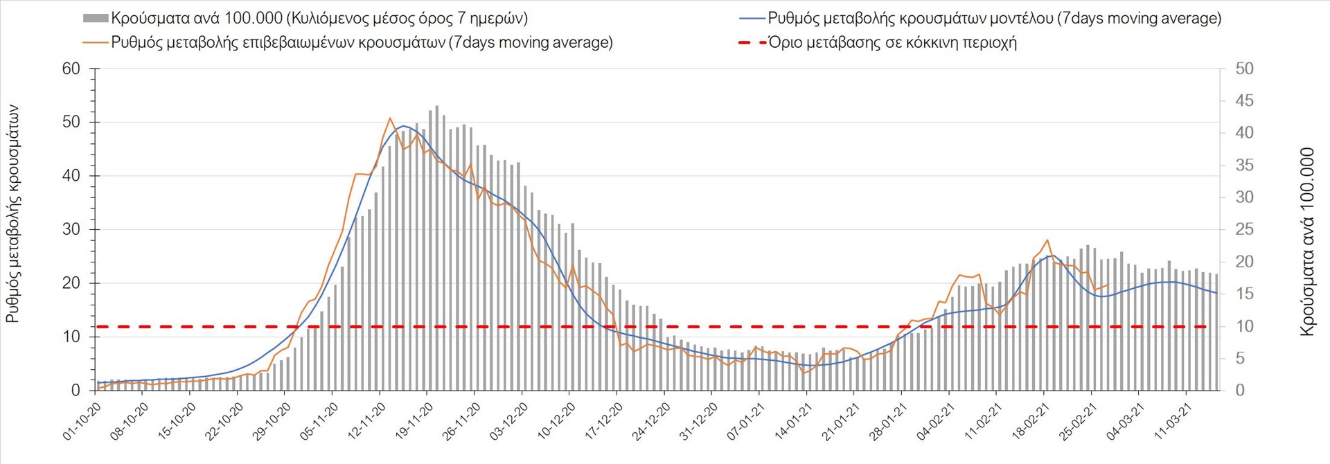 Mε βάση τα δεδομένα αυτής της εβδομάδας, καλώς εφαρμόσθηκαν τα περιοριστικά μέτρα που ισχύουν από τις 6 Φεβρουαρίου, τα οποία ίσως χρειαστούν επιπλέον αναθεώρηση, με βάση την επιδημιολογική εικόνα που θα επικρατήσει, ενώ επίσης καλώς εφαρμόσθηκε το lockdown μέχρι τις 28 Φεβρουαρίου στην Αθήνα, το οποίο προτείνεται να παραταθεί τουλάχιστον μέχρι τις 14 Μαρτίου. Με τα μέχρι τώρα δεδομένα, τα μέτρα αυτά δεν φαίνονται να είναι ικανά να αναχαιτίσουν προσωρινά την επέλαση ενός τρίτου κύματος, εν αναμονή και επιπλέον στοιχείων, τόσο για τη μεταδοτικότητα του στελέχους B.1.1.7. του SARS-CoV-2, όσο και της διασποράς του στην κοινότητα.