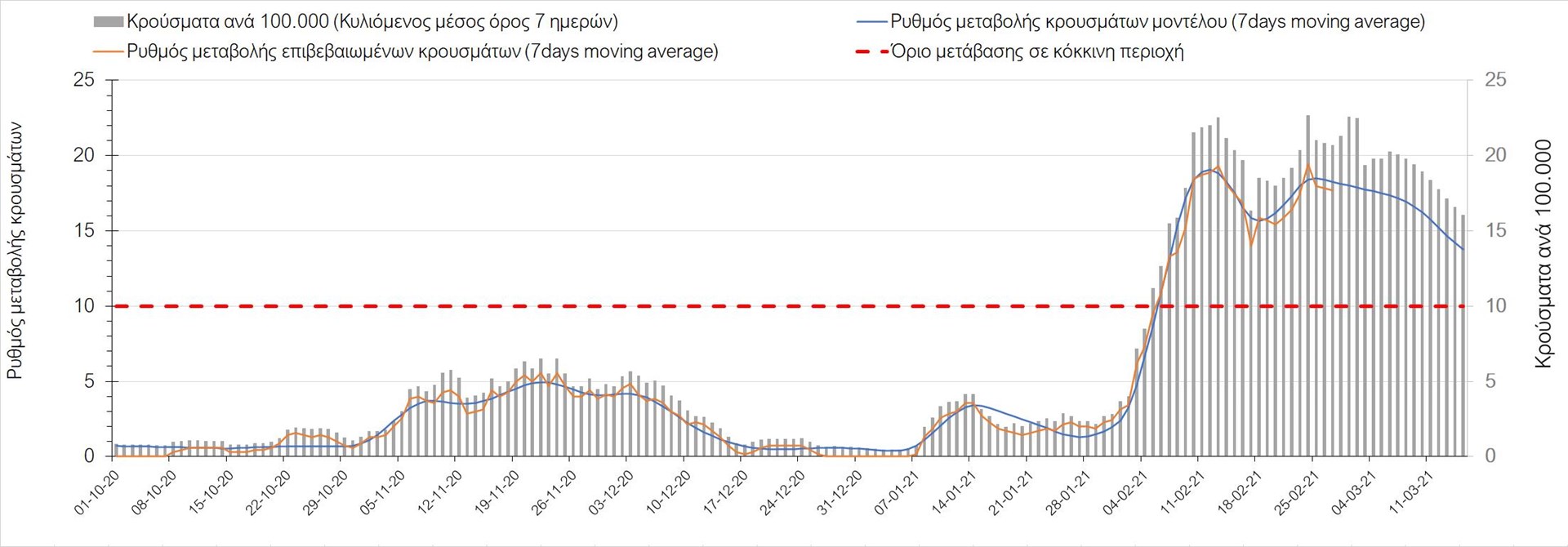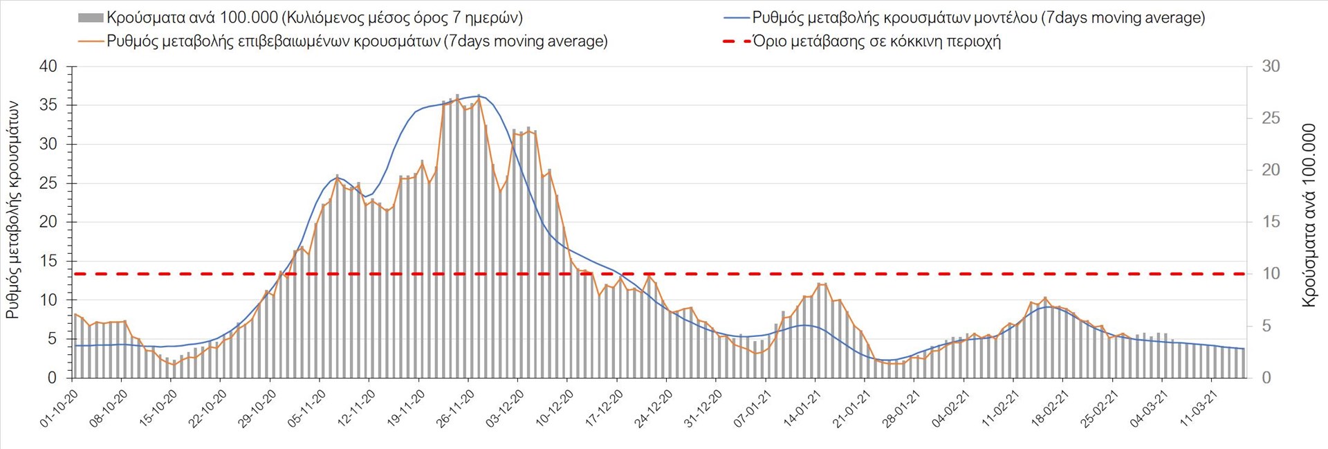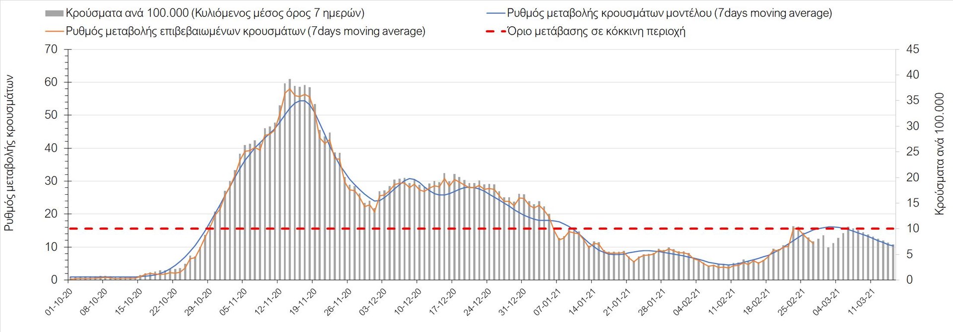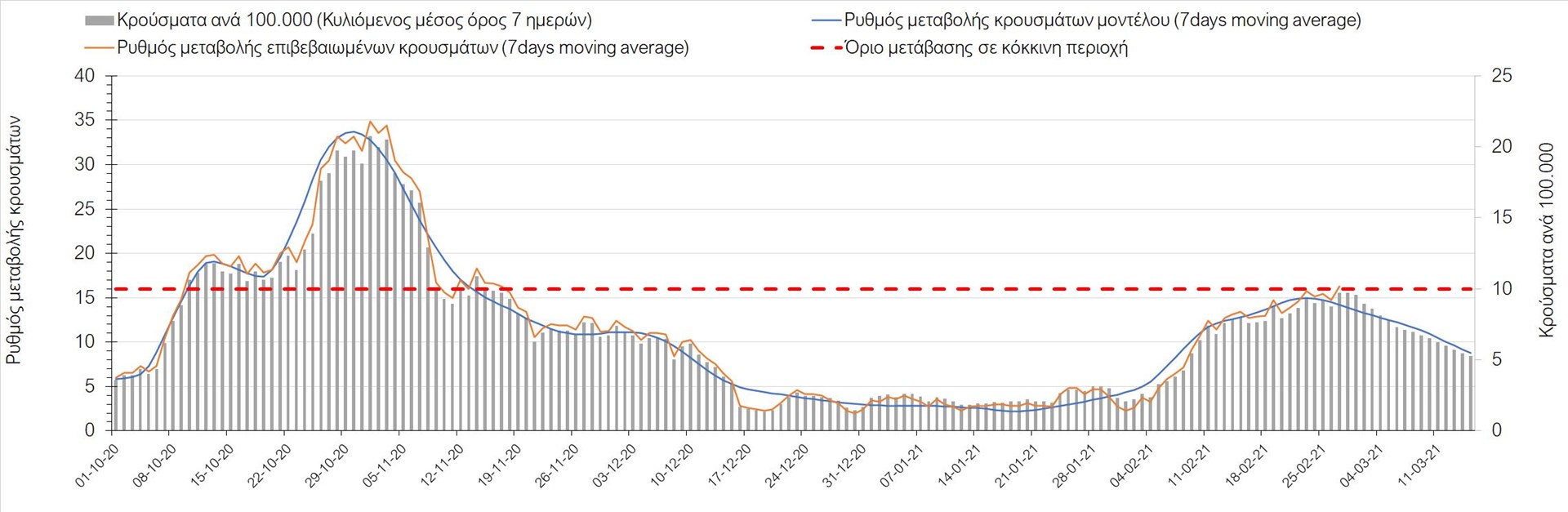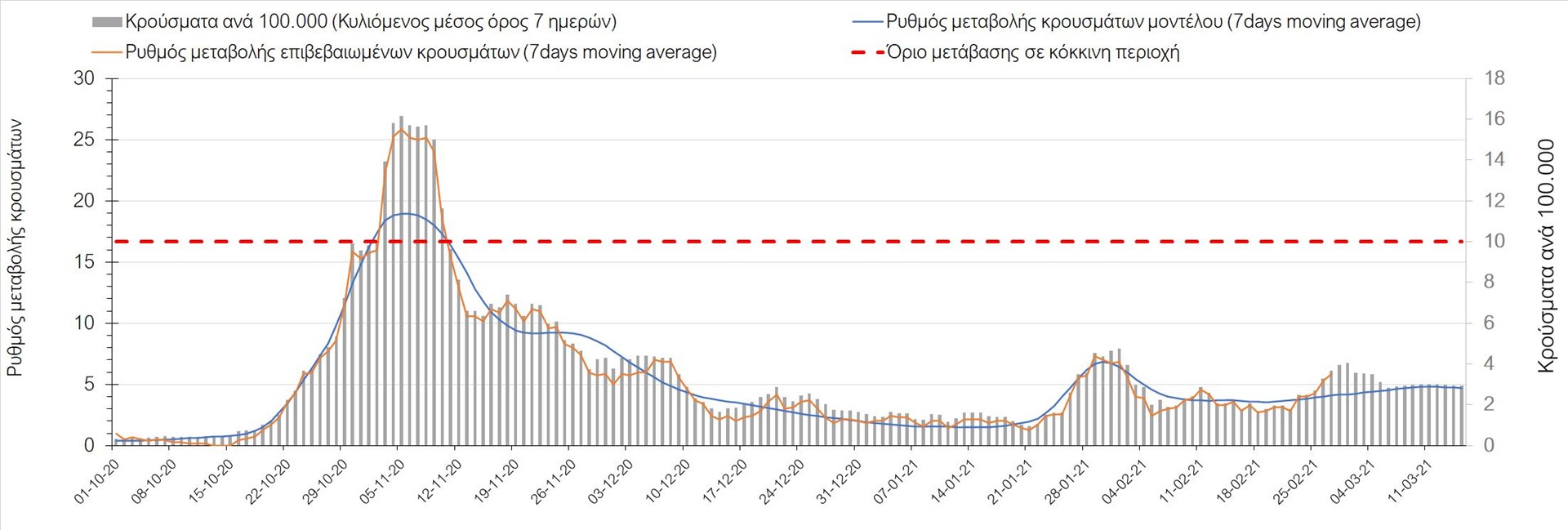 Mε βάση τα δεδομένα αυτής της εβδομάδας, καλώς εφαρμόσθηκαν τα περιοριστικά μέτρα που ισχύουν από τις 6 Φεβρουαρίου, τα οποία ίσως χρειαστούν επιπλέον αναθεώρηση, με βάση την επιδημιολογική εικόνα που θα επικρατήσει, ενώ επίσης καλώς εφαρμόσθηκε το lockdown μέχρι τις 28 Φεβρουαρίου στην Αθήνα, το οποίο προτείνεται να παραταθεί τουλάχιστον μέχρι τις 14 Μαρτίου. Με τα μέχρι τώρα δεδομένα, τα μέτρα αυτά δεν φαίνονται να είναι ικανά να αναχαιτίσουν προσωρινά την επέλαση ενός τρίτου κύματος, εν αναμονή και επιπλέον στοιχείων, τόσο για τη μεταδοτικότητα του στελέχους B.1.1.7. του SARS-CoV-2, όσο και της διασποράς του στην κοινότητα.