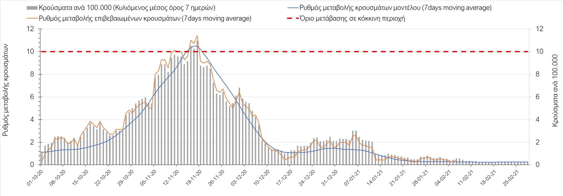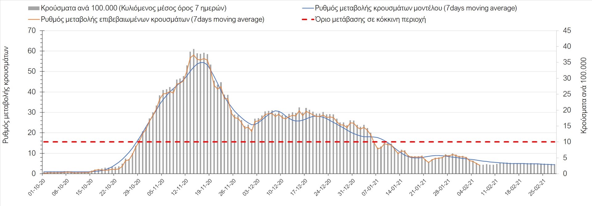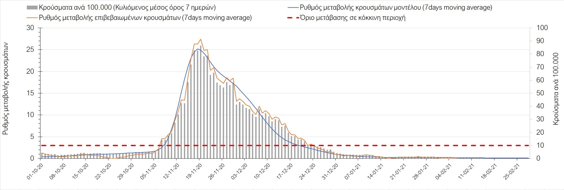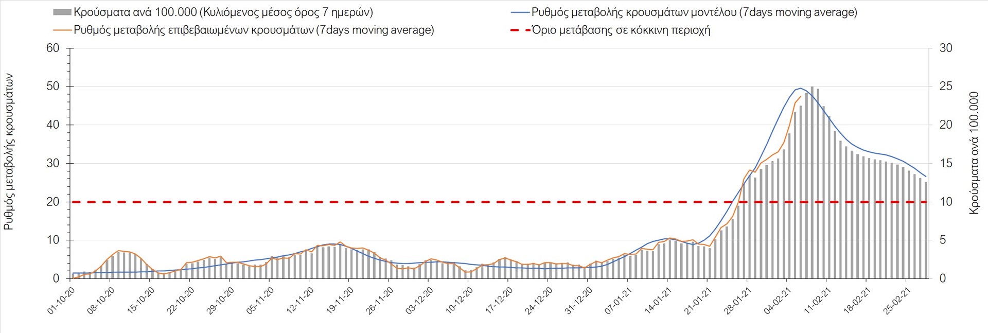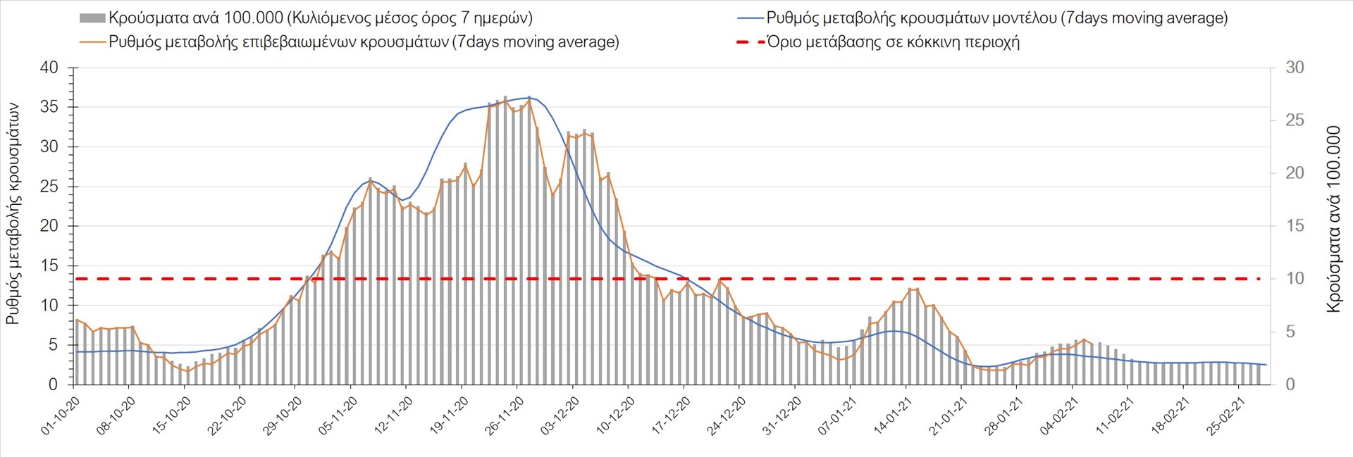 Σχήμα 39. Πορεία του ημερησίου αριθμού των κρουσμάτων (κυλιόμενος μέσος όρος 7 ημερών) στην ΘάσοΣυμπεράσματα:Η αποκλιμάκωση που παρατηρείται στον αριθμό των ασθενών σε κρίσιμη κατάσταση (διασωληνωμένοι σε ΜΕΘ), καθώς και ο αριθμός των θανάτων συνάδουν που παρατηρήθηκαν το Σάββατο συνάδουν με τις προσομοιώσεις του μοντέλου CORE για τον επόμενο μήνα, ενώ πλέον και ο αριθμός των νέων κρουσμάτων παραμένει ανησυχητικός, ιδιαίτερα για την Αττική. Τα παραπάνω αποτελέσματα αποτυπώνονται και στο δείκτη θετικότητας (παρά τον μεγάλο αριθμό τεστ ανίχνευσης που πραγματοποιήθηκε). Σε πανελλαδικό επίπεδο ο κυλιόμενος εβδομαδιαίος μέσος όρος του δείκτη θετικότητας παρέμεινε σταθερός στο 3,2% (η ημερήσια τιμή το Σάββατο είναι 2,4%) ενώ ο κυλιόμενος εβδομαδιαίος μέσος όρος του πραγματικού αριθμού αναπαραγωγής Rt (δηλαδή ο αριθμός των ατόμων που ένας φορέας μπορεί να επιμολύνει) είναι πλέον 1,34 (τιμές του Rt πάνω από τη μονάδα υποδηλώνουν καθαρή αύξηση της διασποράς του ιού στην κοινότητα). Οι τιμές αυτές δείχνουν ότι αν και καλώς εφαρμόσθηκε το γενικευμένο lockdown της 3ης Ιανουαρίου, έτσι ώστε να αποσβεσθούν όποιες αποκλίσεις στην εφαρμογή των μέτρων υπήρξαν κατά την περίοδο των εορτών, δημιουργώντας θετικές προοπτικές στο σταδιακό άνοιγμα της οικονομίας που ξεκίνησε από τη Δευτέρα 18 Ιανουαρίου, ιδιαίτερη προσοχή πρέπει να δοθεί διότι όπως είχαμε επισημάνει από το προηγούμενο Σαββατοκύριακο, τα αποτελέσματα των τελευταίων ημερών, δείχνουν ότι σε πανελλαδικό επίπεδο υπάρχει συνολικά αύξηση, η οποία φάνηκε πολύ έντονα το Σάββατο, δημιουργώντας ανησυχία τόσο για την πορεία της πανδημίας, όσο και για την πραγματική εξάπλωση του στελέχους B.1.1.7. του SARS-CoV-2 στην κοινότητα. Αναμένουμε λοιπόν τα αποτελέσματα των επομένων ημερών, όπου ο αριθμός των τεστ ανίχνευσης θα παραμείνει στα συνήθη επίπεδα (άνω των 30.000 ανά ημέρα), και ελπίζουμε να συνεχίσει στα επίπεδα των τελευταίων ημερών, δηλαδή άνω των 45.000, και να συνεχίσει να αυξάνει άμεσα, φτάνοντας τα 80.000-100.000 τεστ ημερησίως. Επιπλέον, με βάση τα δεδομένα αυτής της εβδομάδας, καλώς εφαρμόσθηκαν τα περιοριστικά μέτρα που ισχύουν από το Σάββατο, τα οποία ίσως χρειαστούν επιπλέον αναθεώρηση, με βάση την επιδημιολογική εικόνα που θα επικρατήσει. Με τα μέχρι τώρα δεδομένα, φαίνονται να είναι ικανά να αναχαιτίσουν προσωρινά την επέλαση ενός τρίτου κύματος, εν αναμονή και επιπλέον στοιχείων για τη μεταδοτικότητα του στελέχους B.1.1.7. του SARS-CoV-2, όσο και της διασποράς του στην κοινότητα.Παρά την εφαρμογή οριζοντίων μέτρων ανάσχεσης της πανδημίας που εφαρμόσθηκαν από τα τέλη Οκτωβρίου, η πορεία της τελευταίας διαφοροποιείται από περιοχή σε περιοχή. Οι παραπάνω παρατηρήσεις τείνουν στο συμπέρασμα ότι η διαχείριση του υγειονομικού κινδύνου θα πρέπει να εξεταστεί σε τοπικό επίπεδο από τη στιγμή που συνολικά στη χώρα φαίνεται να έχουμε ξεπεράσει την κορύφωση του συγκεκριμένου επιδημικού κύματος του Νοεμβρίου. Παρόλα αυτά, συνιστάται προσεκτική μελέτη των αποτελεσμάτων των επόμενων ημερών, λόγω του ανοίγματος των δημοτικών σχολείων και από αυτή την εβδομάδα και του λιανικού εμπορίου. Με βάση τη συνολική εικόνα που έχει διαμορφωθεί, έχουμε εντελώς διαφορετική κατανομή στο χάρτη των κρουσμάτων, και πλέον μεγαλύτερη ανησυχία, εγείρουν οι τάσεις που παρατηρούνται στην Κεντρική Ελλάδα. Ενώ δηλαδή, τόσο η Θεσσαλονίκη, όσο και οι ά