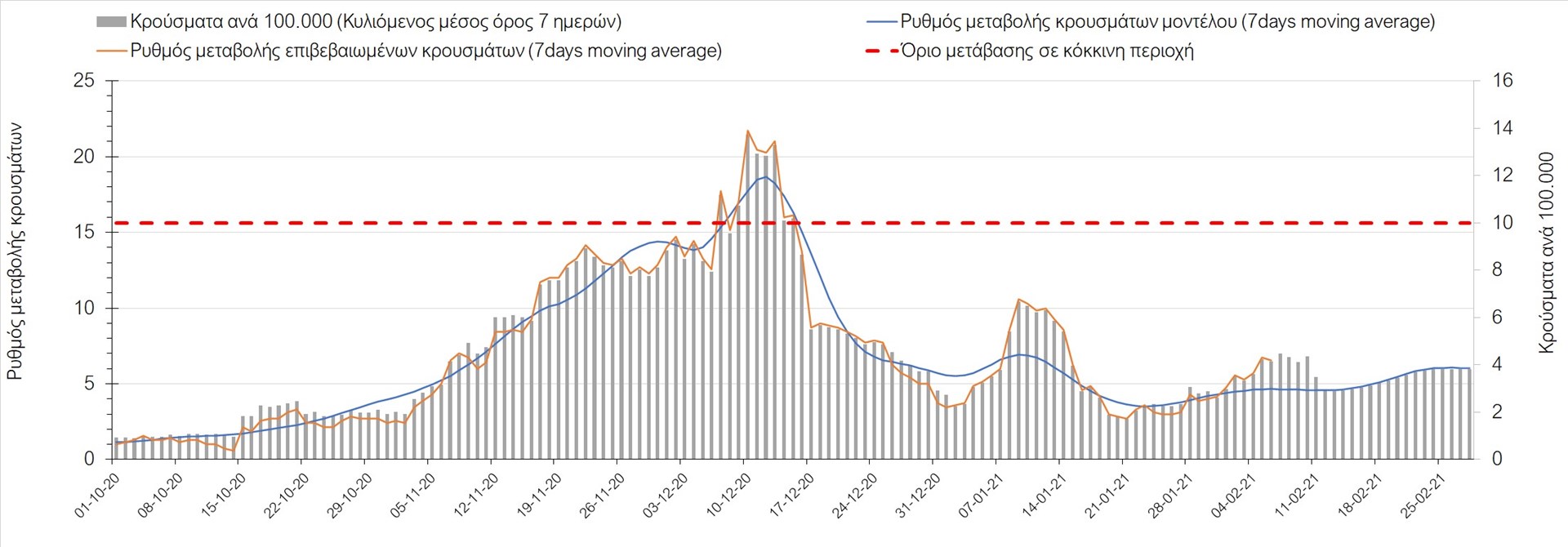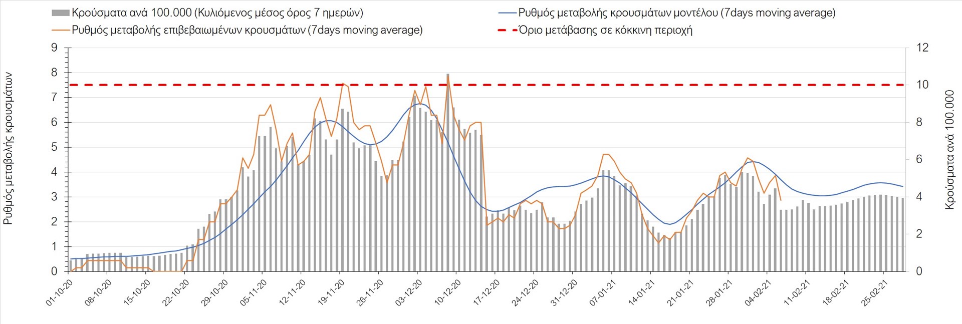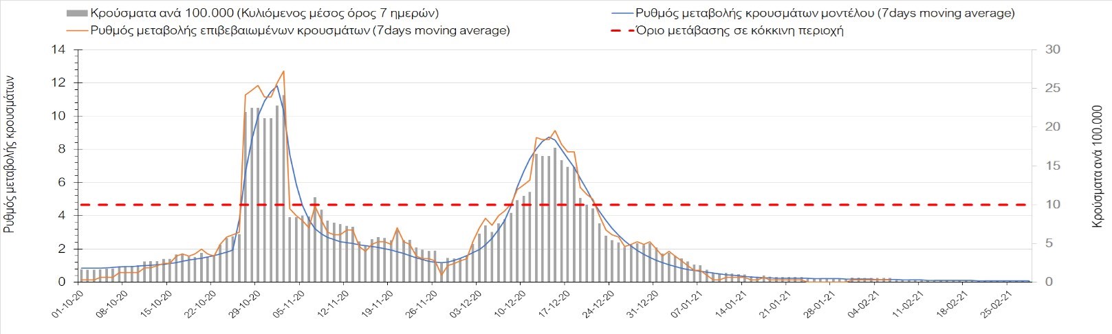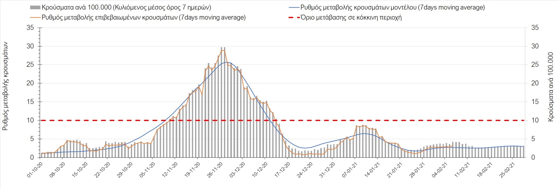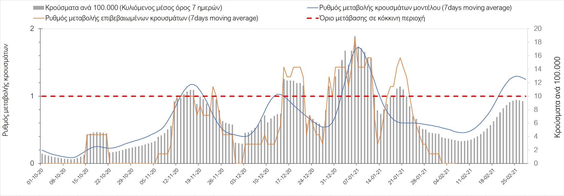 Σχήμα 39. Πορεία του ημερησίου αριθμού των κρουσμάτων (κυλιόμενος μέσος όρος 7 ημερών) στην ΘάσοΣυμπεράσματα:Η αποκλιμάκωση που παρατηρείται στον αριθμό των ασθενών σε κρίσιμη κατάσταση (διασωληνωμένοι σε ΜΕΘ), καθώς και ο αριθμός των θανάτων συνάδουν που παρατηρήθηκαν το Σάββατο συνάδουν με τις προσομοιώσεις του μοντέλου CORE για τον επόμενο μήνα, ενώ πλέον και ο αριθμός των νέων κρουσμάτων παραμένει ανησυχητικός, ιδιαίτερα για την Αττική. Τα παραπάνω αποτελέσματα αποτυπώνονται και στο δείκτη θετικότητας (παρά τον μεγάλο αριθμό τεστ ανίχνευσης που πραγματοποιήθηκε). Σε πανελλαδικό επίπεδο ο κυλιόμενος εβδομαδιαίος μέσος όρος του δείκτη θετικότητας παρέμεινε σταθερός στο 3,2% (η ημερήσια τιμή το Σάββατο είναι 2,4%) ενώ ο κυλιόμενος εβδομαδιαίος μέσος όρος του πραγματικού αριθμού αναπαραγωγής Rt (δηλαδή ο αριθμός των ατόμων που ένας φορέας μπορεί να επιμολύνει) είναι πλέον 1,34 (τιμές του Rt πάνω από τη μονάδα υποδηλώνουν καθαρή αύξηση της διασποράς του ιού στην κοινότητα). Οι τιμές αυτές δείχνουν ότι αν και καλώς εφαρμόσθηκε το γενικευμένο lockdown της 3ης Ιανουαρίου, έτσι ώστε να αποσβεσθούν όποιες αποκλίσεις στην εφαρμογή των μέτρων υπήρξαν κατά την περίοδο των εορτών, δημιουργώντας θετικές προοπτικές στο σταδιακό άνοιγμα της οικονομίας που ξεκίνησε από τη Δευτέρα 18 Ιανουαρίου, ιδιαίτερη προσοχή πρέπει να δοθεί διότι όπως είχαμε επισημάνει από το προηγούμενο Σαββατοκύριακο, τα αποτελέσματα των τελευταίων ημερών, δείχνουν ότι σε πανελλαδικό επίπεδο υπάρχει συνολικά αύξηση, η οποία φάνηκε πολύ έντονα το Σάββατο, δημιουργώντας ανησυχία τόσο για την πορεία της πανδημίας, όσο και για την πραγματική εξάπλωση του στελέχους B.1.1.7. του SARS-CoV-2 στην κοινότητα. Αναμένουμε λοιπόν τα αποτελέσματα των επομένων ημερών, όπου ο αριθμός των τεστ ανίχνευσης θα παραμείνει στα συνήθη επίπεδα (άνω των 30.000 ανά ημέρα), και ελπίζουμε να συνεχίσει στα επίπεδα των τελευταίων ημερών, δηλαδή άνω των 45.000, και να συνεχίσει να αυξάνει άμεσα, φτάνοντας τα 80.000-100.000 τεστ ημερησίως. Επιπλέον, με βάση τα δεδομένα αυτής της εβδομάδας, καλώς εφαρμόσθηκαν τα περιοριστικά μέτρα που ισχύουν από το Σάββατο, τα οποία ίσως χρειαστούν επιπλέον αναθεώρηση, με βάση την επιδημιολογική εικόνα που θα επικρατήσει. Με τα μέχρι τώρα δεδομένα, φαίνονται να είναι ικανά να αναχαιτίσουν προσωρινά την επέλαση ενός τρίτου κύματος, εν αναμονή και επιπλέον στοιχείων για τη μεταδοτικότητα του στελέχους B.1.1.7. του SARS-CoV-2, όσο και της διασποράς του στην κοινότητα.Παρά την εφαρμογή οριζοντίων μέτρων ανάσχεσης της πανδημίας που εφαρμόσθηκαν από τα τέλη Οκτωβρίου, η πορεία της τελευταίας διαφοροποιείται από περιοχή σε περιοχή. Οι παραπάνω παρατηρήσεις τείνουν στο συμπέρασμα ότι η διαχείριση του υγειονομικού κινδύνου θα πρέπει να εξεταστεί σε τοπικό επίπεδο από τη στιγμή που συνολικά στη χώρα φαίνεται να έχουμε ξεπεράσει την κορύφωση του συγκεκριμένου επιδημικού κύματος του Νοεμβρίου. Παρόλα αυτά, συνιστάται προσεκτική μελέτη των αποτελεσμάτων των επόμενων ημερών, λόγω του ανοίγματος των δημοτικών σχολείων και από αυτή την εβδομάδα και του λιανικού εμπορίου. Με βάση τη συνολική εικόνα που έχει διαμορφωθεί, έχουμε εντελώς διαφορετική κατανομή στο χάρτη των κρουσμάτων, και πλέον μεγαλύτερη ανησυχία, εγείρουν οι τάσεις που παρατηρούνται στην Κεντρική Ελλάδα. Ενώ δηλαδή, τόσο η Θεσσαλονίκη, όσο και οι ά