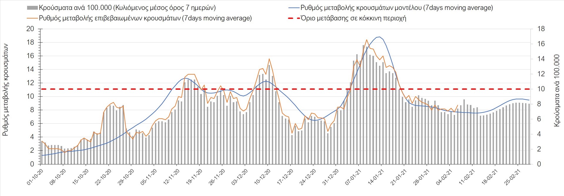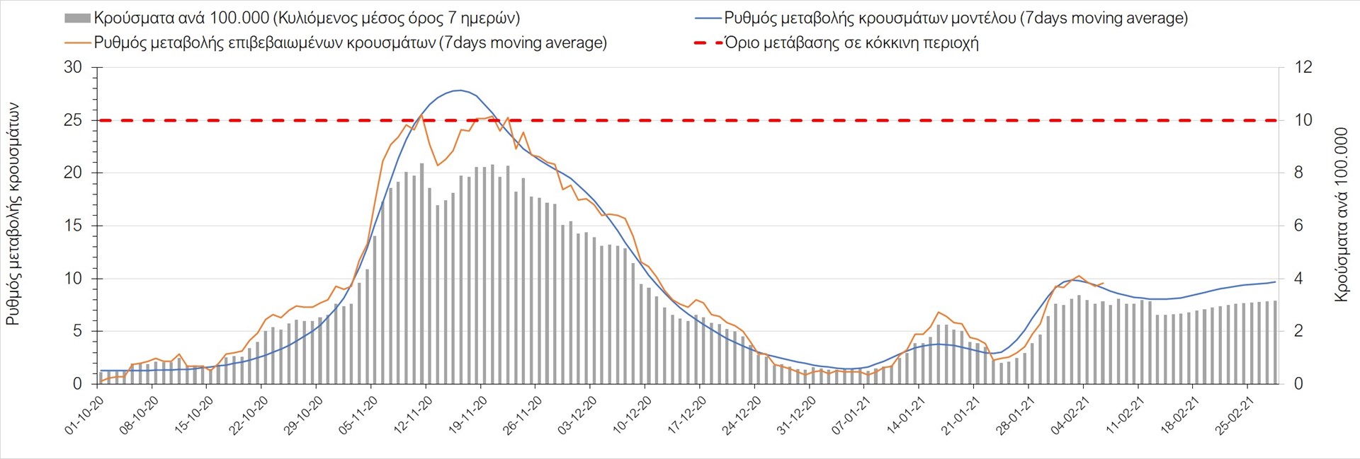Σχήμα 2. Αριθμός θανάτων (κυλιόμενος μέσος όρος 7 ημερών) σύμφωνα με τα στοιχεία του ΕΟΔΥ και τις προβλέψεις της υπολογιστικής πλατφόρμας CORE.Και στις δύο περιπτώσεις φαίνεται ότι πλέον ξεπερνάμε τη φάση της αποκλιμάκωσης (βλέπε σχήματα 1 και 2) και εισερχόμαστε σε νέα ανοδική τροχιά. Η πορεία της μέσης εβδομαδιαίας τιμής των κρουσμάτων, καθώς και του κυλιόμενου μέσου όρου 7 ημερών του αριθμού των κρουσμάτων ανά 100.000 πληθυσμού, όπως έχουν καταγραφεί από τον ΕΟΔΥ και η αναμενόμενη πορεία τους όπως προδιαγράφεται από την υπολογιστική πλατφόρμα CORE για την Ελληνική επικράτεια μέχρι το τέλος του Ιανουαρίου, αποτυπώνονται στο Σχήμα 3. Η ανάλυσή μας έχει επικαιροποιηθεί με βάση την απόφαση εφαρμογής αυστηρού lockdown από την Κυριακή 3 Ιανουαρίου μέχρι και τις 17 Ιανουαρίου. Στις 11 Ιανουαρίου λάβαμε υπόψη το άνοιγμα της πρωτοβάθμιας εκπαίδευσης, ενώ το άνοιγμα των βιβλιοπωλείων, κομμωτηρίων, λιανικού εμπορίου και των εμπορικών καταστημάτων από τη Δευτέρα 18/1, ενώ επιπλέον, έχει ληφθεί υπόψη το άνοιγμα τις δευτεροβάθμιας εκπαίδευσης από τη Δευτέρα 1 Φεβρουαρίου στις κίτρινες περιοχές. Στις κόκκινες περιοχές, από τη Δευτέρα 1 Φεβρουαρίου έχει γίνει άνοιγμα μόνο των Γυμνασίων (και συνεχίζεται το καθεστώς τηλε-εκπαίδευση για τα Λύκεια), στις οποίες επίσης, η λειτουργία του λιανεμπορίου θα πραγματοποιείται με τη μέθοδο click away, και η λειτουργία καταστημάτων ένδυσης, υπόδησης, βιβλιοπωλείων, κομμωτηρίων και καταστημάτων προσωπικής περιποίησης με προκαθορισμένο ραντεβού (click-in-a-shop) και με 1 άτομο ανά 25 τ.μ. Από το Σάββατο, έχουν ληφθεί υπόψιν τα περιοριστικά μέτρα που ανακοινώθηκαν την Παρασκευή (5 Φεβρουαρίου) για Αθήνα, Θεσσαλονίκη, Πάτρα, Χαλκίδα και Χαλκιδική και που τέθηκαν σε ισχύ από το Σάββατο 6 Φεβρουαρίου και μέχρι τη Δευτέρα 15 Φεβρουαρίου (εν αναμονή περαιτέρω ανακοινώσεων). Όπως φαίνεται από το διάγραμμα, από τις 8 Ιανουαρίου έχουμε μια αύξηση κρουσμάτων μέχρι τις 11 Ιανουαρίου η οποία οφείλεται στη μείωση της περιστολής που σημειώθηκε στις γιορτές. Από τις 11 μέχρι τις 18 Ιανουαρίου προβλεπόταν μια μείωση κρουσμάτων λόγω της εφαρμογής του lockdown και η οποία όντως παρατηρήθηκε. Εντούτοις, όπως είχαμε προβλέψει, από τις 23 Ιανουαρίου και έπειτα διαφαίνεται αύξηση στον κυλιόμενο μέσο όρο των κρουσμάτων. Η εφαρμογή των περιοριστικών μέτρων, σε συνδυασμό με την επικρατούσα μετεωρολογία πρόκειται να επιφέρει μια σταθεροποίηση ή και ελαφρά μείωση των κρουσμάτων τις επόμενες ημέρες. Παρ’ολ’αυτά, μετά από τις 17/2 προβλέπεται μια περαιτέρω αύξηση των κρουσμάτων.