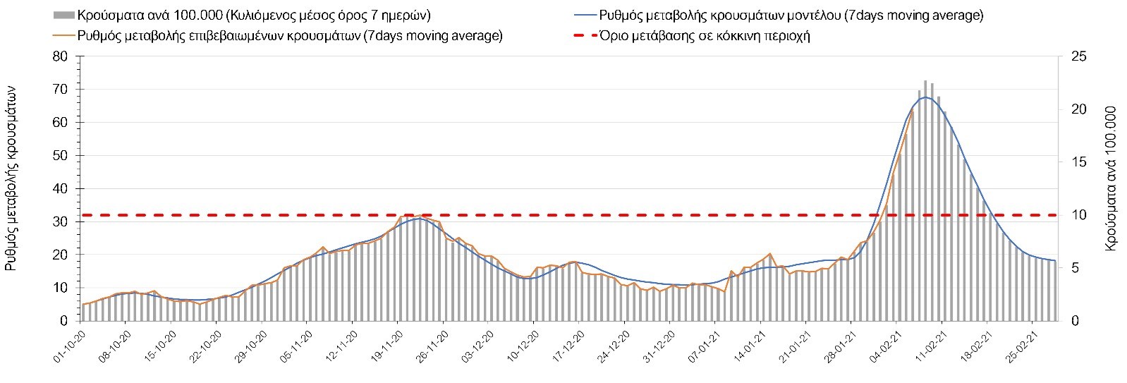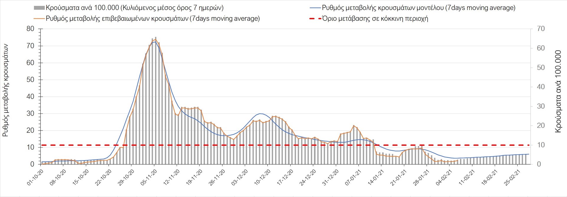 Σχήμα 26. Πορεία του ημερησίου αριθμού των κρουσμάτων (κυλιόμενος μέσος όρος 7 ημερών) στην Πιερία