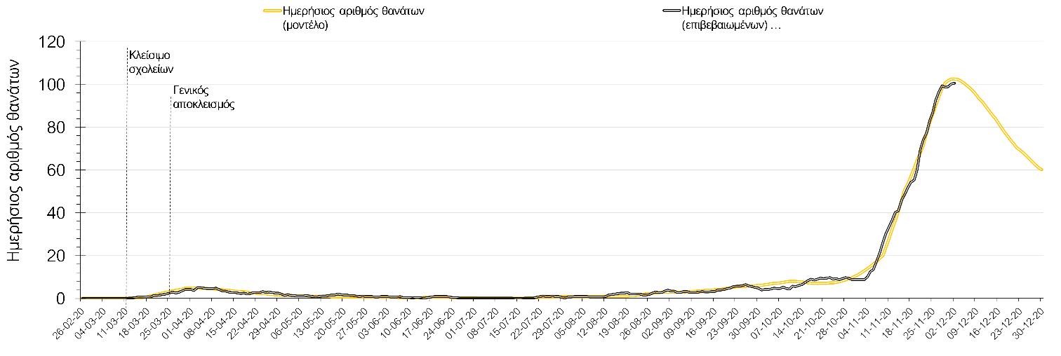 Ο αριθμός των θανάτων (89) παρέμεινε σε υψηλά επίπεδα, υποδηλώνοντας ότι μέχρι και πριν 2 εβδομάδες, ο ρυθμός μετάδοσης της νόσου ήταν υψηλός, λόγω της πλημμελούς εφαρμογής του lockdown τις πρώτες 10 ημέρες της εφαρμογής του και από τη συνέχιση της λειτουργίας των Δημοτικών σχολείων και την γενικότερα αυξημένη κοινωνική κινητικότητα των γονέων που συνάδει με τη συνοδεία των νεαρών παιδιών από και προς το σχολείο σε συνδυασμό με την χαμηλή εφαρμογή της τηλεργασίας, η οποία αυξάνει περαιτέρω την πιθανότητα μετάδοσης του SARS-CoV-2 από τους εργαζόμενους ενήλικες. Ο υψηλός αριθμός των θανάτων σε συνδυασμό με την παρατηρούμενη μείωση των επιβεβαιωμένων κρουσμάτων σε σχέση με την προηγούμενη εβδομάδα μπορεί να ερμηνευθεί από το γεγονός ότι έγινε πιο συνεπής εφαρμογή του lockdown μετά τις 17-18 Νοεμβρίου, περίπου 10 μέρες μετά την ανακοίνωση του. Αυτή η πιθανή ανάσχεση της πτωτικής πορείας στο σύνολο της χώρας πιθανότατα οφείλεται στην κακή πορεία σε επιμέρους περιοχές, όπως η Δράμα (70 κρούσματα σήμερα), η Καβάλα (65 κρούσματα σήμερα), η Ημαθία (86 κρούσματα σήμερα), η Πέλλα (115 κρούσματα σήμερα), η Φλώρινα (46 κρούσματα σήμερα), η Ξάνθη (59 κρούσματα σήμερα) και η Μαγνησία (45 κρούσματα σήμερα).