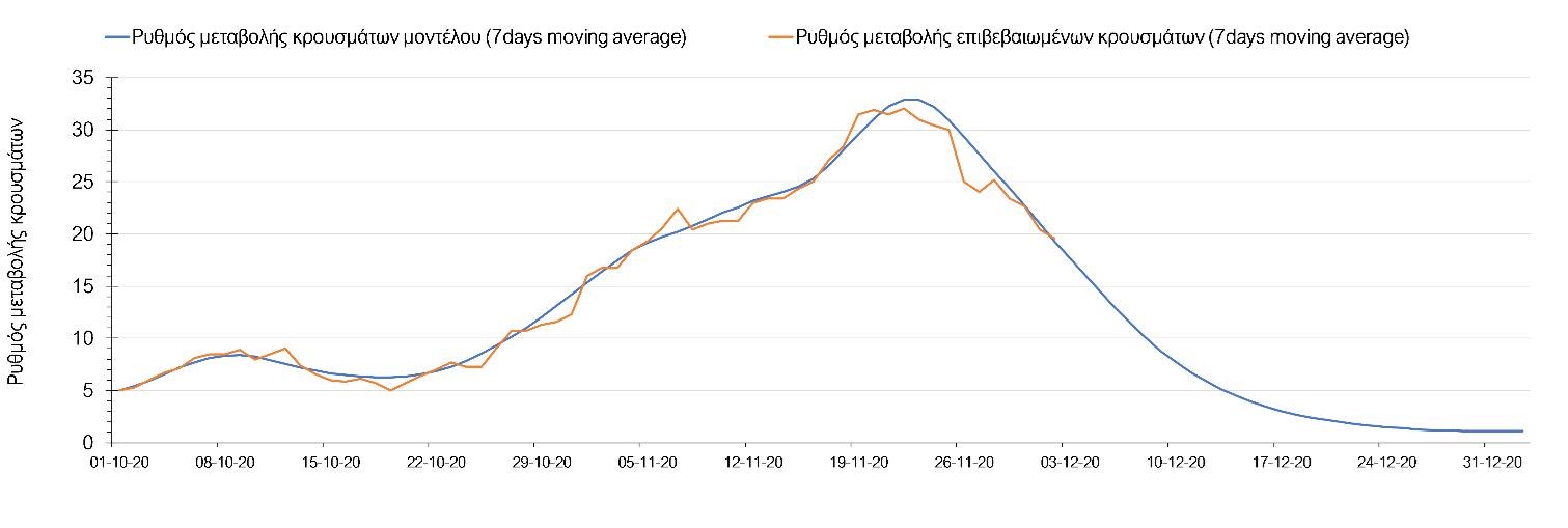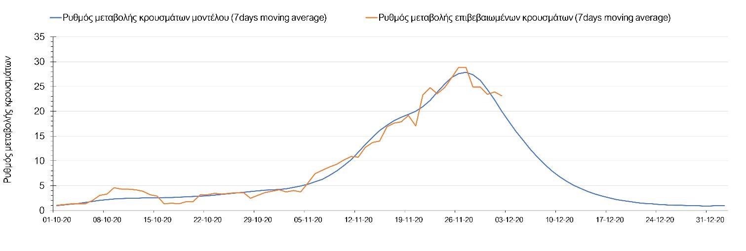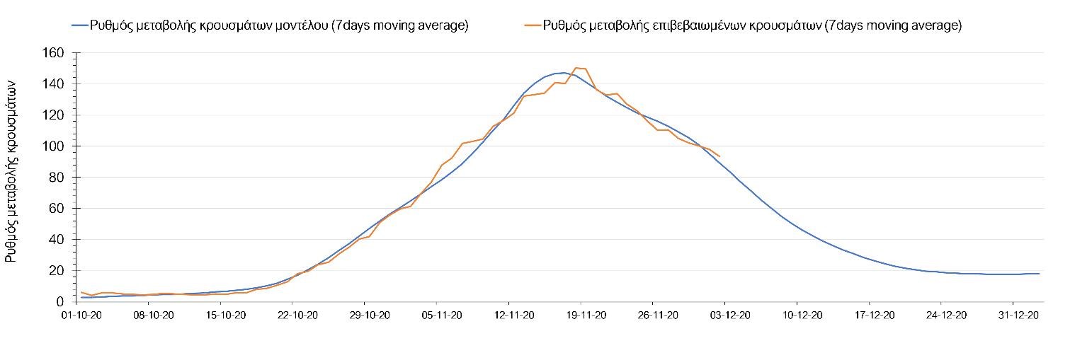 Η πορεία της μέσης εβδομαδιαίας τιμής των κρουσμάτων όπως έχουν καταγραφεί από τον ΕΟΔΥ και η αναμενόμενη πορεία αυτών στην περίπτωση ανοίγματος των εμπορικών καταστημάτων στις 14 Δεκεμβρίου όπως προδιαγράφεται από την υπολογιστική πλατφόρμα CORE για την Ελληνική επικράτεια, αποτυπώνονται στο Σχήμα 3 . Όπως διαφαίνεται από την πορτοκαλί γραμμή (κυλιόμενος εβδομαδιαίος μέσος όρος των επιβεβαιωμένων κρουσμάτων), υπάρχει μια μικρή ανάσχεση της πτωτικής πορείας, η οποία εάν συνεχισθεί θα μας οδηγήσει σε επαναϋπολογισμό της πορείας της πανδημίας, λαμβάνοντας υπόψιν την πραγματική μείωση των επαφών όπως αυτή υπαγορεύεται από τα ισχύοντα περιοριστικά μέτρα, αλλά και το βαθμό που αυτή πραγματοποιείτε από τους πολίτες. Αυτή η επιβράδυνση της πτώσης μπορεί να συνδέεται με συγκεκριμένες συρροές στην Αθήνα και τη Θεσσαλονίκη αντίστοιχα.