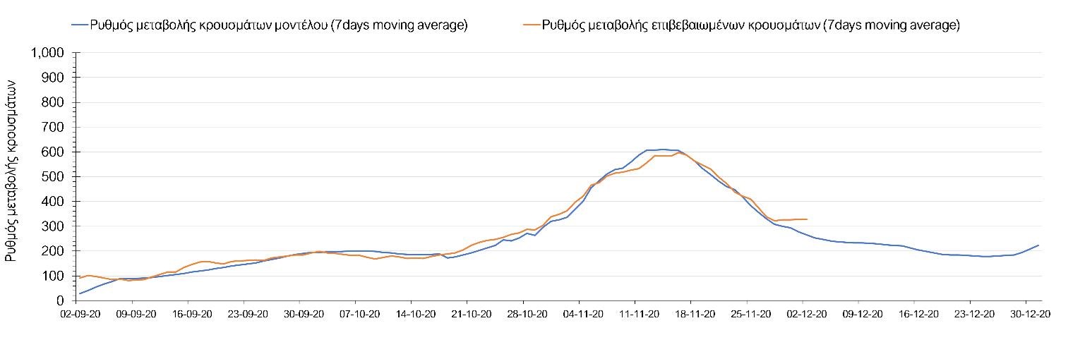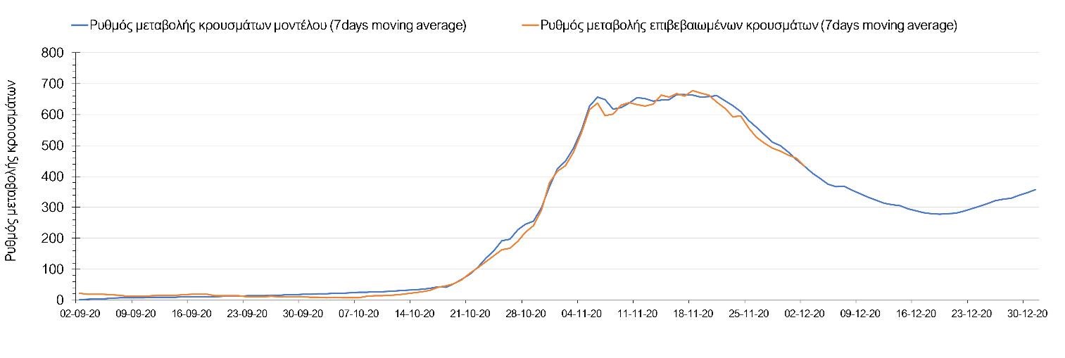 Σχήμα 3. Πορεία του ημερησίου αριθμού των κρουσμάτων (κυλιόμενος μέσος όρος 7 ημερών) στην Ελληνική επικράτεια
