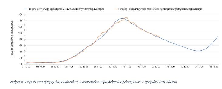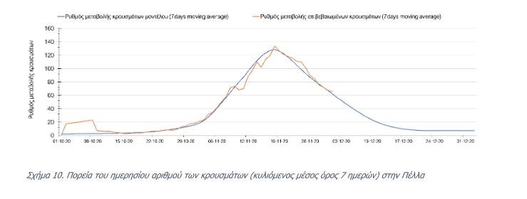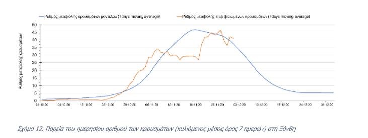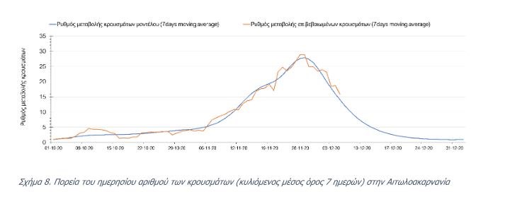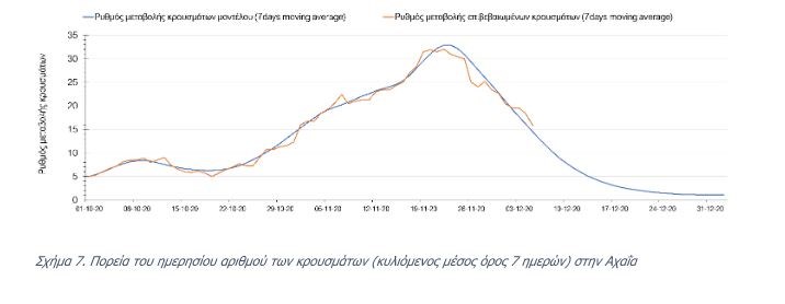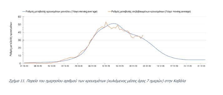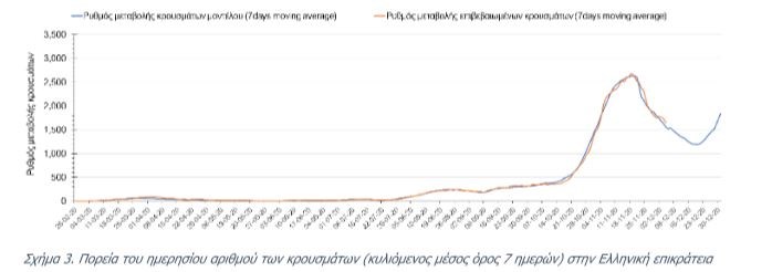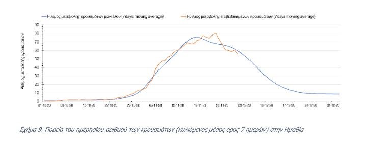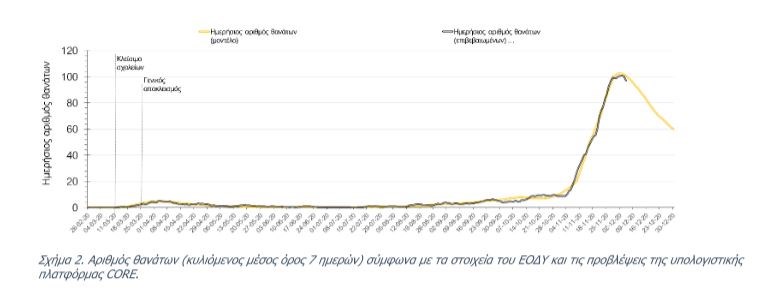 Σήμερα ο αριθμός των θανάτων (97) παρέμεινε στα αναμενόμενα υψηλά επίπεδα, υποδηλώνοντας ότι μέχρι και πριν 2 εβδομάδες, ο ρυθμός μετάδοσης της νόσου ήταν υψηλός, λόγω της πλημμελούς εφαρμογής του lockdown τις πρώτες 15 ημέρες της εφαρμογής του και από τη συνέχιση της λειτουργίας των Δημοτικών σχολείων και την γενικότερα αυξημένη κοινωνική κινητικότητα των γονέων που συνάδει με τη συνοδεία των νεαρών παιδιών από και προς το σχολείο σε συνδυασμό με την χαμηλή εφαρμογή της τηλεργασίας, η οποία αυξάνει περαιτέρω την πιθανότητα μετάδοσης του SARS-CoV-2 από τους εργαζόμενους ενήλικες. Ο υψηλός αριθμός των θανάτων σε συνδυασμό με την παρατηρούμενη μείωση των επιβεβαιωμένων κρουσμάτων σε σχέση με την προηγούμενη εβδομάδα μπορεί να ερμηνευθεί από το γεγονός ότι έγινε πιο συνεπής εφαρμογή του lockdown μετά τις 17-18 Νοεμβρίου, περίπου 10 μέρες μετά την ανακοίνωση του. O ρυθμός αύξησης των θανάτων έχει αρχίσει να κάμπτεται, και σήμερα είναι η πρώτη μέρα που αλλάζει η κλίση της καμπύλης του κυλιόμενου μέσου όρου των 7 ημερών ( Σχήμα 2 ), γεγονός που συνάδει και με τις προβλέψεις του μοντέλου. Εντούτοις, παρόλο που τα σημερινά μηνύματα για το σύνολο της χώρας είναι αισιόδοξα, σε συγκεκριμένες περιοχές όπως η Ημαθία (42 κρούσματα σήμερα), η Πέλλα (58 κρούσματα σήμερα), η Ξάνθη (44 κρούσματα σήμερα), η Καρδίτσα (43 κρούσματα σήμερα) και το Κιλκίς (40 κρούσματα σήμερα) δεν ακολουθείται η ίδια πορεία και άρα χρειάζεται προσοχή στην τήρηση των μέτρων.