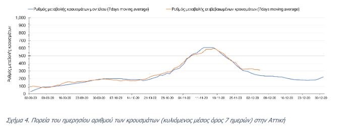 Η πορεία της μέσης εβδομαδιαίας τιμής των κρουσμάτων όπως έχουν καταγραφεί από τον ΕΟΔΥ και η αναμενόμενη πορεία τους στην περίπτωση ανοίγματος των εμπορικών καταστημάτων στις 14 Δεκεμβρίου όπως προδιαγράφεται από την υπολογιστική πλατφόρμα CORE για την Ελληνική επικράτεια, αποτυπώνονται στο Σχήμα 3 .