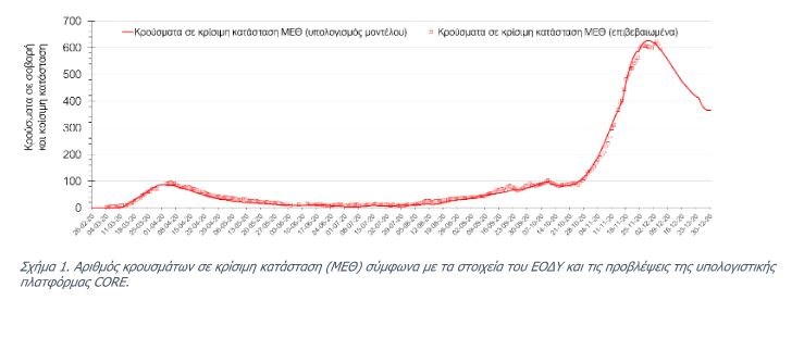 Η συνολική πορεία των κρουσμάτων, αλλά και η αρχή αποκλιμάκωσης που παρατηρείται τις τελευταίες ημέρες στον αριθμό των ασθενών σε κρίσιμη κατάσταση (διασωληνομένοι σε ΜΕΘ), μετά τα σημερινά αποτελέσματα, συνάδει με τις προσομοιώσεις του μοντέλου CORE για τον επόμενο μήνα. Εντούτοις, παρά την εφαρμογή οριζοντίων μέτρων ανάσχεσης της πανδημίας, η πορεία της είναι διαφοροποιείται από περιοχή σε περιοχή, ενώ πλέον υπάρχουν σαφείς ενδείξεις ότι υπάρχει ελαφρά ανάσχεση της πτωτικής πορείας συνολικά, η έκταση της οποίας θα επαναξιολογείται καθημερινά.