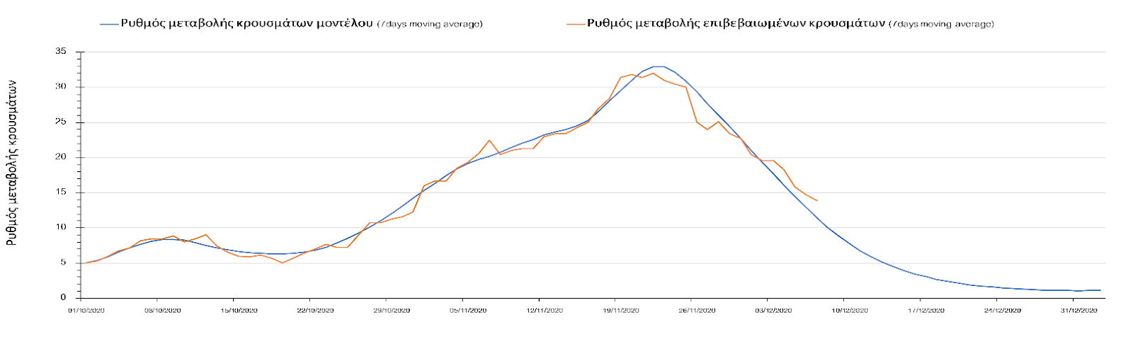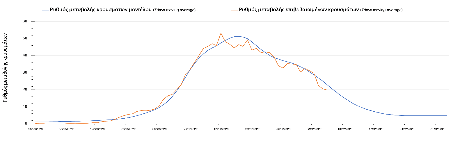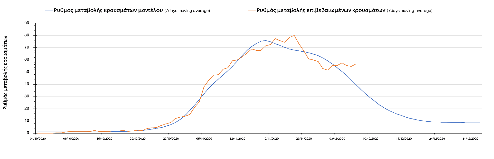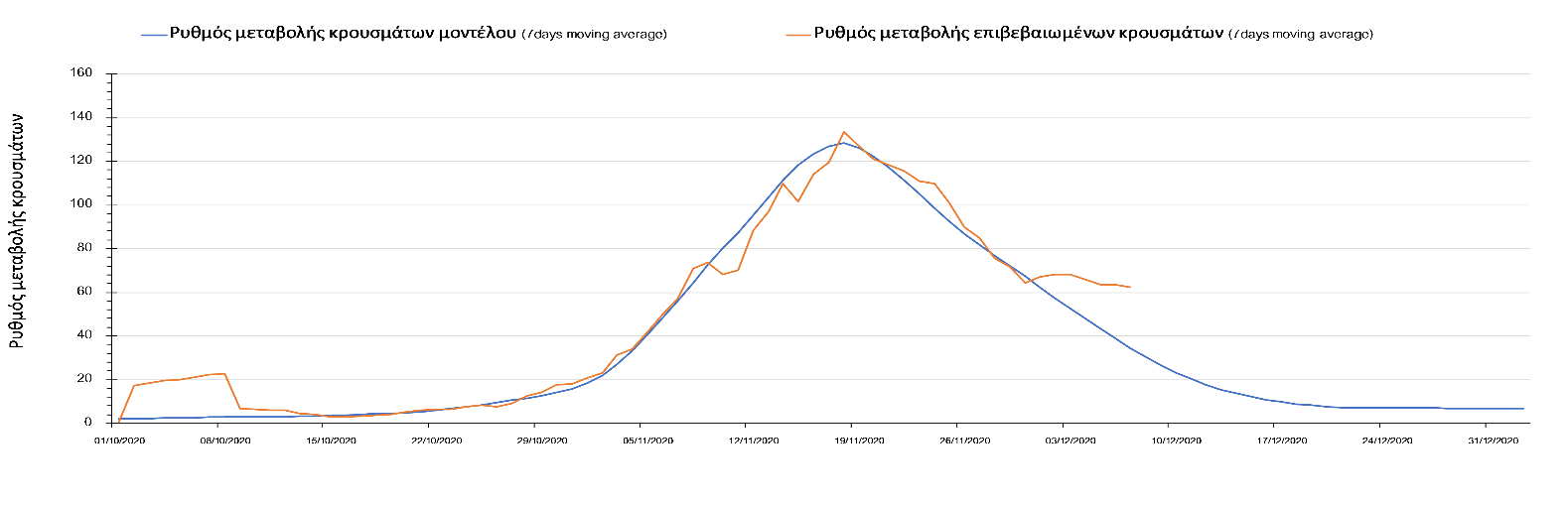 Η συνολική πορεία των κρουσμάτων, αλλά και η αρχή αποκλιμάκωσης που παρατηρείται τις τελευταίες ημέρες στον αριθμό των ασθενών σε κρίσιμη κατάσταση (διασωληνομένοι σε ΜΕΘ), μετά τα σημερινά αποτελέσματα, συνάδει με τις προσομοιώσεις του μοντέλου CORE για τον επόμενο μήνα. Εντούτοις, παρά την εφαρμογή οριζοντίων μέτρων ανάσχεσης της πανδημίας, η πορεία της διαφοροποιείται από περιοχή σε περιοχή, ενώ πλέον υπάρχουν σαφείς ενδείξεις ότι υπάρχει ελαφρά ανάσχεση της πτωτικής πορείας συνολικά, η έκταση της οποίας θα επαναξιολογηθεί.