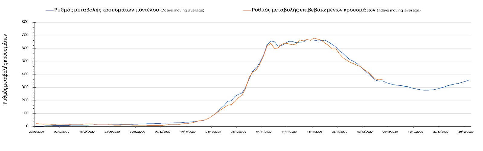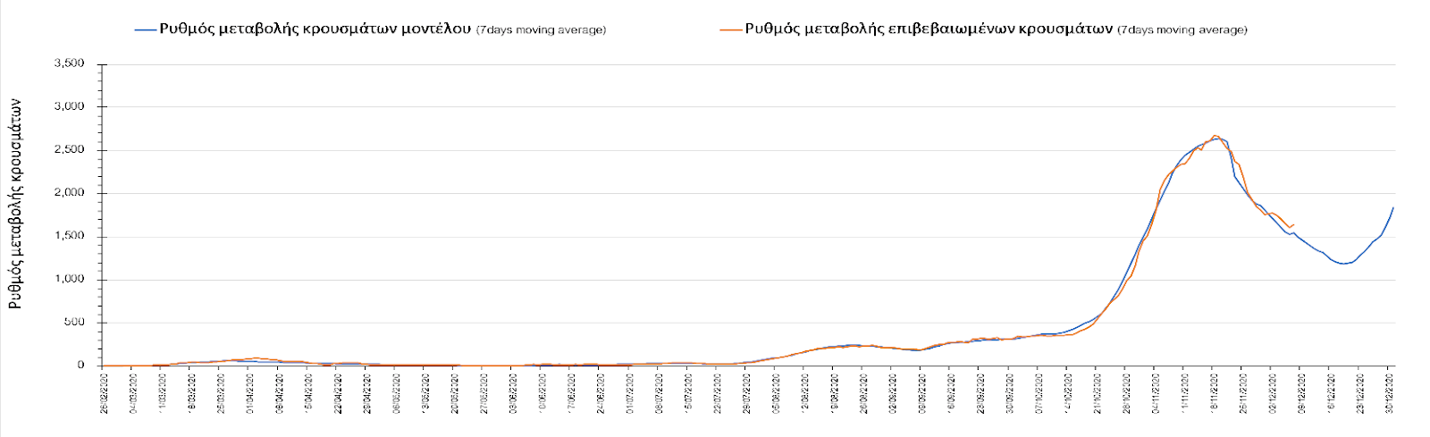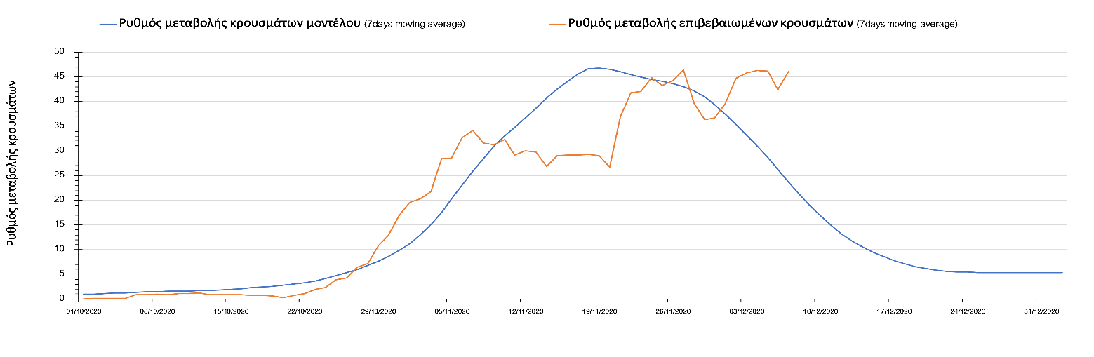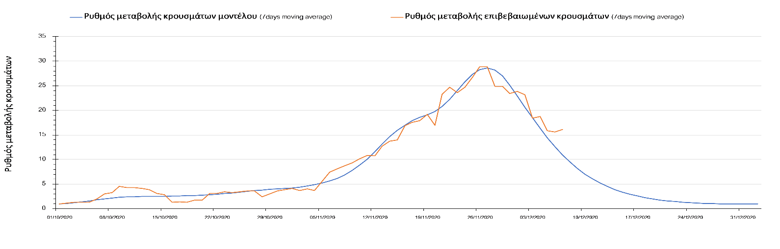 Η συνολική πορεία των κρουσμάτων, αλλά και η αρχή αποκλιμάκωσης που παρατηρείται τις τελευταίες ημέρες στον αριθμό των ασθενών σε κρίσιμη κατάσταση (διασωληνομένοι σε ΜΕΘ), μετά τα σημερινά αποτελέσματα, συνάδει με τις προσομοιώσεις του μοντέλου CORE για τον επόμενο μήνα. Εντούτοις, παρά την εφαρμογή οριζοντίων μέτρων ανάσχεσης της πανδημίας, η πορεία της διαφοροποιείται από περιοχή σε περιοχή, ενώ πλέον υπάρχουν σαφείς ενδείξεις ότι υπάρχει ελαφρά ανάσχεση της πτωτικής πορείας συνολικά, η έκταση της οποίας θα επαναξιολογηθεί.