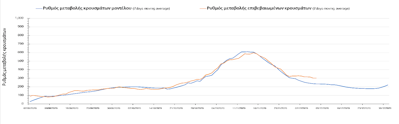 Σχήμα 3. Πορεία του ημερησίου αριθμού των κρουσμάτων (κυλιόμενος μέσος όρος 7 ημερών) στην Ελληνική επικράτεια