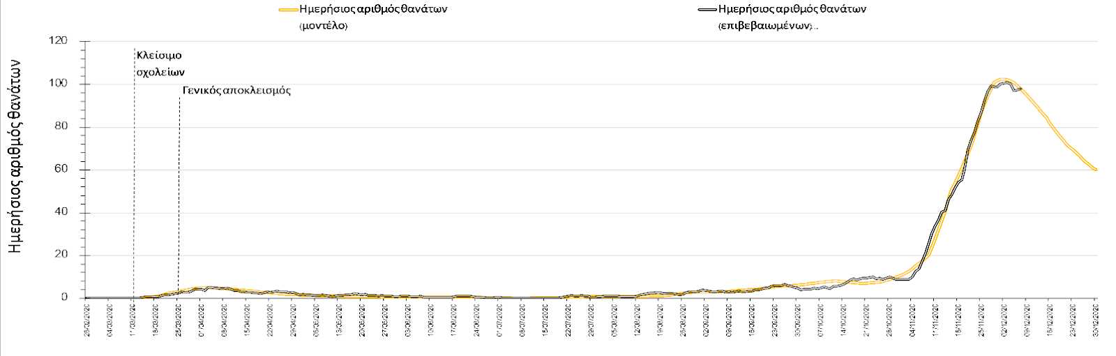 Δυστυχώς σήμερα ο αριθμός των ασθενών που βρίσκονται σε κρίσιμη κατάσταση (διασωληνομένοι σε ΜΕΘ) παρέμεινε σταθερός στους 600, που πιθανότατα οφείλεται στην επιβάρυνση της κατάστασης σε συγκεκριμένες περιοχές της βορείου Ελλάδος. Η καμπύλη εξέλιξης του αριθμού των ασθενών που χρειάζονται διασωλήνωση φαίνεται να συνάδει συνολικά με την πορεία που διαφαίνονταν και από την υπολογιστική πλατφόρμα CORE, όπως αυτή παρουσιάζεται στο Σχήμα 1, ενώ μια εκτίμηση για την πορεία των θανάτων παρουσιάζεται στο Σχήμα 2.