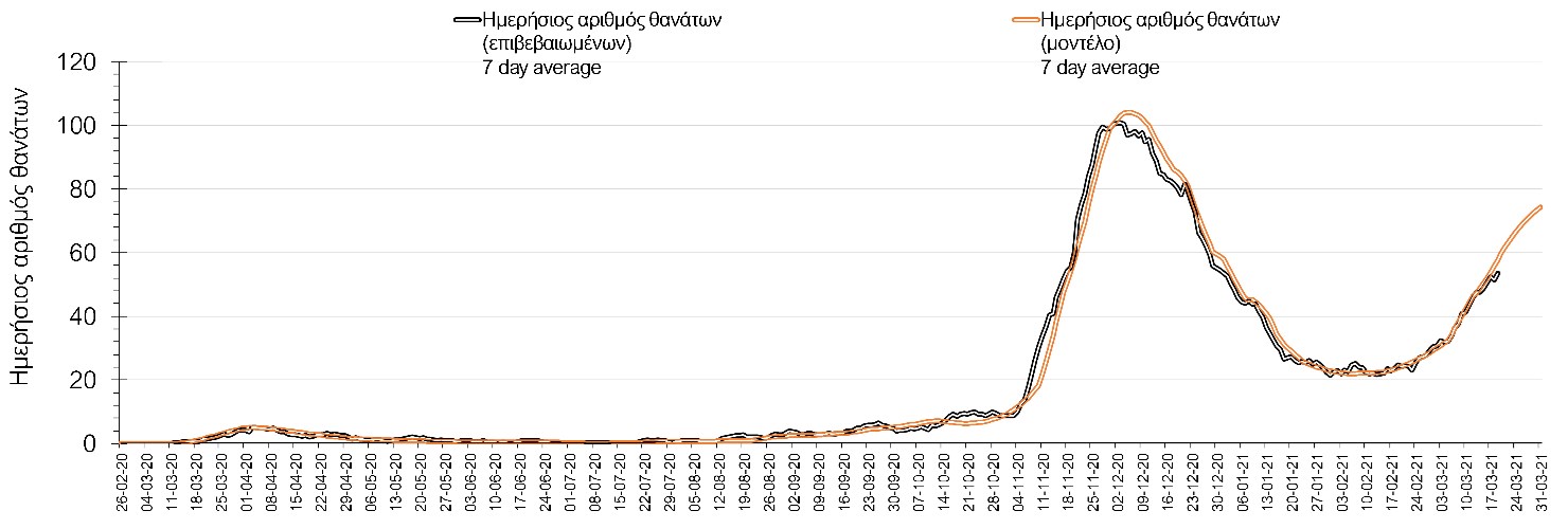 Σχήμα 2. Αριθμός θανάτων (κυλιόμενος μέσος όρος 7 ημερών) σύμφωνα με τα στοιχεία του ΕΟΔΥ και τις προβλέψεις της υπολογιστικής πλατφόρμας CORE.Η πορεία της μέσης εβδομαδιαίας τιμής των κρουσμάτων, καθώς και του κυλιόμενου μέσου όρου 7 ημερών του αριθμού των κρουσμάτων ανά 100.000 πληθυσμού, όπως έχουν καταγραφεί από τον ΕΟΔΥ και η αναμενόμενη πορεία τους όπως προδιαγράφεται από την υπολογιστική πλατφόρμα CORE για την Ελληνική επικράτεια μέχρι το τέλος του Ιανουαρίου, αποτυπώνονται στο Σχήμα 3. Η ανάλυσή μας έχει επικαιροποιηθεί με βάση την απόφαση εφαρμογής αυστηρού lockdown από την Κυριακή 3 Ιανουαρίου μέχρι και τις 17 Ιανουαρίου. Στις 11 Ιανουαρίου λάβαμε υπόψη το άνοιγμα της πρωτοβάθμιας εκπαίδευσης, ενώ το άνοιγμα των βιβλιοπωλείων, κομμωτηρίων, λιανικού εμπορίου και των εμπορικών καταστημάτων από τη Δευτέρα 18/1, ενώ επιπλέον, έχει ληφθεί υπόψη το άνοιγμα τις δευτεροβάθμιας εκπαίδευσης από τη Δευτέρα 1 Φεβρουαρίου στις κίτρινες περιοχές. Στις κόκκινες περιοχές, από τη Δευτέρα 1 Φεβρουαρίου έχει γίνει άνοιγμα μόνο των Γυμνασίων (και συνεχίζεται το καθεστώς τηλε-εκπαίδευση για τα Λύκεια), στις οποίες επίσης, η λειτουργία του λιανεμπορίου θα πραγματοποιείται με τη μέθοδο click away, και η λειτουργία καταστημάτων ένδυσης, υπόδησης, βιβλιοπωλείων, κομμωτηρίων και καταστημάτων προσωπικής περιποίησης με προκαθορισμένο ραντεβού (click-in-shop) και με 1 άτομο ανά 25 τ.μ. Έχουν ληφθεί υπόψιν τα περιοριστικά μέτρα που ανακοινώθηκαν στις 5 Φεβρουαρίου) για Αθήνα, Θεσσαλονίκη, Πάτρα, Χαλκίδα και Χαλκιδική και που τέθηκαν σε ισχύ από το Σάββατο 6 Φεβρουαρίου και μέχρι τη Δευτέρα 15 Φεβρουαρίου, ενώ επιπλέον για την Αθήνα και στο βαθμό που αυτή επηρεάζει όλη την υπόλοιπη Ελλάδα, το αυστηρό lock down, με εφαρμογή από την Πέμπτη 11/2 έως και τις 15/3. Επιπλέον, στο σύνολο της Ελλάδας έχει ληφθεί υπόψιν το lockdown μέχρι και τις 21/3 που εφαρμόσθηκε στις Περιφερειακές Ενότητες Αχαΐας, Αρκαδίας, Θεσσαλονίκης, Λάρισας, Λευκάδας, Φθιώτιδας, Αργολίδας, Κορινθίας, Θεσπρωτίας, Άρτας, Σάμου, Βοιωτίας, Χίου, Αιτωλοακαρνανίας, Ρόδου, Ηρακλείου και Ευβοίας. Επιπλέον, όσον αφορά τις προσομοιώσεις των επιμέρους περιοχών, έγινε επικαιροποίηση των προβλέψεων σε όλες τις επιμέρους περιφερειακές ενότητες όπου εφαρμόσθηκε το lockdown από τις 4/3, το οποίο όπως ανακοινώθηκε και επίσημα, θα διατηρηθεί εώς τις 29/3. Όπως ήδη αναφέρθηκε, λόγω της απόκλισης που παρατηρήθηκε την Τρίτη 9/3, έγινε επαναπαραμετροποίηση του μοντέλου με μεγαλύτερη ποσόστωση μεταλλαγμένων στελεχών του SARS-CoV-2 στην κοινότητα, δηλαδή το πόσο τοις εκατό (%) των κρουσμάτων που εντοπίζονται καθημερινά είναι φορείς κάποιου μεταλλαγμένου και πιο ταχέως μεταδιδόμενου στελέχους. Όπως φαίνεται από το διάγραμμα, από τις 8 Ιανουαρίου έχουμε μια αύξηση κρουσμάτων μέχρι τις 11 Ιανουαρίου η οποία οφείλεται στη μείωση της περιστολής που σημειώθηκε στις γιορτές. Από τις 11 μέχρι τις 18 Ιανουαρίου προβλεπόταν μια μείωση κρουσμάτων λόγω της εφαρμογής του lockdown και η οποία όντως παρατηρήθηκε. Εντούτοις, όπως είχαμε προβλέψει, από τις 23 Ιανουαρίου και έπειτα διαφαίνεται αύξηση στον κυλιόμενο μέσο όρο των κρουσμάτων, η οποία έγινε ιδιαίτερα έντονη μετά τις 17/2, η οποία και συνεχίζεται μέχρι τώρα. Λόγω της ισχυρής παρουσία των μεταλλαγμένων στελεχών, πιστεύουμε ότι για να επιτευχθεί κάμψη της επιδημικής καμπύλης, θα πρέπει να γίνει αυστηρή εφαρμογή των μέτρων, έτσι