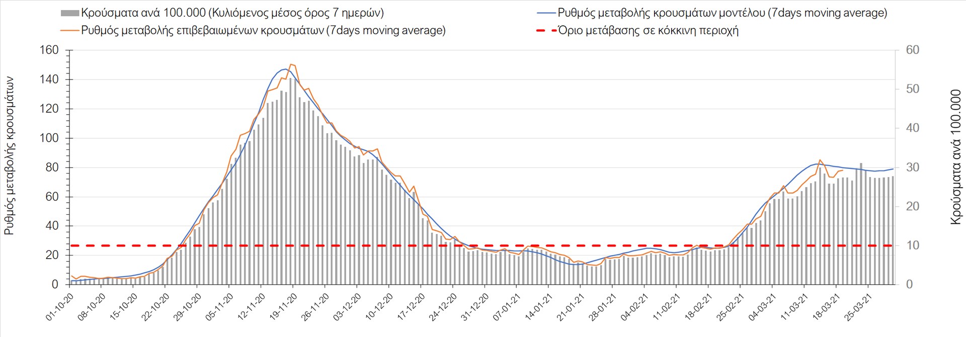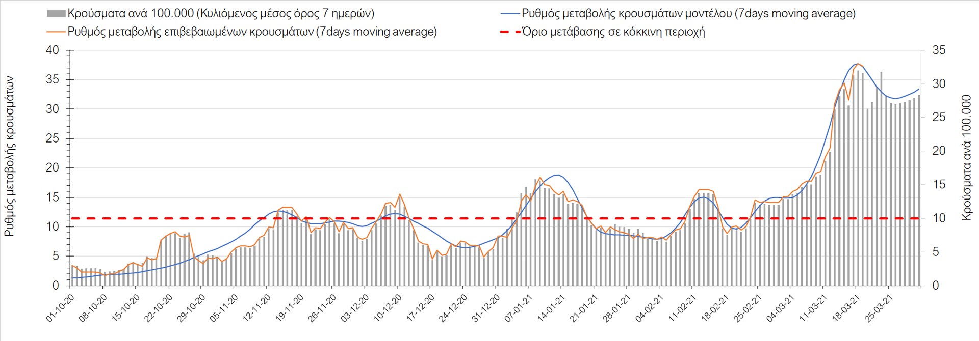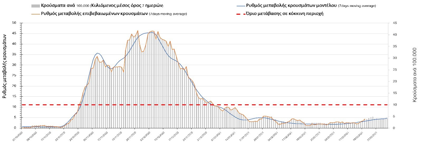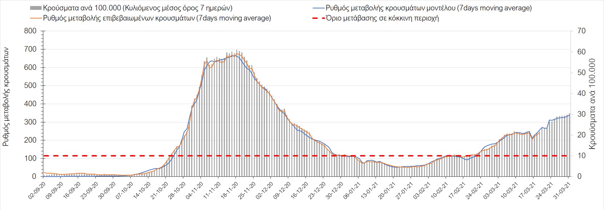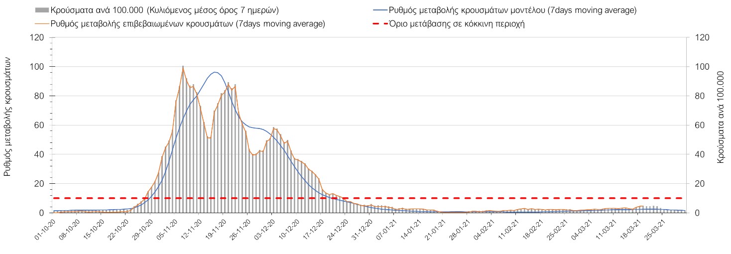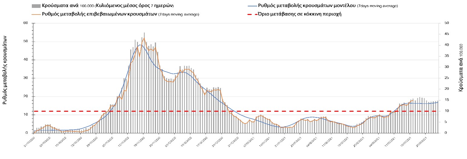 Σχήμα 47. Πορεία του ημερησίου αριθμού των κρουσμάτων (κυλιόμενος μέσος όρος 7 ημερών) στην Θάσο Συμπεράσματα:Η αύξηση που παρατηρείται πλέον στον αριθμό των ασθενών σε κρίσιμη κατάσταση (διασωληνομένοι σε ΜΕΘ), καθώς και ο αριθμός των θανάτων (αν και με κάποια μικρή απόκλιση) συνάδουν με τις προσομοιώσεις του μοντέλου CORE, όπως και ο αριθμός των κρουσμάτων, μετά και τις επικαιροποιημένες προβλέψεις της προηγούμενης εβδομάδας, όπου ελήφθη υπόψιν η μεγαλύτερη διασπορά των μεταλλαγμένων και ταχύτερα μεταδιδόμενων στελεχών. Τα παραπάνω αποτελέσματα αποτυπώνονται και στο δείκτη θετικότητας, του οποίου η ημερήσια τιμή παρουσίασε μεγάλη αύξηση σε σχέση με την προηγουμενη εβδομάδα. Σε πανελλαδικό επίπεδο ο κυλιόμενος εβδομαδιαίος μέσος όρος του δείκτη θετικότητας διαμορφώθηκε στο 7,4% (η ημερήσια τιμή είναι 5,3%) ενώ ο κυλιόμενος εβδομαδιαίος μέσος όρος του πραγματικού αριθμού αναπαραγωγής Rt (δηλαδή ο αριθμός των ατόμων που ένας φορέας μπορεί να επιμολύνει) διαμορφώθηκε στο 1,06 (τιμές του Rt πάνω από τη μονάδα υποδηλώνουν καθαρή αύξηση της διασποράς του ιού στην κοινότητα). Πλέον, με τον υψηλότερο αριθμό φορέων του μεταλλαγμένου στελέχους και την αναθεώρηση στις προβλέψεις, δεν προβλέπεται σύντομα κάμψη του ρυθμού αύξησης, και μπορεί να χρειαστεί να παραταθούν τα περιοριστικά μέτρα και μετά το τέλος Μαρτίου.Με δεδομένο τον πολύ υψηλό αριθμό κρουσμάτων, αλλά και το γεγονός ότι πολλές περιοχές συμπεριλαμβανομένου και της Αττικής βρίσκονται ήδη σε lockdown εδώ και μέρες, η πορεία της πανδημίας δεν είναι η αναμενόμενη, γεγονός που στη παρούσα φάση ίσως υποδηλώνει περισσότερο μεγαλύτερη διασπορά των μεταλλαγμένων στελεχών στην κοινότητα και λιγότερο πλημμελή εφαρμογή των μέτρων. Συνεπώς, παρά την επαναπαραμετροποίηση του μοντέλου και την αναθεώρηση των προβλέψεων, είναι επιτακτική η ανάγκη να έχουμε καλύτερη εικόνα της διασποράς τους, έτσι ώστε να μπορέσει να γίνει ορθή αναπροσαρμογή των εκτιμήσεων για την πορεία της πανδημίας στις επόμενες εβδομάδες.Mε βάση τα δεδομένα αυτής της εβδομάδας, καλώς εφαρμόσθηκαν τα περιοριστικά μέτρα που ισχύουν από τις 4 Μαρτίου, τα οποία ίσως χρειαστούν επιπλέον αναθεώρηση, με βάση την επιδημιολογική εικόνα που θα επικρατήσει, ενώ επίσης καλώς εφαρμόσθηκε το lockdown στην Αθήνα μέχρι τις 15 Μαρτίου. Με τα μέχρι τώρα δεδομένα, τα μέτρα αυτά φαίνονται να είναι προς τη σωστή κατεύθυνση, και αναμένουμε να δούμε εάν θα αποδειχθούν ικανά και στην πράξη να αναχαιτίσουν την επέλαση ενός τρίτου κύματος, εν αναμονή και επιπλέον στοιχείων, τόσο για τη μεταδοτικότητα του στελέχους B.1.1.7. του SARS-CoV-2, όσο και της διασποράς του στην κοινότητα, οπότε συνολικά προτείνουμε την εφαρμογή καθολικού lockdown σε όλη τη χώρα, ώστε να αναχαιτιστεί η διαφαινόμενη ανοδική πορεία που διαμορφώνεται. Η πρόταση αυτή υποστηρίζεται και από το υψηλό ποσοστό πληρότητας των ΜΕΘ, των οποίων οι ανάγκες αναμένεται να συνεχίσουν να αυξάνουν.Παρά την εφαρμογή οριζόντιων μέτρων ανάσχεσης της πανδημίας που εφαρμόσθηκαν από τα τέλη Οκτωβρίου, η πορεία της τελευταίας διαφοροποιείται από περιοχή σε περιοχή. Οι παραπάνω παρατηρήσεις τείνουν στο συμπέρασμα ότι η διαχείριση του υγειονομικού κινδύνου θα πρέπει να εξεταστεί σε τοπικό επίπεδο. Πλέον προβληματίζουν πέρα από την Αττική και τη Θεσσαλονίκη, η Αχαΐα, η Εύβοια, η Βοιωτία, η Χαλκιδική, καθώς επίσης η Αρκαδί