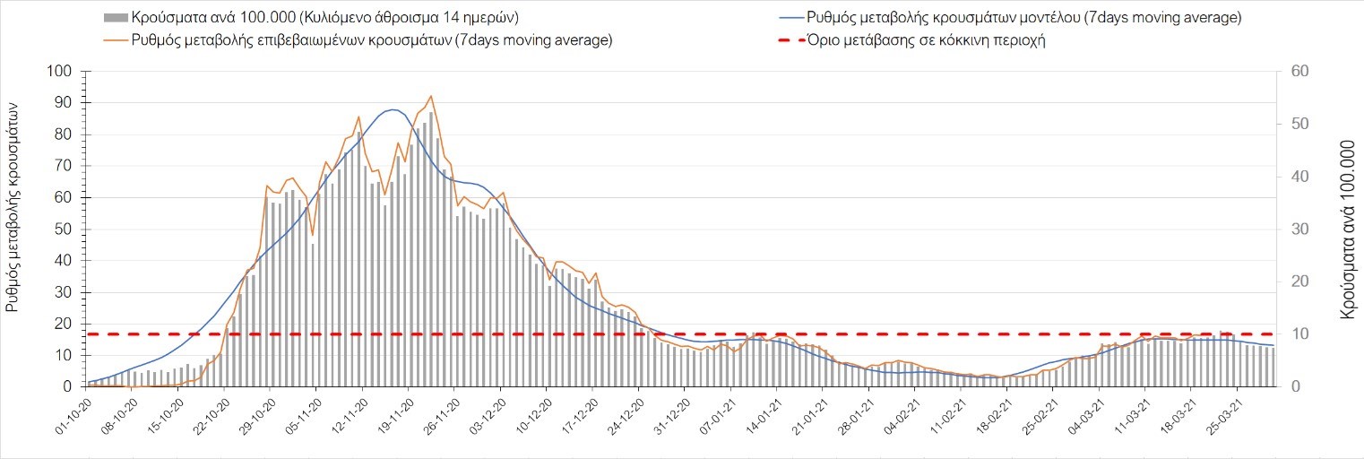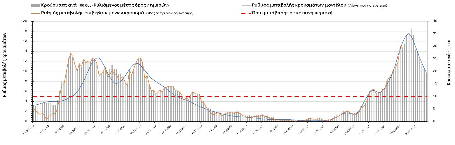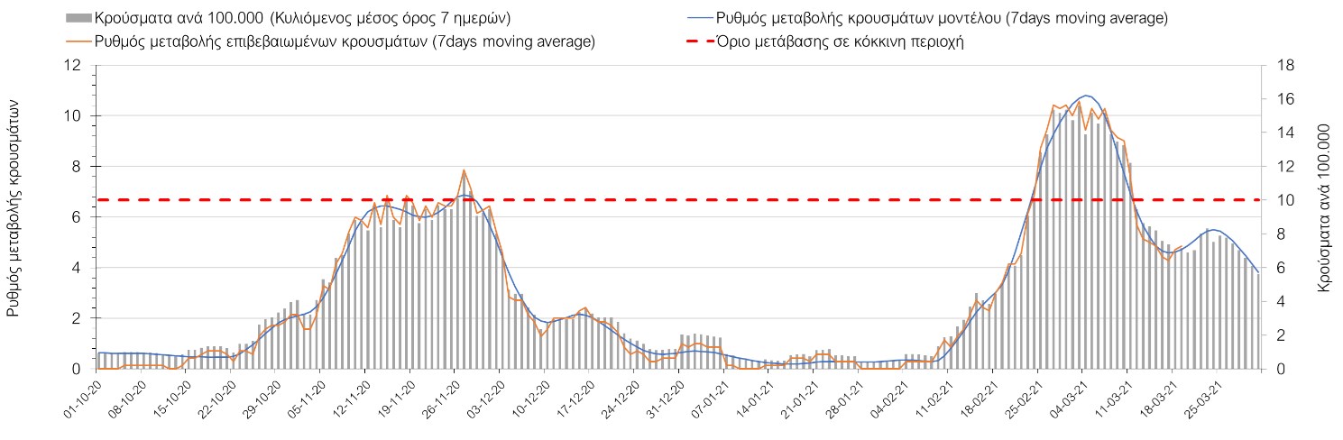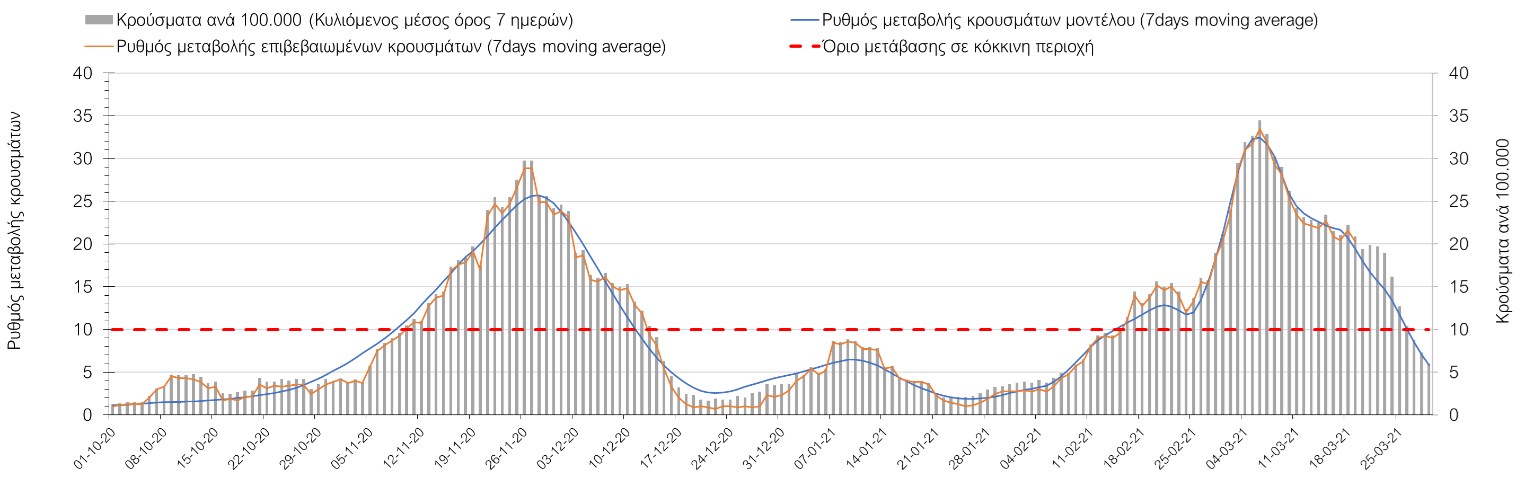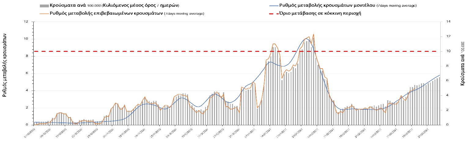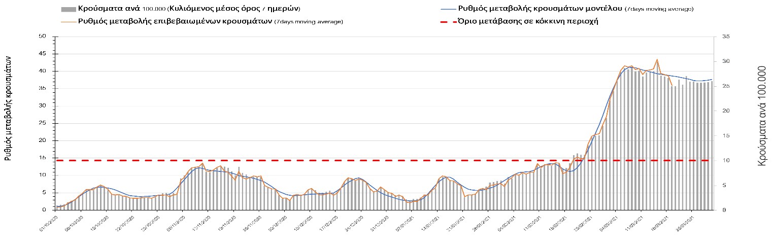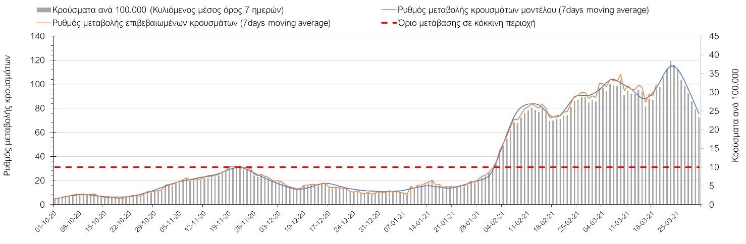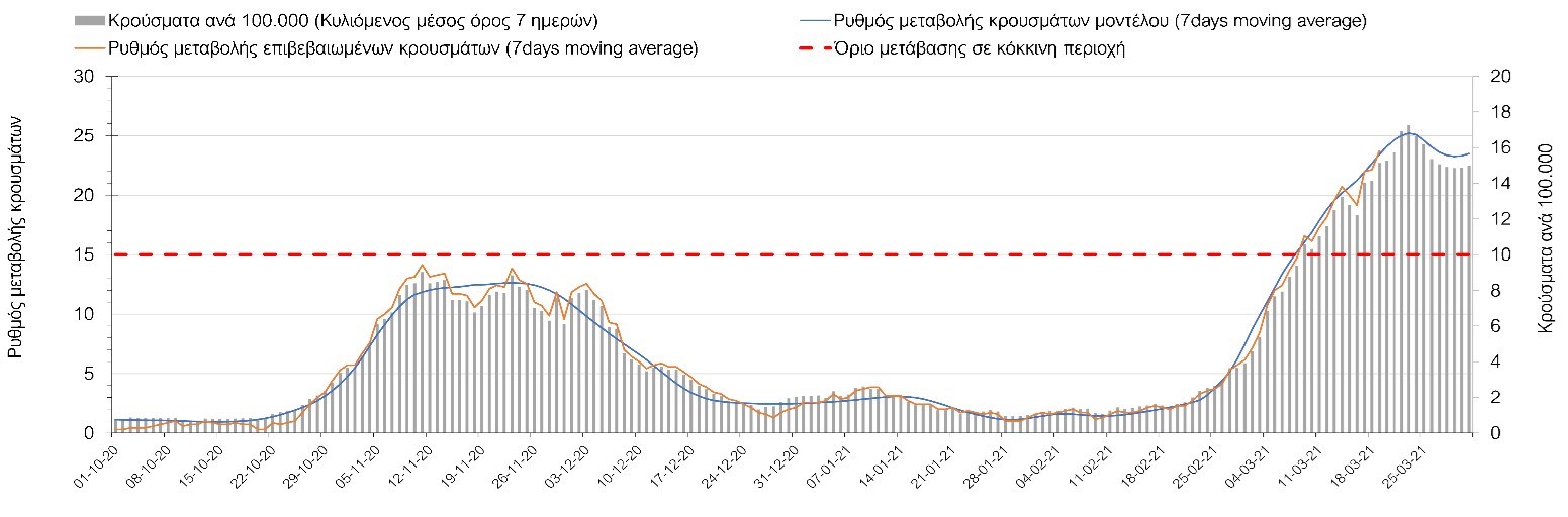 Σχήμα 24. Πορεία του ημερησίου αριθμού των κρουσμάτων (κυλιόμενος μέσος όρος 7 ημερών) στα ΆρταΌσον αφορά τις πόλεις της Βορείου Ελλάδας, αύξηση κρουσμάτων παρουσιάζεται στην Ημαθία με 39 κρούσματα (Σχήμα 25), στην Πέλλα με 35 κρούσματα (Σχήμα 26) και στην Χαλκιδική με 39 κρούσματα (Σχήμα 36). Αντίθετα καθοδική είναι η πορεία της πανδημίας στην Καβάλα με 11 κρούσματα (Σχήμα 31), στη Φλώρινα με 3 κρούσματα (Σχήμα 28) και στο Κιλκίς με 11 κρούσματα (Σχήμα 25), στην Πιερία με 23 κρούσματα (Σχήμα 27), στις Σέρρες με 19 κρούσματα (Σχήμα 34), στα Γρεβενά με 2 κρούσματα (Σχήμα 33), στην Κοζάνη με 51 κρούσματα (Σχήμα 27) και στην Καστοριά με 15 κρούσματα (Σχήμα 35). Στην Κοζάνη έχει διαμορφωθεί σταθερά ανοδικής τάσης και στην Καστοριά η συνολική πορεία της επιδημικής καμπύλης είναι αυξητική και η κορύφωση προβλέπεται να επέλθει σε 3-4 ημέρες. Παρά την εφαρμογή των περιοριστικών μέτρων η Χαλκιδική προβλέπεται να παραμείνει «κόκκινη» και μετά το τέλος του μήνα. Εντούτοις και άλλες περιοχές πλέον είτε βρίσκονται τις τελευταίες ημέρες πάνω από το όριο (Καβάλα, Ημαθία, Πέλλα, Καστοριά, Κιλκίς, Πιερία, Γρεβενά, Σέρρες, Καστοριά). Από αυτές όμως περισσότερο ανησυχεί και πάλι η Κοζάνη, στην οποία έχει διαμορφωθεί έντονη αυξητική τάση τις τελευταίες ημέρες, η οποία εάν ακολουθήσει την προβλεπόμενη τροχιά θα αρχίσει να αποκλιμακώνεται μετά τις 25 Μαρτίου, όπως και η Καστοριά, η οποία έχει για την ώρα ακόμα πιο έντονα ανοδική τάση.