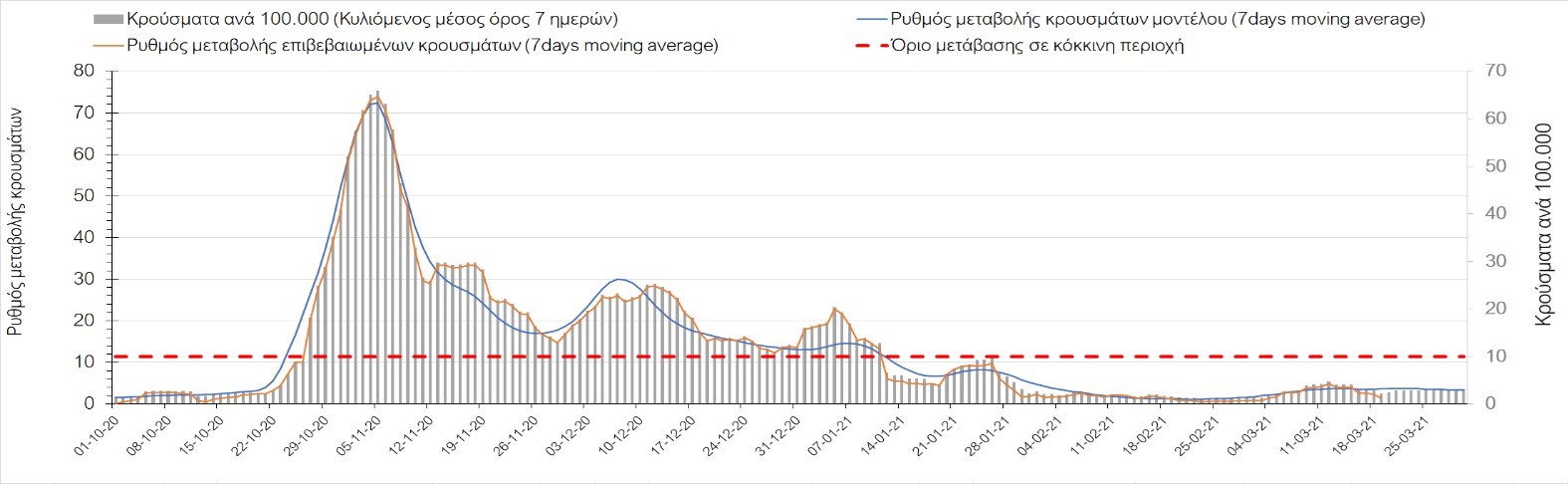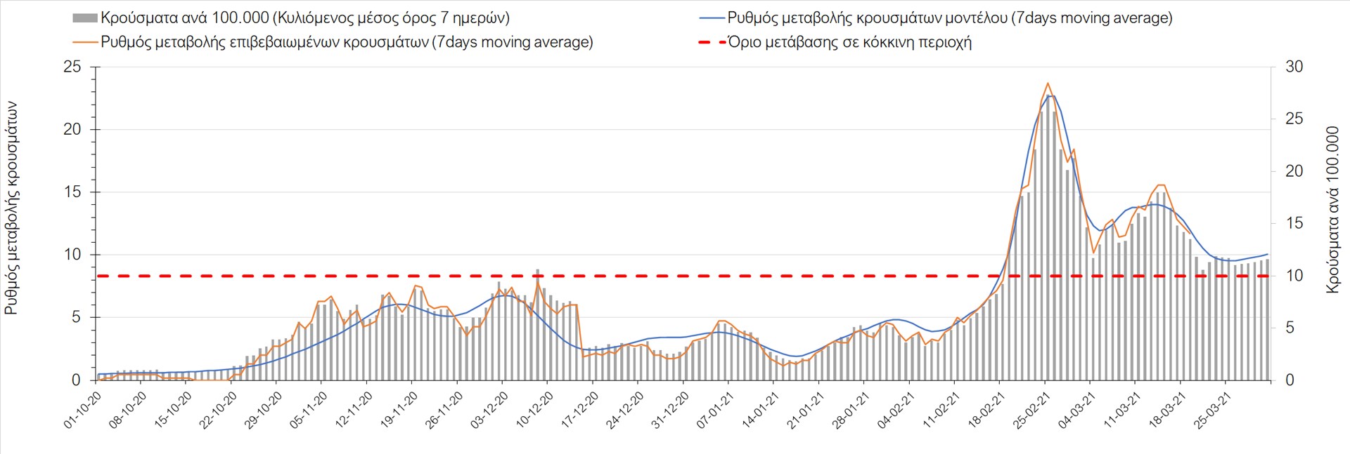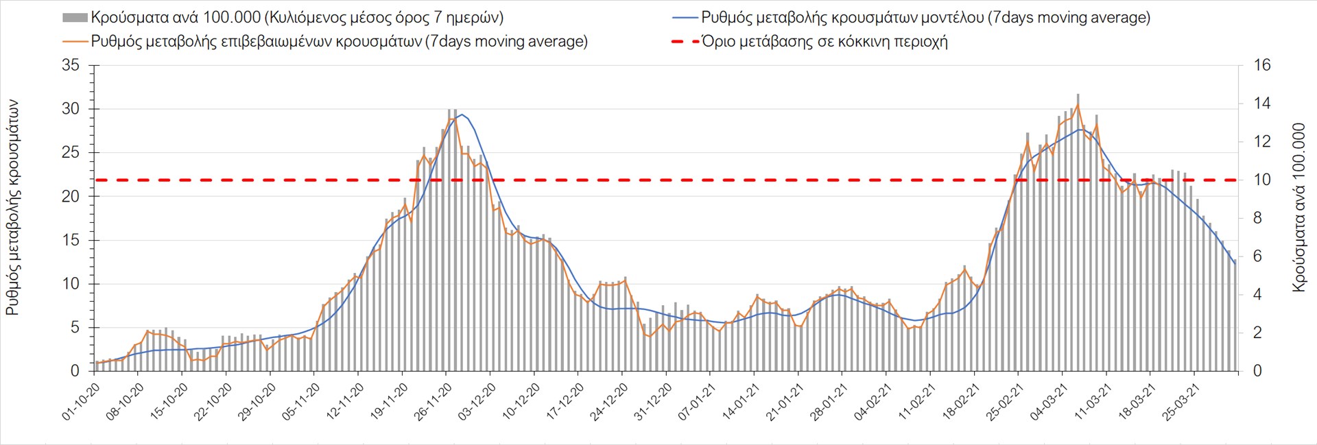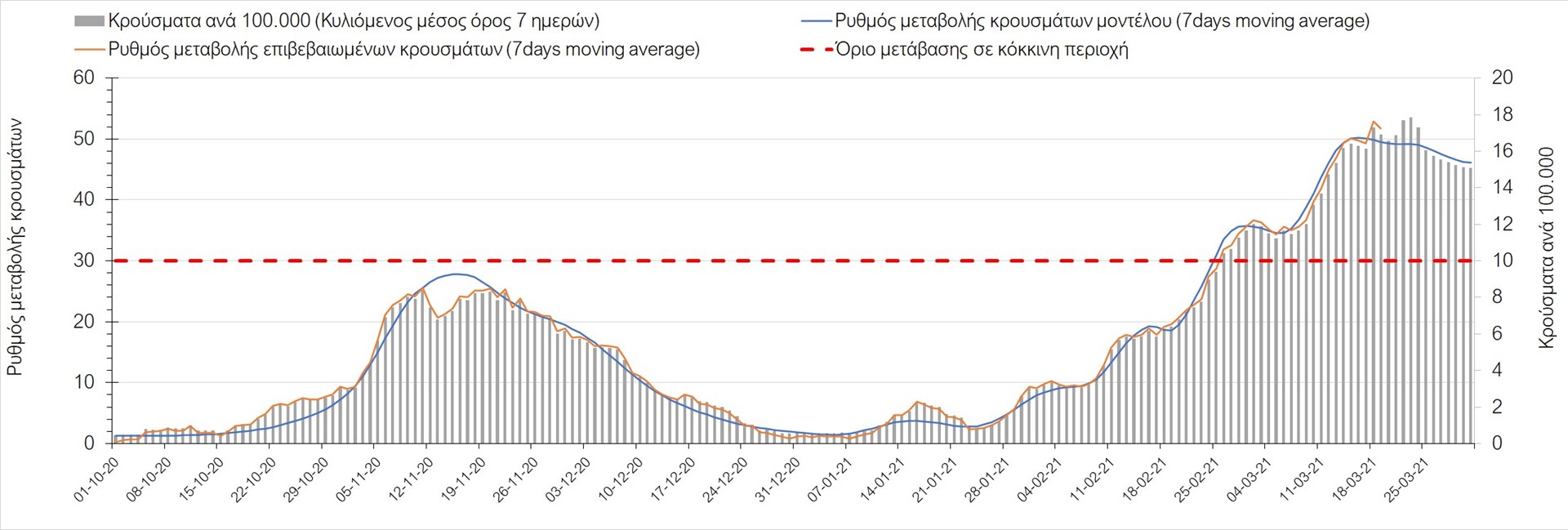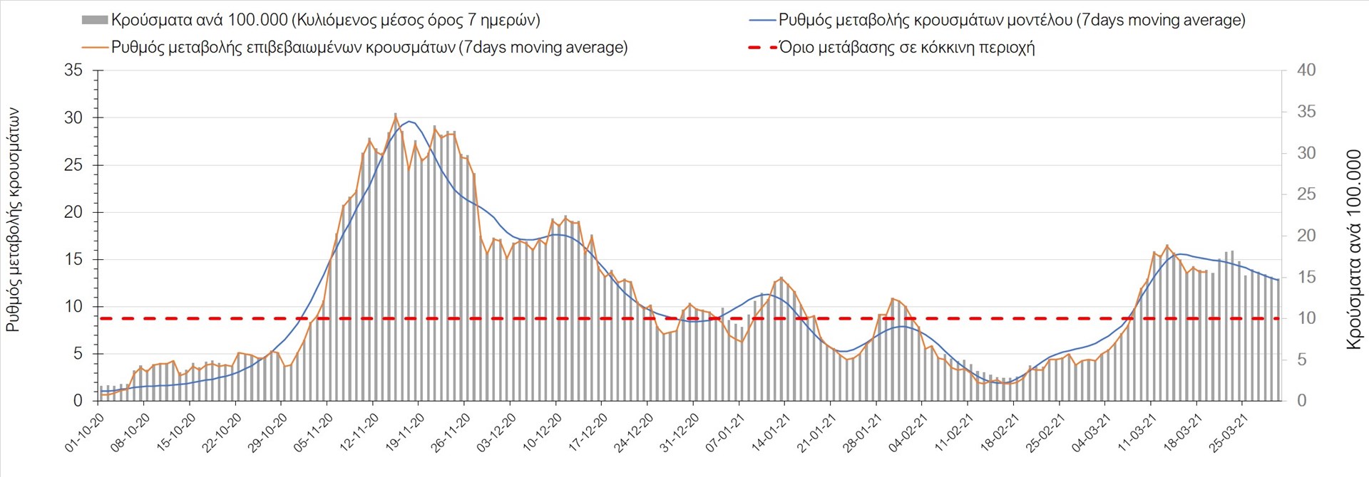 Σχήμα 24. Πορεία του ημερησίου αριθμού των κρουσμάτων (κυλιόμενος μέσος όρος 7 ημερών) στα ΆρταΌσον αφορά τις πόλεις της Βορείου Ελλάδας, αύξηση κρουσμάτων παρουσιάζεται στην Ημαθία με 39 κρούσματα (Σχήμα 25), στην Πέλλα με 35 κρούσματα (Σχήμα 26) και στην Χαλκιδική με 39 κρούσματα (Σχήμα 36). Αντίθετα καθοδική είναι η πορεία της πανδημίας στην Καβάλα με 11 κρούσματα (Σχήμα 31), στη Φλώρινα με 3 κρούσματα (Σχήμα 28) και στο Κιλκίς με 11 κρούσματα (Σχήμα 25), στην Πιερία με 23 κρούσματα (Σχήμα 27), στις Σέρρες με 19 κρούσματα (Σχήμα 34), στα Γρεβενά με 2 κρούσματα (Σχήμα 33), στην Κοζάνη με 51 κρούσματα (Σχήμα 27) και στην Καστοριά με 15 κρούσματα (Σχήμα 35). Στην Κοζάνη έχει διαμορφωθεί σταθερά ανοδικής τάσης και στην Καστοριά η συνολική πορεία της επιδημικής καμπύλης είναι αυξητική και η κορύφωση προβλέπεται να επέλθει σε 3-4 ημέρες. Παρά την εφαρμογή των περιοριστικών μέτρων η Χαλκιδική προβλέπεται να παραμείνει «κόκκινη» και μετά το τέλος του μήνα. Εντούτοις και άλλες περιοχές πλέον είτε βρίσκονται τις τελευταίες ημέρες πάνω από το όριο (Καβάλα, Ημαθία, Πέλλα, Καστοριά, Κιλκίς, Πιερία, Γρεβενά, Σέρρες, Καστοριά). Από αυτές όμως περισσότερο ανησυχεί και πάλι η Κοζάνη, στην οποία έχει διαμορφωθεί έντονη αυξητική τάση τις τελευταίες ημέρες, η οποία εάν ακολουθήσει την προβλεπόμενη τροχιά θα αρχίσει να αποκλιμακώνεται μετά τις 25 Μαρτίου, όπως και η Καστοριά, η οποία έχει για την ώρα ακόμα πιο έντονα ανοδική τάση.