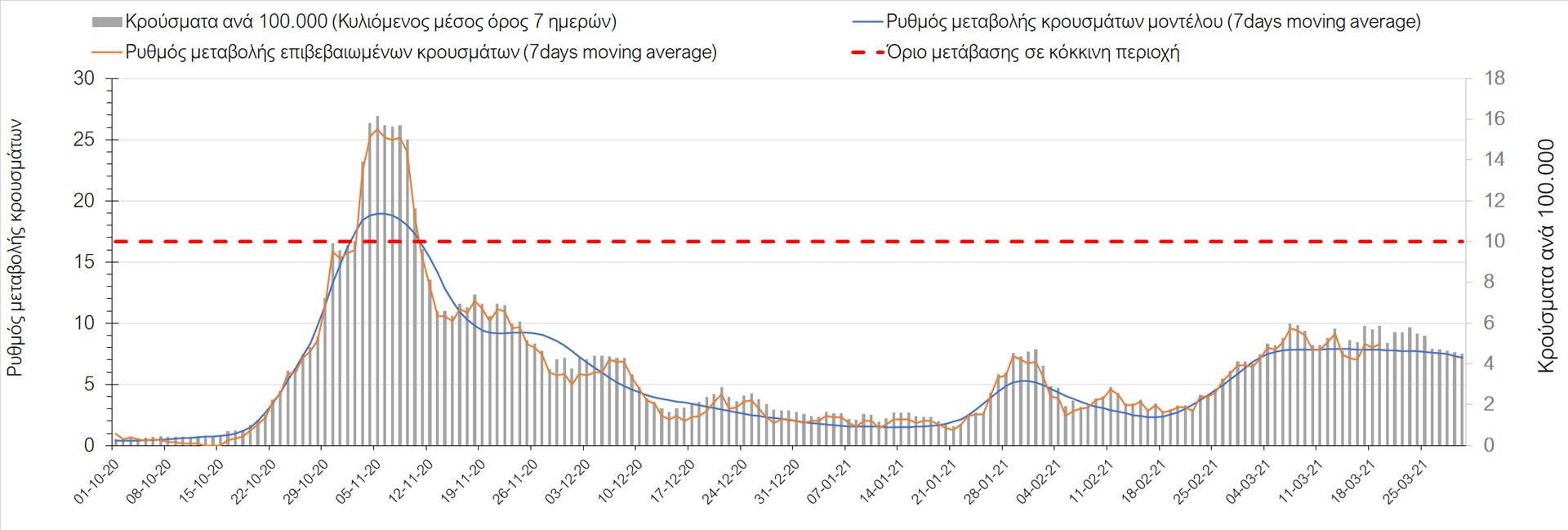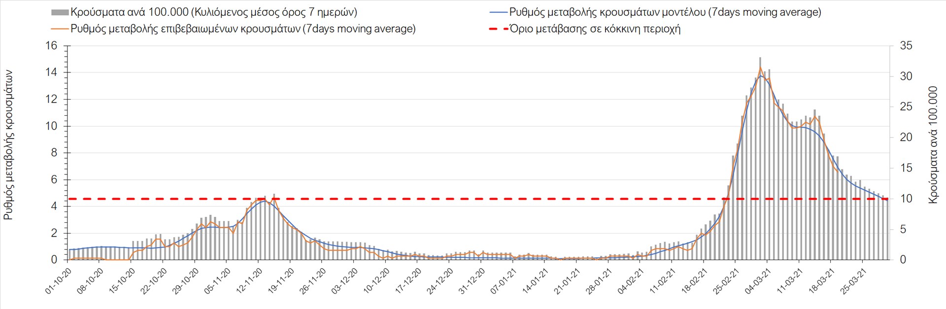 Σχήμα 32. Πορεία του ημερησίου αριθμού των κρουσμάτων (κυλιόμενος μέσος όρος 7 ημερών) στην Πιερία