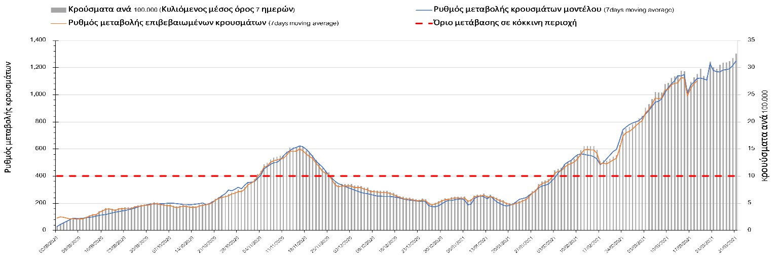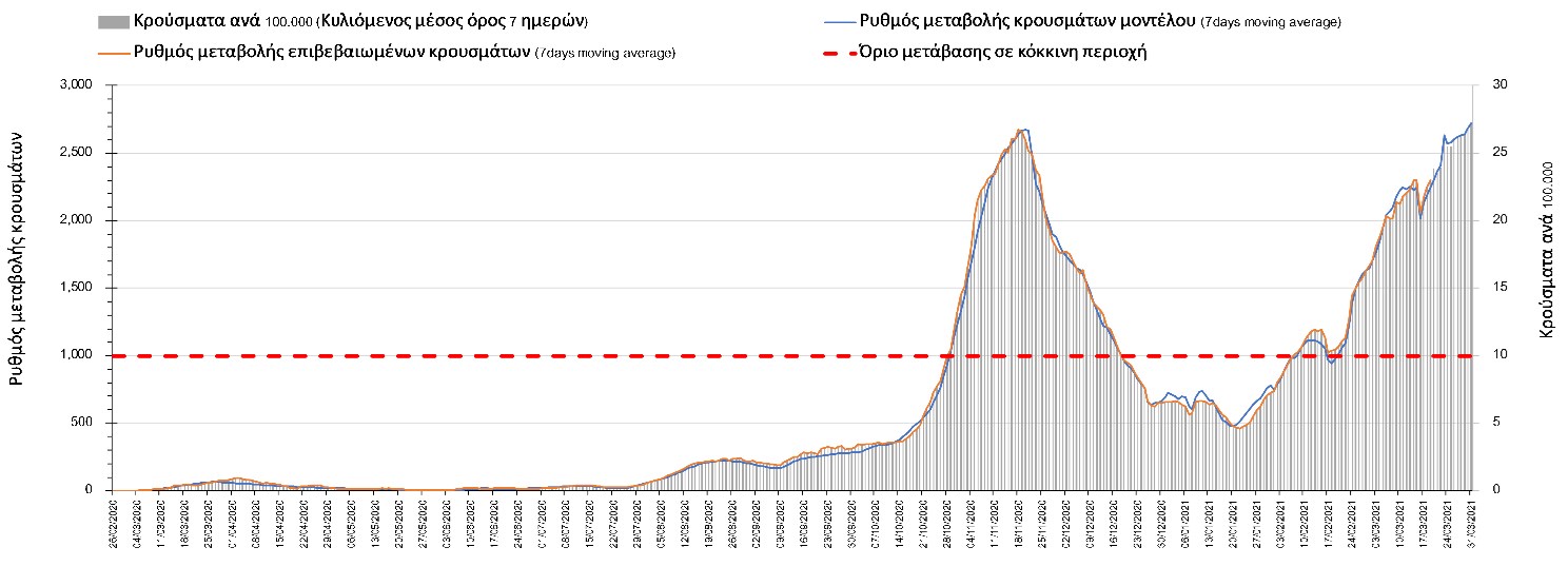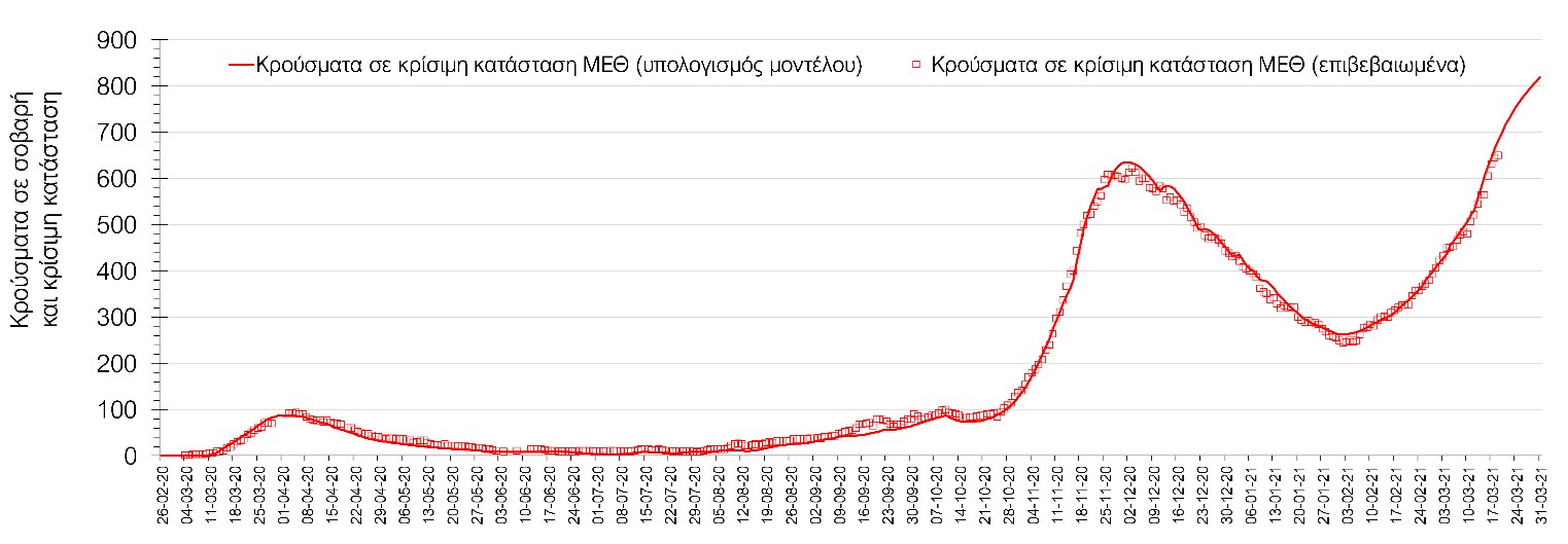 Ακολουθεί η ανάλυση του καθηγητή Δημοσθένη Σαρηγιάννη και του Δρ. Σπύρου Καρακίτσιου για την εξέλιξη της πανδημίας στη χώρα μας:Σύμφωνα με τα στοιχεία του ΕΟΔΥ, ο σημερινός αριθμός κρουσμάτων ανέρχεται στα 2785 νέα κρούσματα, με τα αποτελέσματα να συνάδουν με τις προβλέψεις της υπολογιστικής πλατφόρμας CORE (n=2738), μετά την αναγκαία επαναπαραμετροποίηση του μοντέλου που πραγματοποιήθηκε την προηγούμενη εβδομάδα, έτσι ώστε να συμπεριληφθεί η πιο μεγάλη διασπορά των μεταλλαγμένων στελεχών στην κοινότητα. Ο αριθμός των τεστ που πραγματοποιήθηκαν ήταν 52.850 και σε συνδυασμό με τον αριθμό των κρουσμάτων, ο δείκτης θετικότητας διαμορφώθηκε στο 5,3%. Η πραγματοποίηση αριθμού τεστ σε επίπεδα άνω των 50.000 την ημέρα (όπως και πραγματοποιείται τις τελευταίες ημέρες), συντελεί στο να εξάγουμε πιο ασφαλή συμπεράσματα σχετικά με την πορεία της πανδημίας. Γενικά όμως θα πρέπει να αυξηθεί κι άλλο ο αριθμός των τεστ ανίχνευσης του SARS-CoV-2 χρησιμοποιώντας τα rapid test για να καταπολεμηθεί η δυναμική αύξησης της διασποράς στις περιοχές όπου μια τέτοια αύξηση διαφαίνεται από τα μέχρι τώρα δεδομένα και την υπολογιστική πλατφόρμα CORE. Επειδή ο δείκτης θετικότητας παρέμεινε σε υψηλά επίπεδα, δυστυχώς επιβεβαιώνεται ότι η διασπορά των μεταλλαγμένων στην κοινότητα είναι πολύ μεγαλύτερη από αυτή που είχε αποτυπωθεί με βάση τα τελευταία διαθέσιμα δεδομένα και πραγματοποιήθηκε επαναπαραμετροποίηση του μοντέλου στα νέα δεδομένα και επικαιροποίηση των προβλέψεων, οι οποία έλαβε υπόψη επίσης την παράταση του lockdown έως και τις 29 Μαρτίου. Η παράταση είναι απόρροια της επιβαρυμένης επιδημιολογικής εικόνας, όπως αυτή αποτυπώνεται τόσο στον αριθμό των νέων κρουσμάτων που αποτυπώνονται καθημερινά, όσο και στην επιβάρυνση του συστήματος υγείας και ιδιαίτερα της πληρότητας των κλινών ΜΕΘ.Ο αριθμός θανάτων (64) σημαντικά αυξημένος σε σχέση με προχθές (45) και όπως είχαμε προβλέψει από την προηγούμενη εβδομάδα, ο κυλιόμενος εβδομαδιαίος μέσος όρος που είναι 54, αναμένεται να αυξηθεί περαιτέρω μέχρι και κοντά στα 80 μέχρι το τέλος Μαρτίου (σε επίπεδο μέσης εβδομαδιαίας τιμής), με δεδομένη την αύξηση του αριθμού των κρουσμάτων και την αύξηση του αριθμού των διασωληνωμένων. Όσον αφορά στους ασθενείς σε κρίσιμη κατάσταση (διασωληνωμένοι σε ΜΕΘ), ο αριθμός τους αυξήθηκε ελαφρά σε σχέση με προχθές (649 από 645), ενώ αναμένεται να πλησιάσουν ίσως και τους 850 μέχρι το τέλος του Μαρτίου με βάση την επικαιροποιημένη πρόβλεψη, εάν συνεχιστεί ο ίδιος ρυθμός αύξησης. Η καμπύλη εξέλιξης του αριθμού των ασθενών με βάση τις προσομοιώσεις της πλατφόρμας CORE, όπως αυτή παρουσιάζεται στο Σχήμα 1, ενώ μια εκτίμηση για την πορεία των θανάτων ανά ημέρα παρουσιάζεται στο Σχήμα 2.