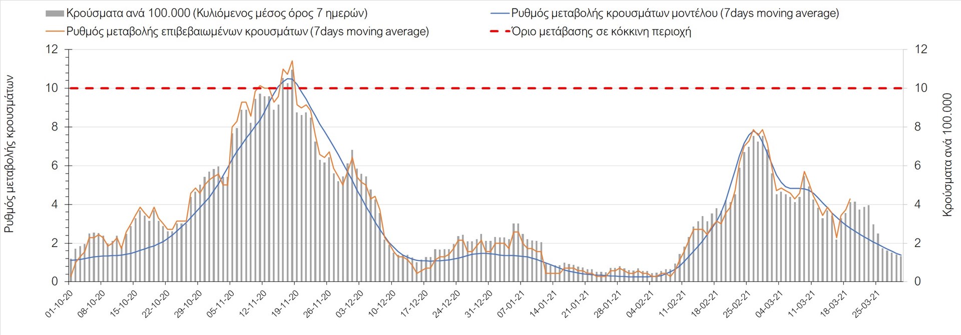 Σχήμα 21. Πορεία του ημερησίου αριθμού των κρουσμάτων (κυλιόμενος μέσος όρος 7 ημερών) στη ΕυρυτανίαΣταθερός σε σχέση με προχθές ήταν ο αριθμός των κρουσμάτων και στα Ιωάννινα με 27 κρούσματα (Σχήμα 22), που έχοντας προ ημερών ξεπεράσει το όριο της κόκκινης περιοχής, φαίνεται να ξεπερνούν την κορύφωση της επιδημικής καμπύλης, όπως είχαμε προβλέψει (είχε τοποθετηθεί στις 10-11 Μαρτίου). Τα Ιωάννινα θα παραμείνουν στις κόκκινες περιοχές μέχρι τις 25 Μαρτίου όμως, άρα χρειάζεται προσοχή στην εφαρμογή των μέτρων αναχαίτισης της επιδημίας. Αντίθετα μείωση παρατηρείται στην Θεσπρωτία καθώς εντοπίστηκαν 5 κρούσματα (Σχήμα 23), ενώ αύξηση παρατηρήθηκε στην Άρτα με 5 κρούσματα (Σχήμα 24).
