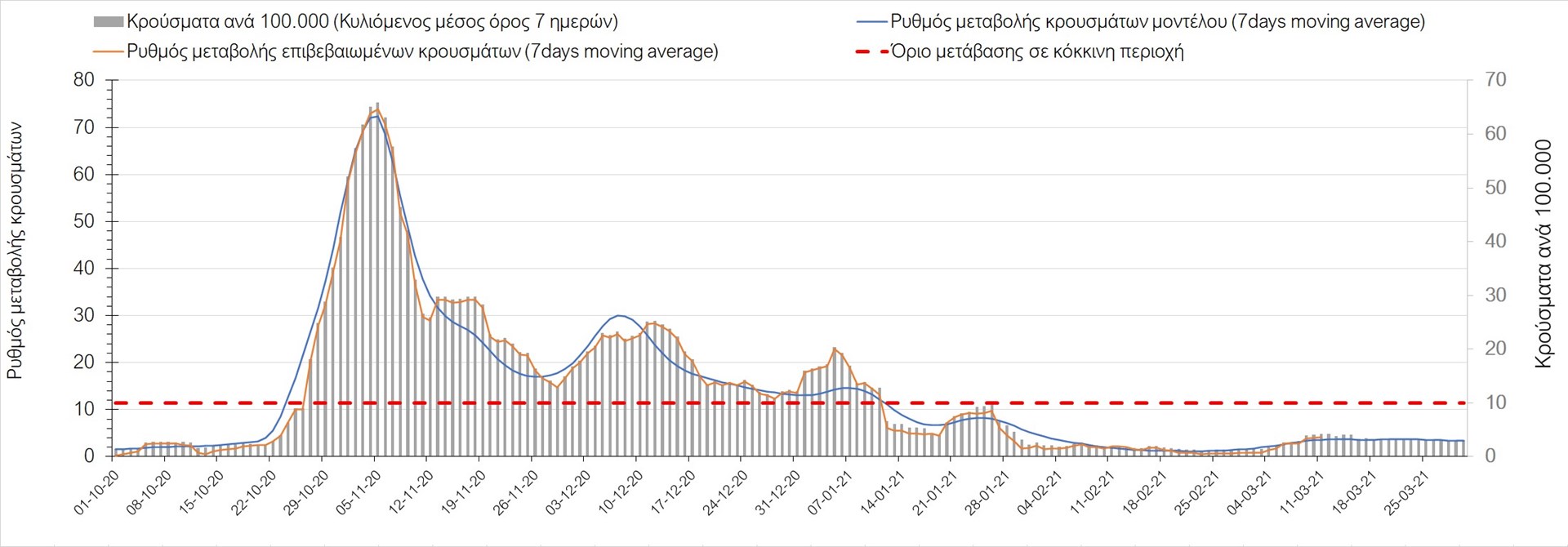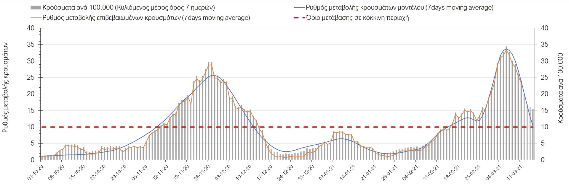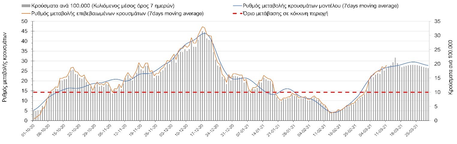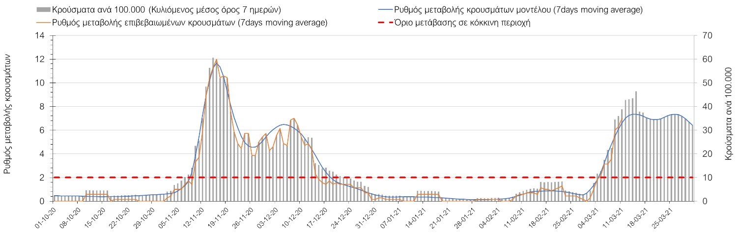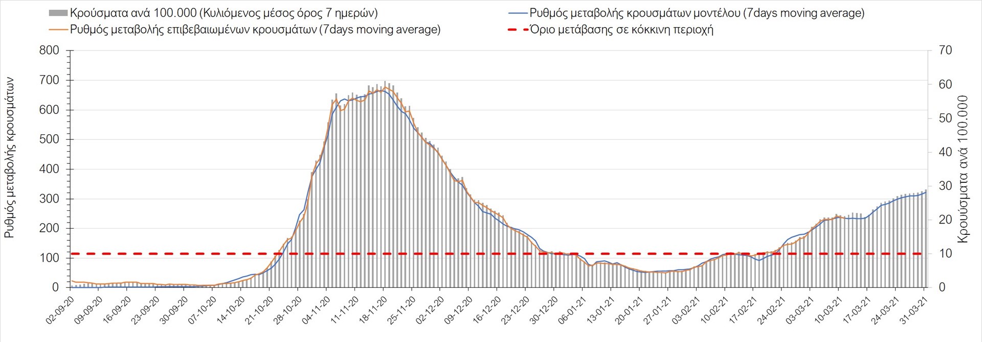 Σχήμα 42. Πορεία του ημερησίου αριθμού των κρουσμάτων (κυλιόμενος μέσος όρος 7 ημερών) στην ΘάσοΣυμπεράσματα:Η αύξηση που παρατηρείται πλέον στον αριθμό των ασθενών σε κρίσιμη κατάσταση (διασωληνομένοι σε ΜΕΘ), καθώς και ο αριθμός των θανάτων (αν και με κάποια μικρή απόκλιση την Πέμπτη) συνάδουν με τις προσομοιώσεις του μοντέλου CORE. Εντούτοις, σημαντικές αποκλίσεις προς τα πάνω παρατηρήθηκαν στον αριθμό των κρουσμάτων στο σύνολο της Ελλάδας, καθώς και στις μεγαλύτερες μητροπολιτικές περιοχές, δηλαδή την Αθήνα και τη Θεσσαλονίκη. Τα παραπάνω αποτελέσματα αποτυπώνονται και στο δείκτη θετικότητας, του οποίου η ημερήσια τιμή παρουσίασε πολύ μεγάλη αύξηση. Σε πανελλαδικό επίπεδο ο κυλιόμενος εβδομαδιαίος μέσος όρος του δείκτη θετικότητας αυξήθηκε στο 5,0% (η ημερήσια τιμή την Πέμπτη ήταν 5,1%) ενώ ο κυλιόμενος εβδομαδιαίος μέσος όρος του πραγματικού αριθμού αναπαραγωγής Rt (δηλαδή ο αριθμός των ατόμων που ένας φορέας μπορεί να επιμολύνει) παρέμεινε στο 1,16 (τιμές του Rt πάνω από τη μονάδα υποδηλώνουν καθαρή αύξηση της διασποράς του ιού στην κοινότητα). Πλέον, με τον υψηλότερο αριθμό φορέων του μεταλλαγμένου στελέχους και την αναθεώρηση στις προβλέψεις, δεν προβλέπεται σύντομα κάμψη του ρυθμού αύξησης, και μπορεί να χρειαστεί να παραταθούν τα περιοριστικά μέτρα και μετά το τέλος Μαρτίου.Με δεδομένο τον πολύ υψηλό αριθμό κρουσμάτων την Πέμπτη, αλλά και το γεγονός ότι πολλές περιοχές συμπεριλαμβανομένου και της Αττικής βρίσκονται ήδη σε lockdown εδώ και μέρες, η πορεία της πανδημίας δεν είναι η αναμενόμενη, γεγονός που στη παρούσα φάση ίσως υποδηλώνει περισσότερο μεγαλύτερη διασπορά των μεταλλαγμένων στελεχών στην κοινότητα και λιγότερο πλημμελή εφαρμογή των μέτρων. Συνεπώς, παρά την επαναπαραμετροποίηση του μοντέλου και την αναθεώρηση των προβλέψεων, είναι επιτακτική η ανάγκη να έχουμε καλύτερη εικόνα της διασποράς τους, έτσι ώστε να μπορέσει να γίνει ορθή αναπροσαρμογή των εκτιμήσεων για την πορεία της πανδημίας στις επόμενες εβδομάδες.Mε βάση τα δεδομένα αυτής της εβδομάδας, καλώς εφαρμόσθηκαν τα περιοριστικά μέτρα που ισχύουν από τις 4 Μαρτίου, τα οποία ίσως χρειαστούν επιπλέον αναθεώρηση, με βάση την επιδημιολογική εικόνα που θα επικρατήσει, ενώ επίσης καλώς εφαρμόσθηκε το lockdown στην Αθήνα μέχρι τις 15 Μαρτίου. Με τα μέχρι τώρα δεδομένα, τα μέτρα αυτά φαίνονται να είναι προς τη σωστή κατεύθυνση, και αναμένουμε να δούμε εάν θα αποδειχθούν ικανά και στην πράξη να αναχαιτίσουν την επέλαση ενός τρίτου κύματος, εν αναμονή και επιπλέον στοιχείων, τόσο για τη μεταδοτικότητα του στελέχους B.1.1.7. του SARS-CoV-2, όσο και της διασποράς του στην κοινότητα, οπότε συνολικά προτείνουμε την εφαρμογή καθολικού lockdown σε όλη τη χώρα, ώστε να αναχαιτιστεί η διαφαινόμενη ανοδική πορεία που διαμορφώνεται. Η πρόταση αυτή υποστηρίζεται και από το υψηλό ποσοστό πληρότητας των ΜΕΘ, των οποίων οι ανάγκες αναμένεται να συνεχίσουν να αυξάνουν.Παρά την εφαρμογή οριζόντιων μέτρων ανάσχεσης της πανδημίας που εφαρμόσθηκαν από τα τέλη Οκτωβρίου, η πορεία της τελευταίας διαφοροποιείται από περιοχή σε περιοχή. Οι παραπάνω παρατηρήσεις τείνουν στο συμπέρασμα ότι η διαχείριση του υγειονομικού κινδύνου θα πρέπει να εξεταστεί σε τοπικό επίπεδο. Πλέον προβληματίζουν πέρα από την Αττική, η Αχαΐα, η Αιτωλοακαρνανία, η Εύβοια, η Βοιωτία, η Θάσος, η Χαλκιδική, καθώς επίσης η Αρκαδία, 