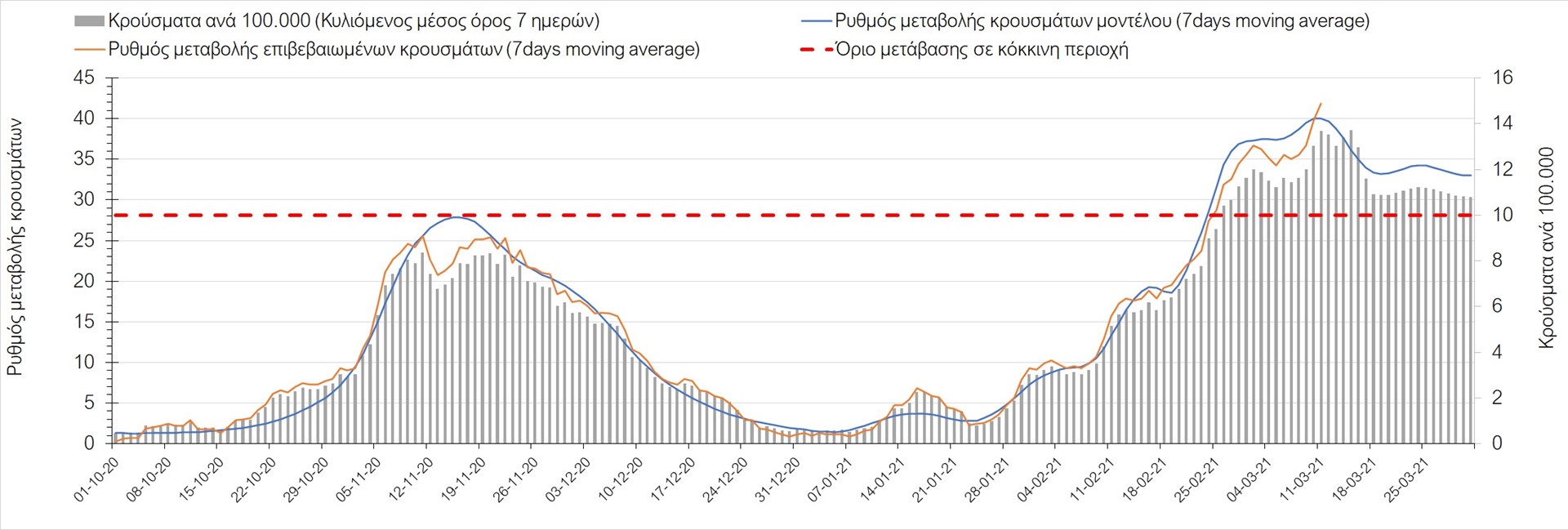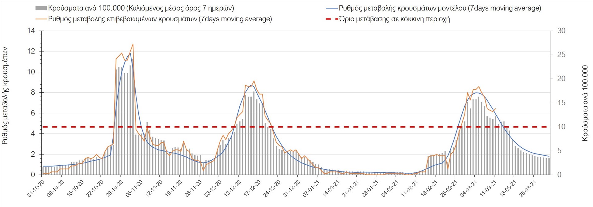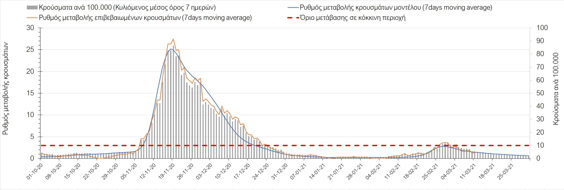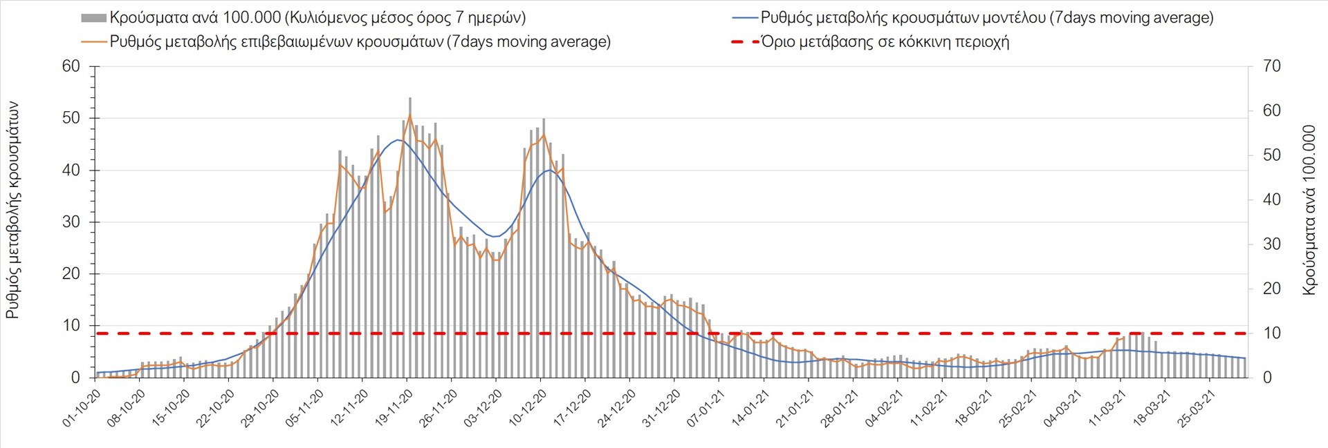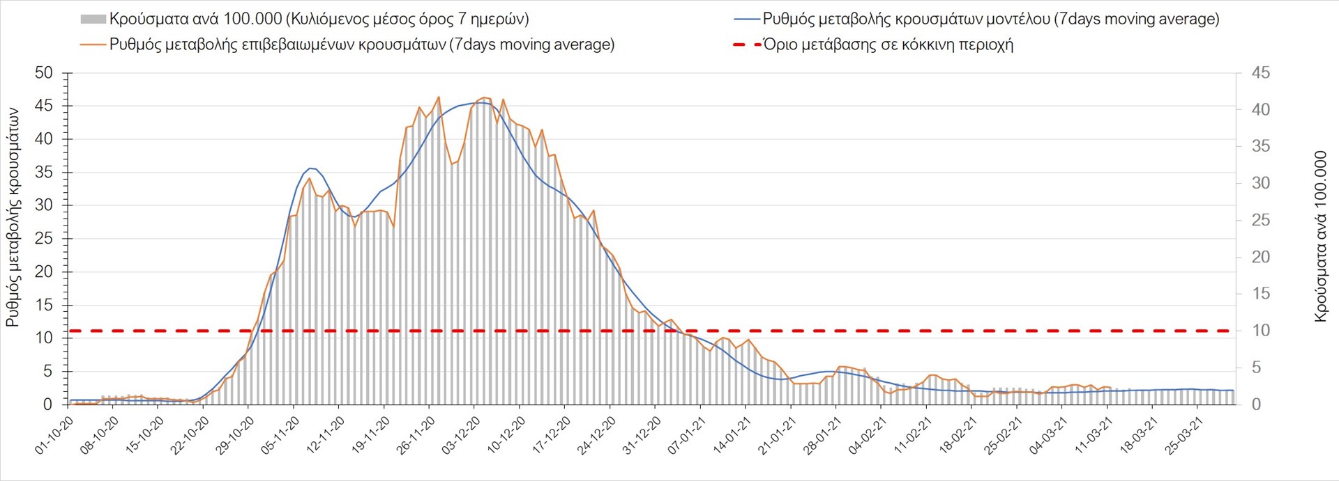 Σχήμα 42. Πορεία του ημερησίου αριθμού των κρουσμάτων (κυλιόμενος μέσος όρος 7 ημερών) στην ΘάσοΣυμπεράσματα:Η αύξηση που παρατηρείται πλέον στον αριθμό των ασθενών σε κρίσιμη κατάσταση (διασωληνομένοι σε ΜΕΘ), καθώς και ο αριθμός των θανάτων (αν και με κάποια μικρή απόκλιση την Πέμπτη) συνάδουν με τις προσομοιώσεις του μοντέλου CORE. Εντούτοις, σημαντικές αποκλίσεις προς τα πάνω παρατηρήθηκαν στον αριθμό των κρουσμάτων στο σύνολο της Ελλάδας, καθώς και στις μεγαλύτερες μητροπολιτικές περιοχές, δηλαδή την Αθήνα και τη Θεσσαλονίκη. Τα παραπάνω αποτελέσματα αποτυπώνονται και στο δείκτη θετικότητας, του οποίου η ημερήσια τιμή παρουσίασε πολύ μεγάλη αύξηση. Σε πανελλαδικό επίπεδο ο κυλιόμενος εβδομαδιαίος μέσος όρος του δείκτη θετικότητας αυξήθηκε στο 5,0% (η ημερήσια τιμή την Πέμπτη ήταν 5,1%) ενώ ο κυλιόμενος εβδομαδιαίος μέσος όρος του πραγματικού αριθμού αναπαραγωγής Rt (δηλαδή ο αριθμός των ατόμων που ένας φορέας μπορεί να επιμολύνει) παρέμεινε στο 1,16 (τιμές του Rt πάνω από τη μονάδα υποδηλώνουν καθαρή αύξηση της διασποράς του ιού στην κοινότητα). Πλέον, με τον υψηλότερο αριθμό φορέων του μεταλλαγμένου στελέχους και την αναθεώρηση στις προβλέψεις, δεν προβλέπεται σύντομα κάμψη του ρυθμού αύξησης, και μπορεί να χρειαστεί να παραταθούν τα περιοριστικά μέτρα και μετά το τέλος Μαρτίου.Με δεδομένο τον πολύ υψηλό αριθμό κρουσμάτων την Πέμπτη, αλλά και το γεγονός ότι πολλές περιοχές συμπεριλαμβανομένου και της Αττικής βρίσκονται ήδη σε lockdown εδώ και μέρες, η πορεία της πανδημίας δεν είναι η αναμενόμενη, γεγονός που στη παρούσα φάση ίσως υποδηλώνει περισσότερο μεγαλύτερη διασπορά των μεταλλαγμένων στελεχών στην κοινότητα και λιγότερο πλημμελή εφαρμογή των μέτρων. Συνεπώς, παρά την επαναπαραμετροποίηση του μοντέλου και την αναθεώρηση των προβλέψεων, είναι επιτακτική η ανάγκη να έχουμε καλύτερη εικόνα της διασποράς τους, έτσι ώστε να μπορέσει να γίνει ορθή αναπροσαρμογή των εκτιμήσεων για την πορεία της πανδημίας στις επόμενες εβδομάδες.Mε βάση τα δεδομένα αυτής της εβδομάδας, καλώς εφαρμόσθηκαν τα περιοριστικά μέτρα που ισχύουν από τις 4 Μαρτίου, τα οποία ίσως χρειαστούν επιπλέον αναθεώρηση, με βάση την επιδημιολογική εικόνα που θα επικρατήσει, ενώ επίσης καλώς εφαρμόσθηκε το lockdown στην Αθήνα μέχρι τις 15 Μαρτίου. Με τα μέχρι τώρα δεδομένα, τα μέτρα αυτά φαίνονται να είναι προς τη σωστή κατεύθυνση, και αναμένουμε να δούμε εάν θα αποδειχθούν ικανά και στην πράξη να αναχαιτίσουν την επέλαση ενός τρίτου κύματος, εν αναμονή και επιπλέον στοιχείων, τόσο για τη μεταδοτικότητα του στελέχους B.1.1.7. του SARS-CoV-2, όσο και της διασποράς του στην κοινότητα, οπότε συνολικά προτείνουμε την εφαρμογή καθολικού lockdown σε όλη τη χώρα, ώστε να αναχαιτιστεί η διαφαινόμενη ανοδική πορεία που διαμορφώνεται. Η πρόταση αυτή υποστηρίζεται και από το υψηλό ποσοστό πληρότητας των ΜΕΘ, των οποίων οι ανάγκες αναμένεται να συνεχίσουν να αυξάνουν.Παρά την εφαρμογή οριζόντιων μέτρων ανάσχεσης της πανδημίας που εφαρμόσθηκαν από τα τέλη Οκτωβρίου, η πορεία της τελευταίας διαφοροποιείται από περιοχή σε περιοχή. Οι παραπάνω παρατηρήσεις τείνουν στο συμπέρασμα ότι η διαχείριση του υγειονομικού κινδύνου θα πρέπει να εξεταστεί σε τοπικό επίπεδο. Πλέον προβληματίζουν πέρα από την Αττική, η Αχαΐα, η Αιτωλοακαρνανία, η Εύβοια, η Βοιωτία, η Θάσος, η Χαλκιδική, καθώς επίσης η Αρκαδία, 