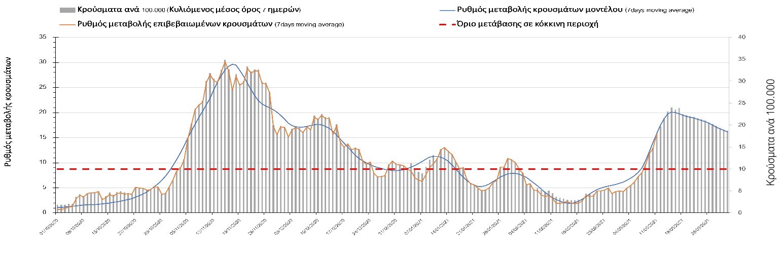Σύμφωνα με τα στοιχεία του ΕΟΔΥ, ο αριθμός κρουσμάτων την Πέμπτη ανήλθε στα 2570 νέα κρούσματα, με τα αποτελέσματα να συνάδουν με τις προβλέψεις της υπολογιστικής πλατφόρμας CORE (n=2523), μετά την αναγκαία επαναπαραμετροποίηση του μοντέλου, έτσι ώστε να συμπεριληφθεί η πιο μεγάλη διασπορά των μεταλλαγμένων στελεχών στην κοινότητα. Ο αριθμός των τεστ που πραγματοποιήθηκαν ήταν 50.078 και σε συνδυασμό με τον αριθμό των κρουσμάτων, ο δείκτης θετικότητας διαμορφώθηκε την Πέμπτη στο 5,1%. Η πραγματοποίηση αριθμού τεστ σε επίπεδα άνω των 50.000 την ημέρα (όπως και πραγματοποιείται τις τελευταίες ημέρες), συντελεί στο να εξάγουμε πιο ασφαλή συμπεράσματα σχετικά με την πορεία της πανδημίας. Γενικά όμως θα πρέπει να αυξηθεί κι άλλο ο αριθμός των τεστ ανίχνευσης του SARS-CoV-2 χρησιμοποιώντας τα rapid test για να καταπολεμηθεί η δυναμική αύξησης της διασποράς στις περιοχές όπου μια τέτοια αύξηση διαφαίνεται από τα μέχρι τώρα δεδομένα και την υπολογιστική πλατφόρμα CORE. Επειδή και την Πέμπτη ο δείκτης θετικότητας παρέμεινε σε υψηλά επίπεδα, δυστυχώς επιβεβαιώνεται ότι η διασπορά των μεταλλαγμένων στην κοινότητα είναι πολύ μεγαλύτερη από αυτή που είχε αποτυπωθεί με βάση τα τελευταία διαθέσιμα δεδομένα και πραγματοποιήθηκε επαναπαραμετροποίηση του μοντέλου στα νέα δεδομένα και επικαιροποίηση των προβλέψεων, οι οποία έλαβε υπόψη επίσης τη πιθανή παράταση του lockdown έως και τις 29 Μαρτίου. Η διαφαινόμενη αυτή παράταση είναι απόρροια της επιβαρυμένης επιδημιολογικής εικόνας, όπως αυτή αποτυπώνεται τόσο στον αριθμό των νέων κρουσμάτων που αποτυπώνονται καθημερινά, όσο και στην επιβάρυνση του συστήματος υγείας και ιδιαίτερα της πληρότητας των κλινών ΜΕΘ.