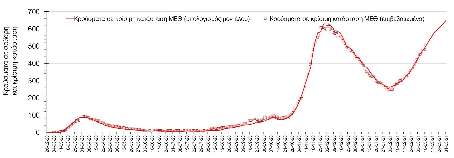Όσον αφορά στους ασθενείς σε κρίσιμη κατάσταση (διασωληνωμένοι σε ΜΕΘ), την Πέμπτη ο αριθμός τους αυξήθηκε σε σχέση με την Τετάρτη (506 από 479), ενώ αναμένεται να φτάσουν στους περίπου 590 μέχρι τις 25 Μαρτίου με βάση την επικαιροποιημένη πρόβλεψη. Η καμπύλη εξέλιξης του αριθμού των ασθενών με βάση τις προσομοιώσεις της πλατφόρμας CORE, όπως αυτή παρουσιάζεται στο Σχήμα 1, ενώ μια εκτίμηση για την πορεία των θανάτων ανά ημέρα παρουσιάζεται στο Σχήμα 2.