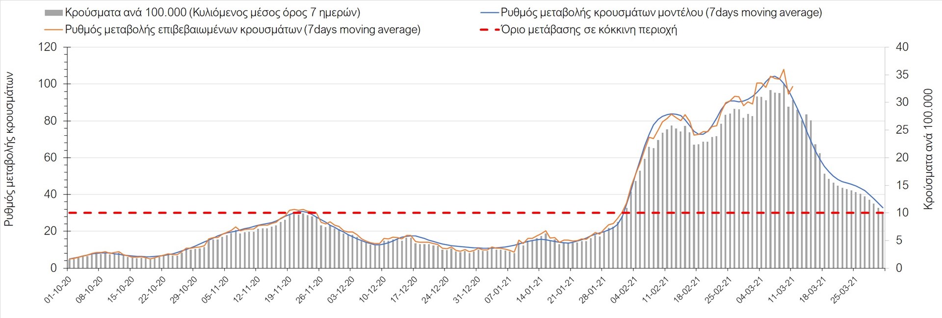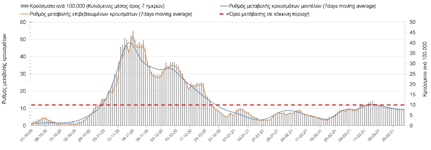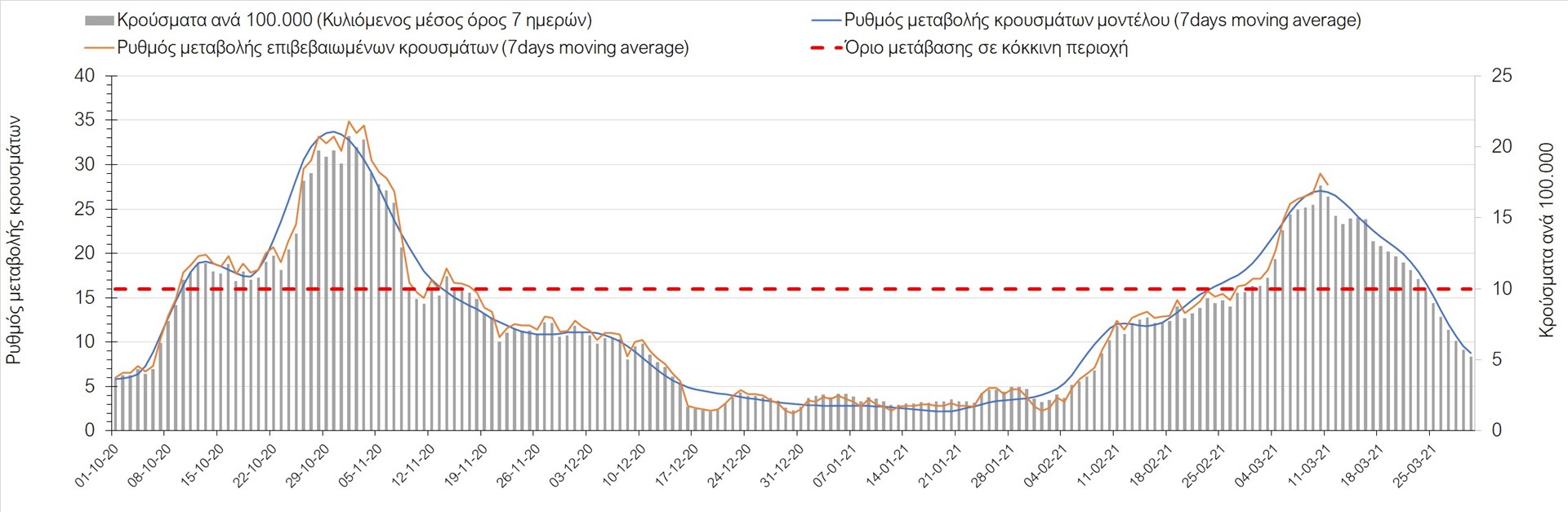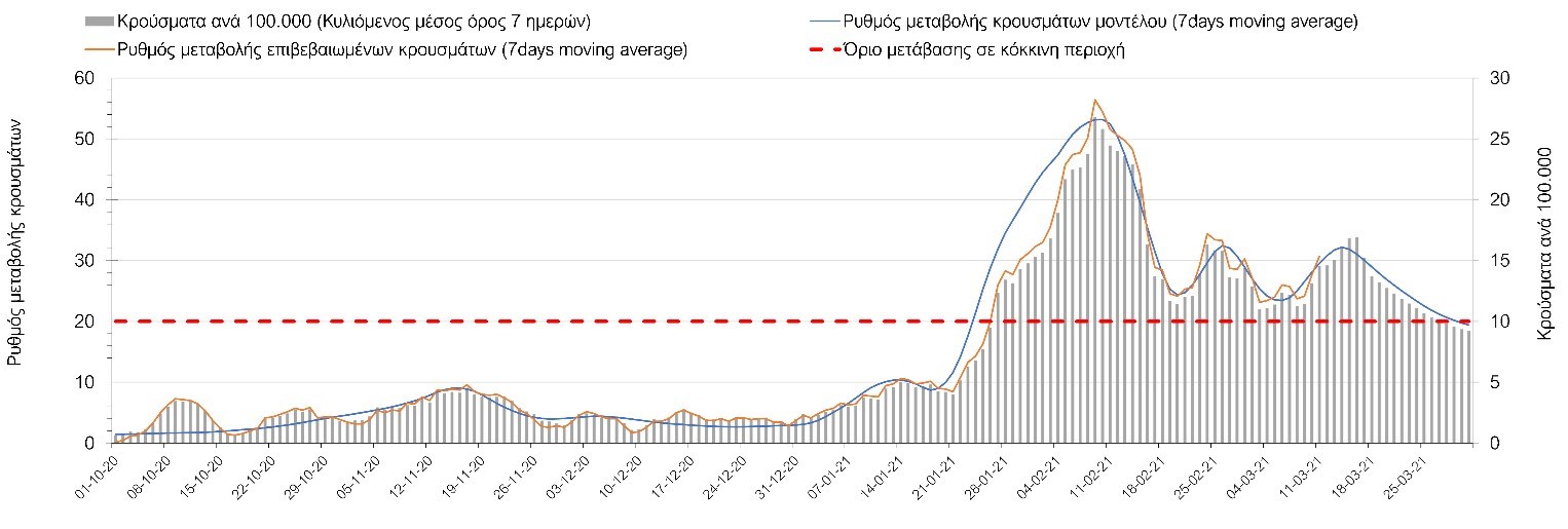 Σχήμα 28. Πορεία του ημερησίου αριθμού των κρουσμάτων (κυλιόμενος μέσος όρος 7 ημερών) στην Πιερία