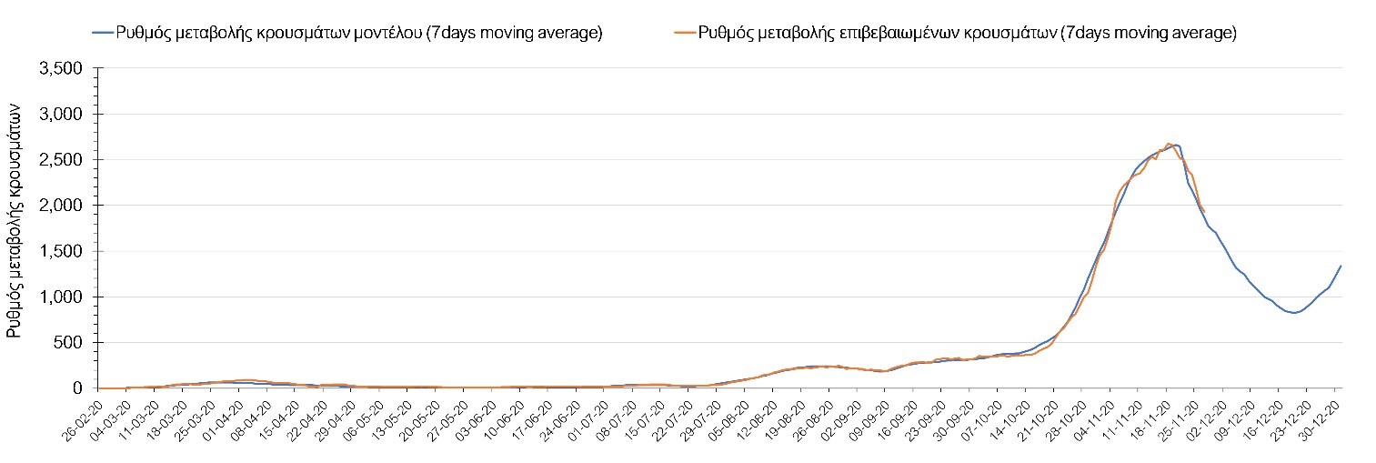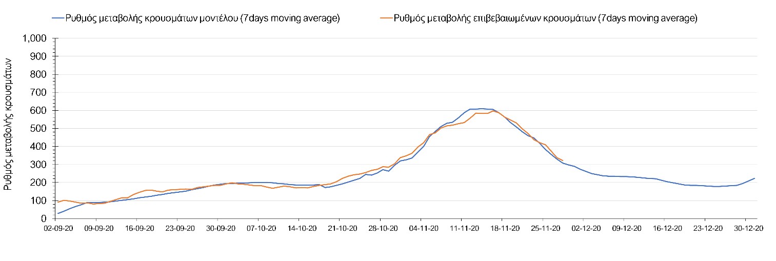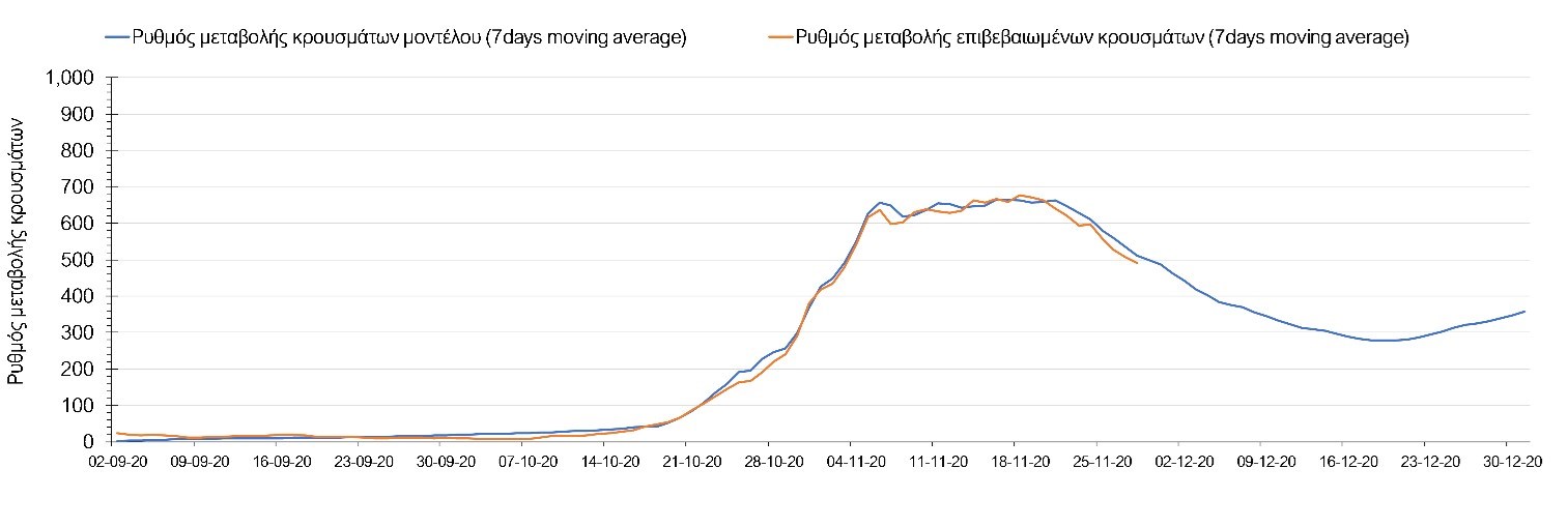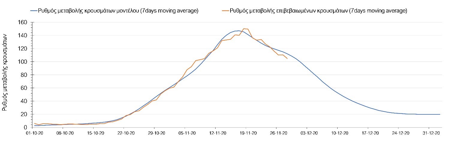 Η συνολική πορεία των κρουσμάτων, αλλά και η αντιστροφή της πορείας του αριθμού των ασθενών σε κρίσιμη κατάσταση (διασωληνωμένοι σε ΜΕΘ), τείνουν να επιβεβαιώσουν την αισιοδοξία μας για τη συνέχιση της πτωτικής πορείας. Διαφαίνεται ότι εάν συνεχιστεί η ίδια πορεία και με διατήρηση του lockdown μέχρι και τις 14 του Δεκεμβρίου, θα φθάσουμε σε μέση εβδομαδιαία τιμή στα 1000 κρούσματα. Συνεχίζουμε όμως να είμαστε επιφυλακτικοί για την κατάσταση που θα μπορούσε να επιφέρει η μη ελεγχόμενη μερική άρση του lockdown στην περίοδο των γιορτών, υποβοηθούμενη τόσο από τις χαμηλές θερμοκρασίες που επικρατούν στο τέλος Δεκεμβρίου, όσο και από την ψυχολογική κόπωση των πολιτών, αλλά και την τάση που θα υπάρχει για οικογενειακές συγκεντρώσεις