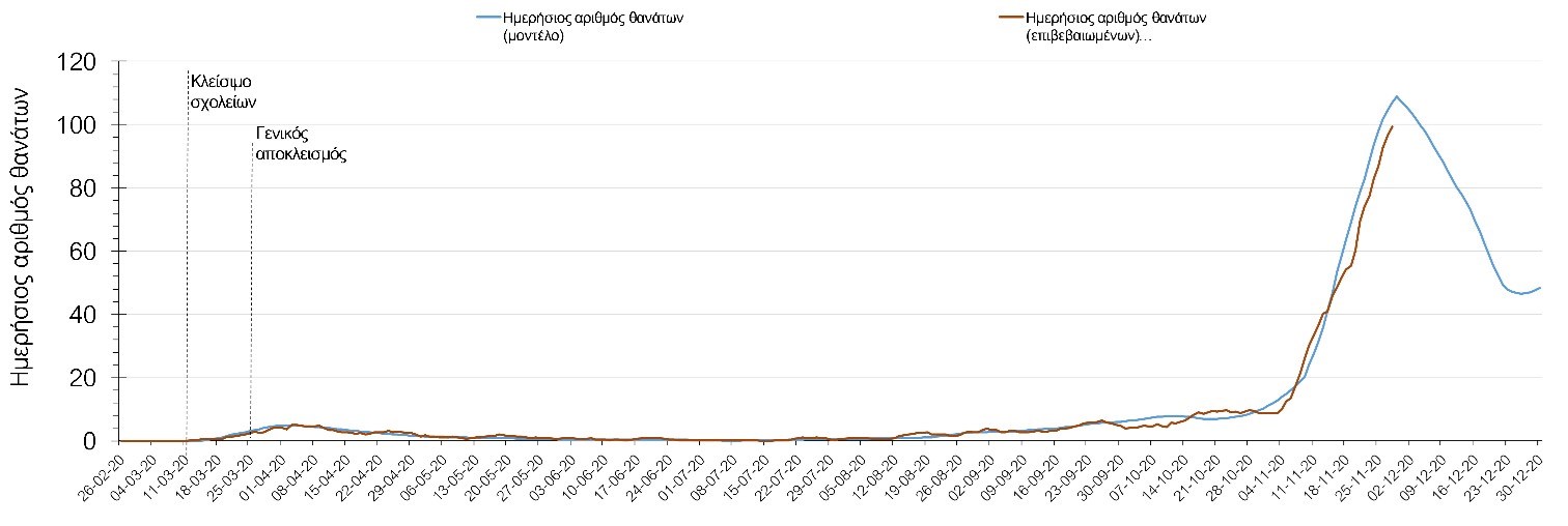 Το Σάββατο όμως παρατηρήθηκε ο υψηλότερος αριθμός θανάτων (121). Αυτό υποδηλώνει ότι μέχρι και πριν 2 εβδομάδες, ο ρυθμός μετάδοσης της νόσου ήταν υψηλός, καταδεικνύοντας την πλημμελή εφαρμογή του lockdown από τους πολίτες τις πρώτες 10 ημέρες της εφαρμογής του. Ο υψηλός αριθμός των θανάτων σε συνδυασμό και με την έντονη πτώση των επιβεβαιωμένων κρουσμάτων που παρατηρείται αυτές τις ημέρες σε σχέση με την προηγούμενη εβδομάδα μπορεί να ερμηνευθεί από το γεγονός ότι έγινε πιο συνεπής εφαρμογή του lockdown μετά τις 17-18 Νοεμβρίου, περίπου 10 μέρες μετά την ανακοίνωση του. Με βάση τα παραπάνω αναμένεται να αρχίσει να πέφτει ο αριθμός των θανάτων ανά ημέρα μετά από τις επόμενες 4-5 ημέρες.