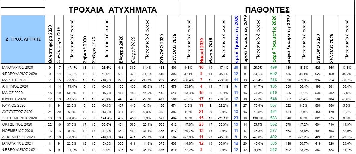 Αύξηση σημείωσαν τα σοβαρά τροχαία τον Φεβρουάριο του 2021 από 10 το 2020 σε 12 το 2021 (20%), ενώ ανησυχία πρέπει να προκαλεί το γεγονός ότι εν μέσω lockdown και περιορισμών στις μετακινήσεις σημειώθηκαν 8 θανατηφόρα τροχαία ενώ τον Φεβρουάριο του 2020, που δεν ίσχυαν οι περιορισμοί, είχαν προκληθεί 9 θανατηφόρα. Οι νεκροί στα αντίστοιχα τροχαία ήταν 9 τον Φεβρουάριο του 2021 αλλά 9 και τον Φεβρουάριο του 2020, που ο κορονοϊός δεν είχε ακόμη ξεσπάσει στην Ελλάδα. Επίσης, για τον ίδιο μήνα, οι βαριά τραυματίες ήταν ακριβώς όσο και έναν χρόνο πριν, 12, καταγράφοντας μηδενική ποσοστιαία διαφορά.