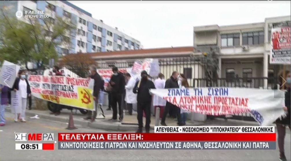 Σε κινητοποιήσεις προχωρούν σήμερα γιατροί και νοσηλευτές σε Αθήνα, Θεσσαλονίκη και Πάτρα. H ΠΟΕΔΗΝ έχει προγραμματίσει δίωρη στάση εργασίας από τις 08.00 έως τις 10.00 π.μ. και στο πλαίσιο αυτό οι υγειονομικοί κάνουν συγκεντρώσεις στους αύλειους χώρους των νοσοκομείων. Γιατροί και νοσηλευτές διαμαρτύρονται για τα προβλήματα στον τομέα της Υγείας εν μέσω της πανδημίας του κορονοϊού. Μεταξύ άλλων, ζητούν ενίσχυση του δημοσίου συστήματος Υγείας με προσλήψεις και ΜΕΘ, ενώ ζητούν και την πραγματοποίηση rapid test σε όλους τους υγειονομικούς.