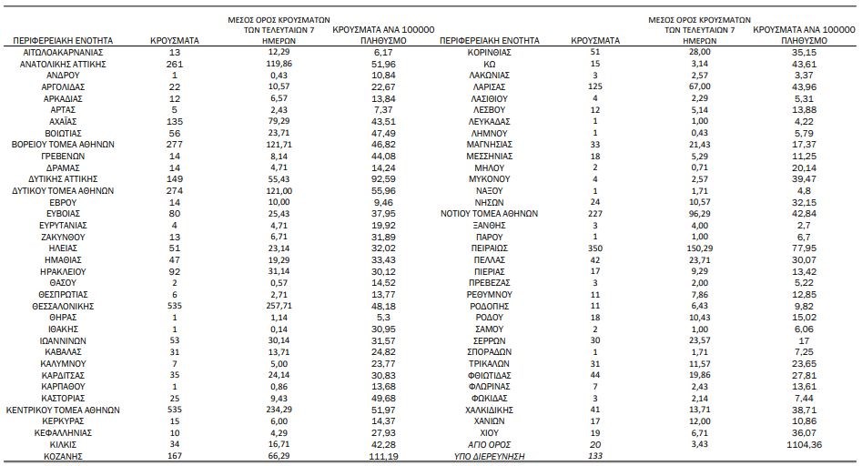 Συγκεκριμένα, το κέντρο της πρωτεύουσας φαίνεται να αντιμετωπίζει το μεγαλύτερο πρόβλημα, με τον Κεντρικό Τομέα Αθηνών να καταγράφει 535 νέες μολύνσεις. Επιπλέον, 350 κρούσματα δίνει ο Πειραιάς, 277 ο Βόρειος Τομέας Αθηνών, 274 ο Δυτικός Τομέας Αθηνών, 261 η Ανατολική Αττική, 227 ο Νότιος Τομέας Αθηνών και 149 η Δυτική Αττική.