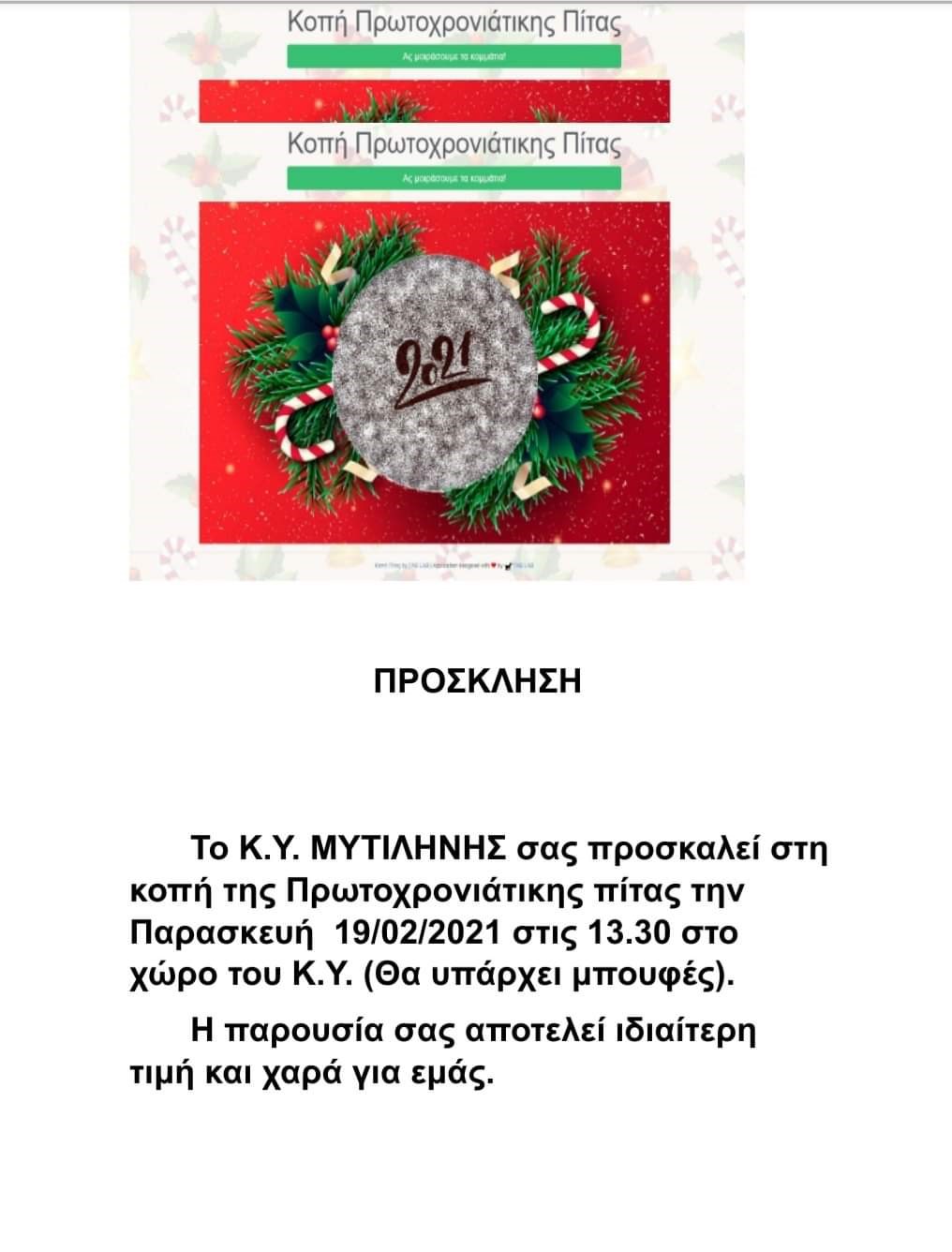 Σε μία κίνηση που δεν χωρά ο ανθρώπινος νους προχωρά το Κέντρο Υγείας Μυτιλήνης, το οποίο εν μέσω πανδημίας διοργανώνει εκδήλωση κοπής της πρωτοχρονιάτικης πίτας στις 19 Φεβρουαρίου με την πρόσκληση να αναφέρει πως θα υπάρχει και μπουφές.
