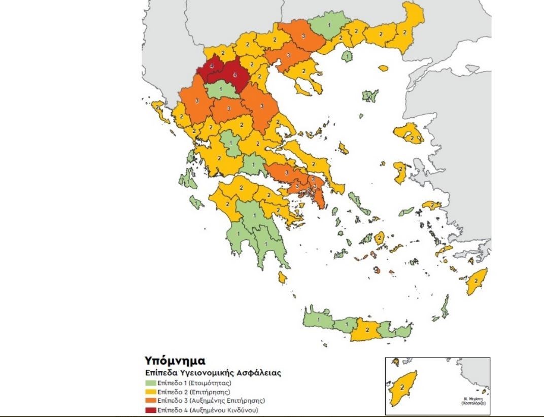 2 Περιφερειακές Ενότητες στο επίπεδο 4( Αυξημένου Κινδύνου) καμία περιοχή δεν ήταν σε αυτό το βαθμό συναγερμού πριν 14 μέρες.