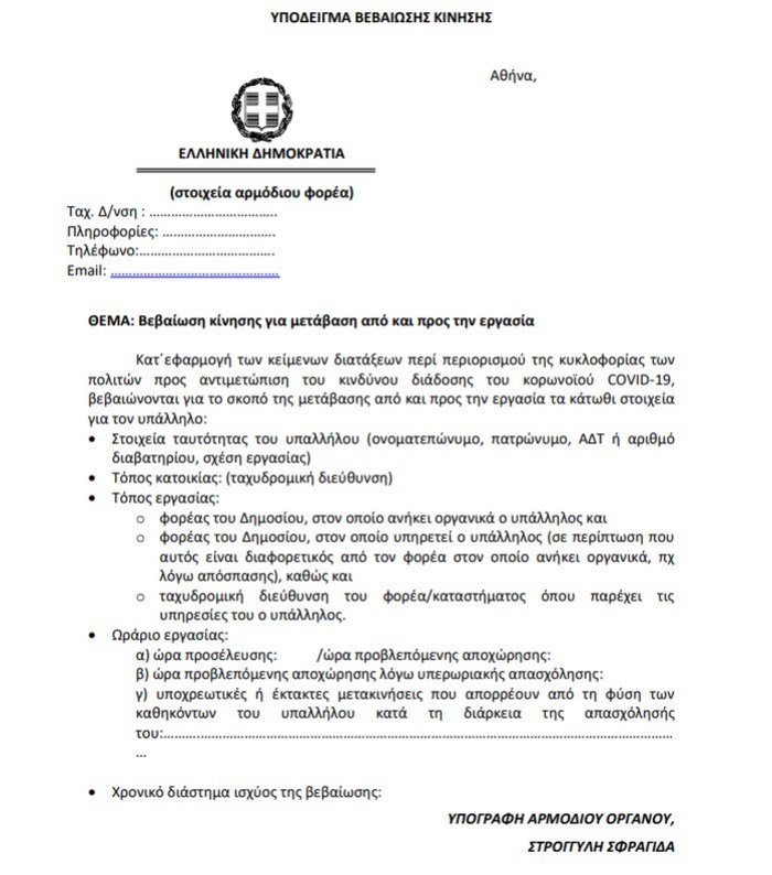 -Οι δημόσιοι υπάλληλοι για την κατ’ εξαίρεση μετακίνησή τους πρέπει να φέρουν υποχρεωτικά μαζί τους την αστυνομική τους ταυτότητα ή διαβατήριο καθώς και βεβαίωση κίνησης σε έντυπη ή ηλεκτρονική μορφή. Η βεβαίωση κίνησης χορηγείται μέσω της εφαρμογής του μητρώου ανθρώπινου δυναμικού ελληνικού δημοσίου στην ιστοσελίδα apografi.gov.gr και κατ’ εξαίρεση με βεβαίωση που συντάσσεται με ευθύνη του αρμόδιου προϊστάμενου προσωπικού. Το έγγραφο που χρειάζονται οι δημόσιοι υπάλληλοι