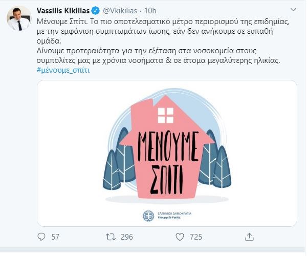 Στον προσωπικό του λογαριασμό στο Twitter, ο υπουργός Υγείας, Βασίλης Κικίλιας ανέβασε τη φωτογραφία που απεικονίζει ένα σπίτι που πάνω γράφει “Μένουμε Σπίτι” και ανέφερε χαρακτηριστικά: