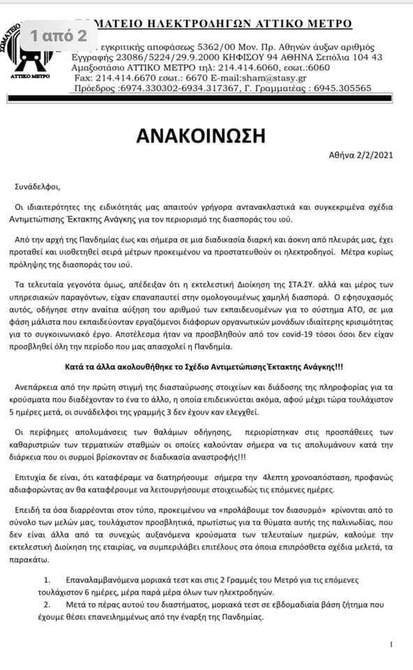 «Τα τελευταία γεγονότα απέδειξαν ότι η εκτελεστική διοίκηση της ΣΤΑΣΥ, αλλά και μέρος των υπηρεσιακών παραγόντων είχαν επαναπαυτεί στην ομολογουμένως χαμηλή διασπορά. Ο εφησυχασμός αυτός οδήγησε στην αναίτια αύξηση του αριθμού των εκπαιδευομένων για το σύστημα ΑΤΟ, σε μια φάση μάλιστα που εκπαιδεύονταν εργαζόμενοι διάφορών οργανωτικών μονάδων ιδιαίτερης κρισιμότητας για το συγκοινωνιακό έργο. Αποτέλεσμα ήταν να προσβληθούν από τον covid-19 τόσοι όσοι δεν είχαν προσβληθεί όλη την περίοδο που μας απασχολεί η πανδημία» επισημαίνει στην ανακοίνωσή του το Σωματείο Ηλεκτροδηγών της Αττικό Μετρό.