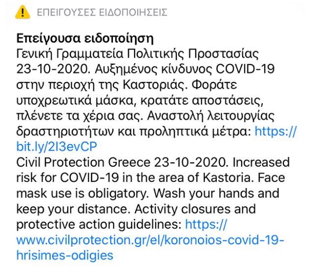 Μήνυμα στους κατοίκους της Καστοριάς έστειλε η Γενική Γραμματεία Πολιτικής Προστασίας μέσω του 112, λίγες μόλις ώρες μετά την εφαρμογή του τοπικού lockdown λόγω κορονοϊού.