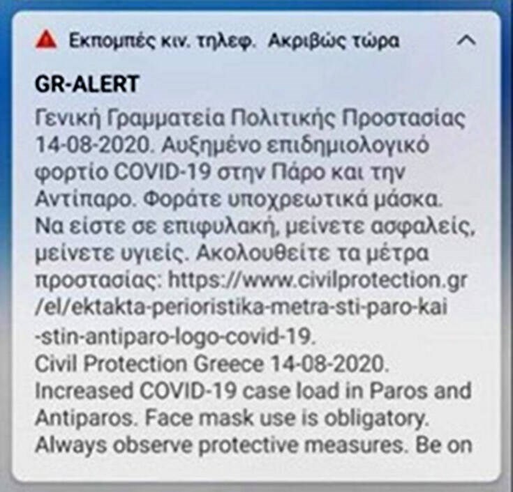 Το μήνυμα αποστέλλεται στην ελληνική και αγγλική γλώσσα και εφιστά την προσοχή των πολιτών στην τήρηση των νέων μέτρων υγειονομικής ασφάλειας λόγω αυξημένου επιδημιολογικού φορτίου στα δύο νησιά.