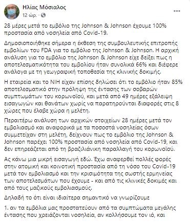 Το εμβόλιο της Johnson & Johnson παρέχει 100% προστασία από νοσηλεία για COVID – 19 και δεν επηρεάζεται από τη βραζιλιάνικη μετάλλαξη του κορονοϊού, όπως δείχνει η ανάλυση των αρχικών στοιχείων 28 ημέρες μετά τον εμβολιασμό, όσον αφορά τα ποσοστά νοσηλείας αυτών που συμμετείχαν σε σχετική μελέτη, σημειώνει σε ανάρτησή του στον προσωπικό του λογαριασμό στο Facebook ο καθηγητής Πολιτικής της Υγείας της Σχολής Οικονομικών και Πολιτικών Επιστημών του Λονδίνου (LSE), Ηλίας Μόσιαλος, αναφερόμενος στα στοιχεία της έκθεσης της συμβουλευτικής επιτροπής εμβολίων του FDA των ΗΠΑ για το συγκεκριμένο εμβόλιο, η οποία δόθηκε στη δημοσιότητα την Τετάρτη.
