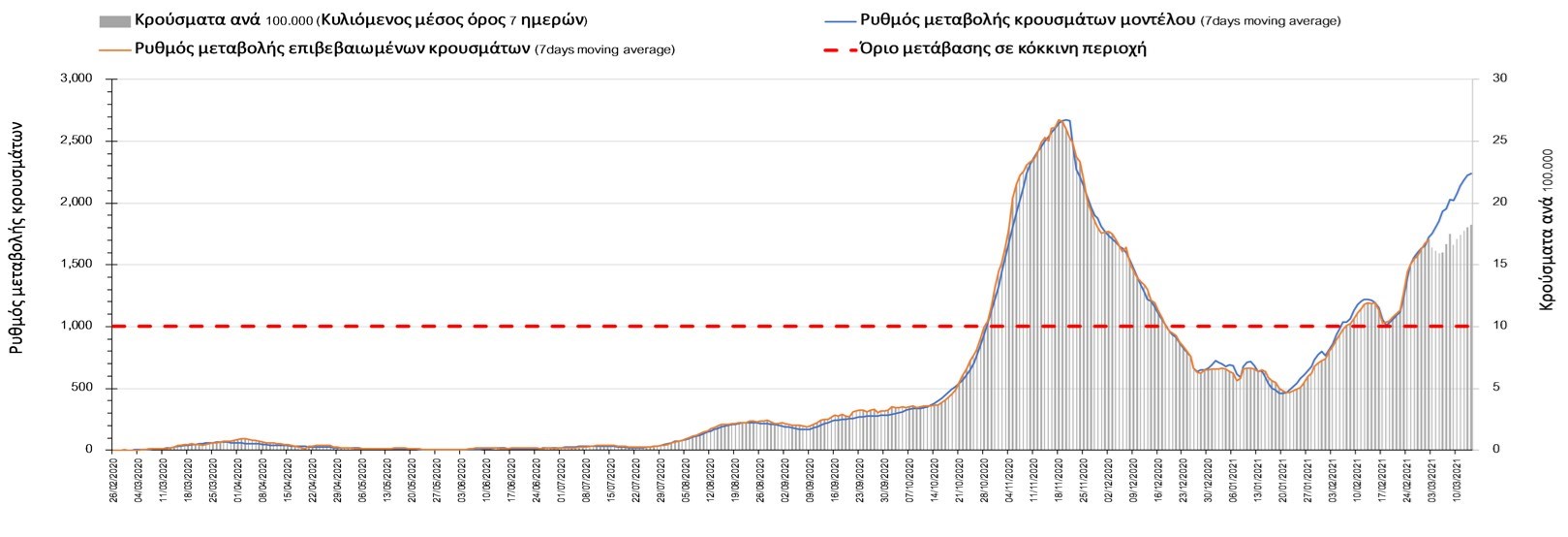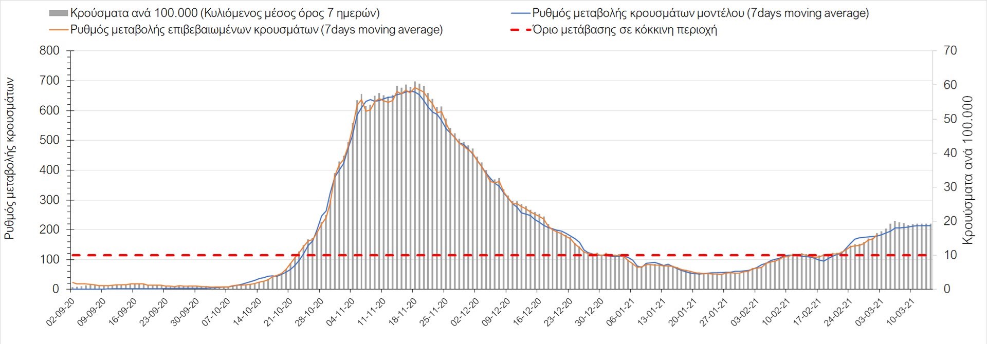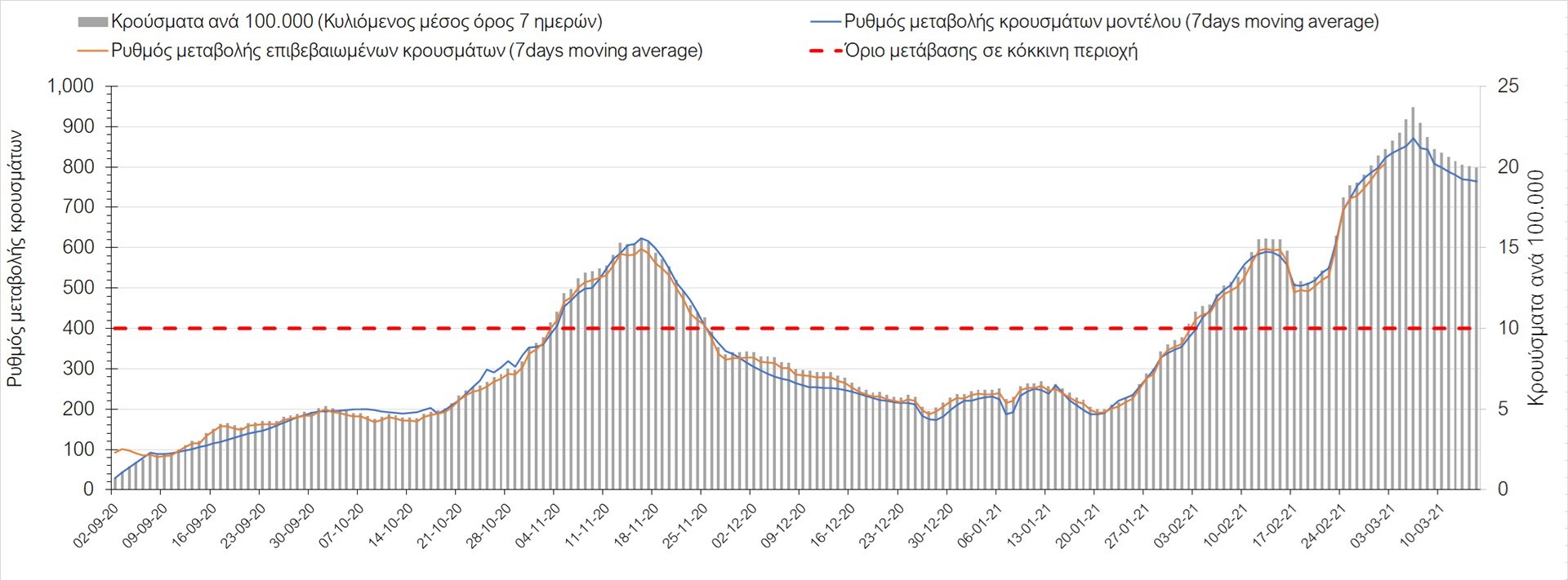 Πορεία του ημερησίου αριθμού των κρουσμάτων (κυλιόμενος μέσος όρος 7 ημερών) στην Ελληνική επικράτεια