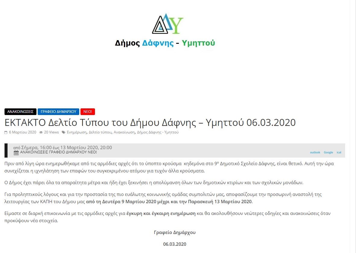 Σε ανακοίνωση του ο Δήμος Δάφνης – Υμηττού επιβεβαίωσε πριν από λίγο το θετικό δείγμα κορονοϊού για γονέα μαθητή στο 9ο Δημοτικό Σχολείο Δάφνης. Ανέφερε επίσης ότι «αυτή την ώρα την ώρα συνεχίζεται η ιχνηλάτηση των επαφών του συγκεκριμένου ατόμου για τυχόν άλλα κρούσματα» τονίζοντας ότι «ο Δήμος έχει πάρει όλα τα απαραίτητα μέτρα και ήδη έχει ξεκινήσει η απολύμανση όλων των δημοτικών κτιρίων και των σχολικών μονάδων».