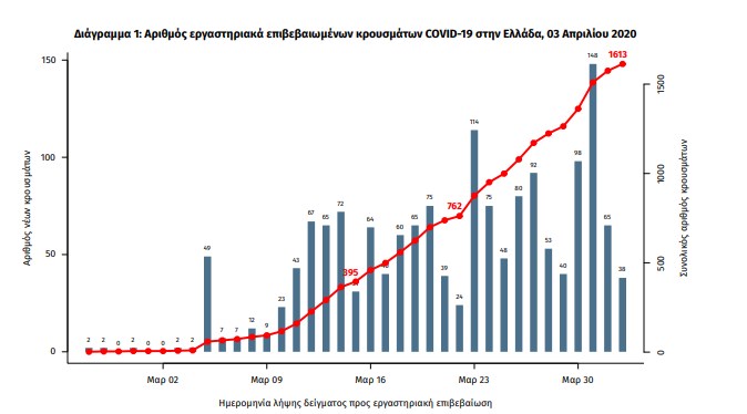 Τα νέα επιβεβαιωμένα εργαστηριακά κρούσματα της νόσου είναι 99. 1 Ο συνολικός αριθμός των κρουσμάτων ανέρχεται σε 1613 (ημερήσια μεταβολή +6.5%), εκ των οποίων 54.4% άνδρες. Ο αριθμός των ασθενών που νοσηλεύονται διασωληνωμένοι είναι 92 (76.9% άνδρες). Η ημερήσια κατανομή των επιβεβαιωμένων κρουσμάτων είναι η ακόλουθη (η γραμμή παριστάνει την συνολική, αθροιστική κατανομή των κρουσμάτων). Από το σύνολο των 1613 κρουσμάτων, 335 (20.8%) θεωρούνται σχετιζόμενα με ταξίδι από το εξωτερικό και 563 (34.9%) είναι σχετιζόμενα με ήδη γνωστό κρούσμα και τα υπόλοιπα δεν σχετίζονται ούτε με ταξίδι ούτε με άλλο γνωστό κρούσμα ή είναι ακόμα υπό διερεύνηση.