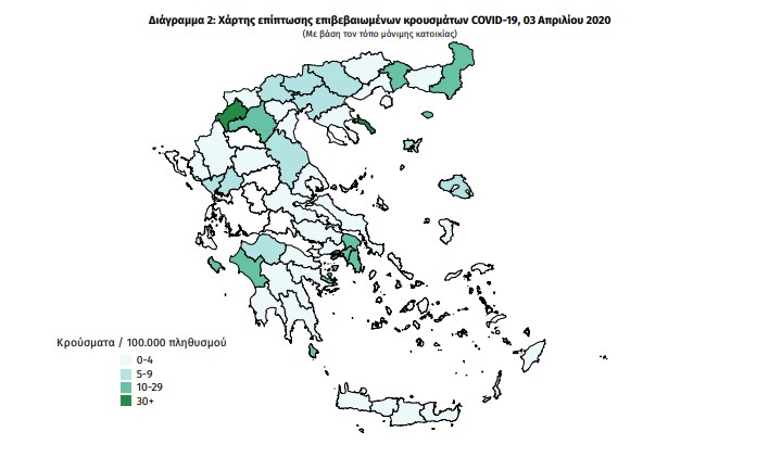 Την εξάπλωση του κορονοϊού στην Ελλάδα αποτυπώνει η έκθεση του ΕΟΔΥ για την επιδημιολογική επιτήρηση της νόσου, που εκδόθηκε την Παρασκευή. Τα στοιχεία που παρουσιάζονται αφορούν σε περιστατικά από το νέο κορονοϊό (COVID19), με βάση τα δεδομένα που έχουν δηλωθεί στον ΕΟΔΥ και καταγραφεί μέχρι τις 03 Απριλίου και ώρα 15:00.