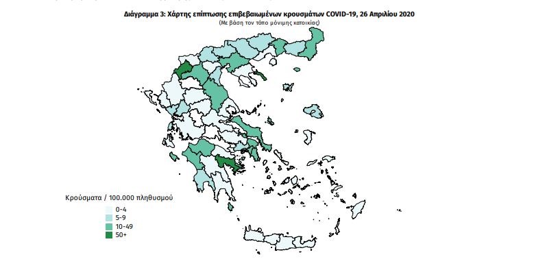 Γεωγραφική διασπορά Ο χάρτης αποτυπώνει τη γεωγραφική κατανομή των συνολικών κρουσμάτων COVID-19 ανά Περιφερειακή Ενότητα της χώρας, με βάση την δηλωθείσα διεύθυνση μόνιμης κατοικίας του ασθενούς. Σύμφωνα με τον χάρτη οι νομοί στους οποίους δεν έχει καταγραφεί κρούσμα είναι οι Γρεβενών, Ευρυτανίας και Φωκίδας. Οι περιοχές με τον μεγαλύτερο αριθμό κρουσμάτων (50 ανά 100.000 πληθυσμού που εμφανίζονται σε σκούρο πράσινο χρώμα) είναι οι νομοί Καστοριάς, Αργολίδας και η Χερσόνησος του Άθω.