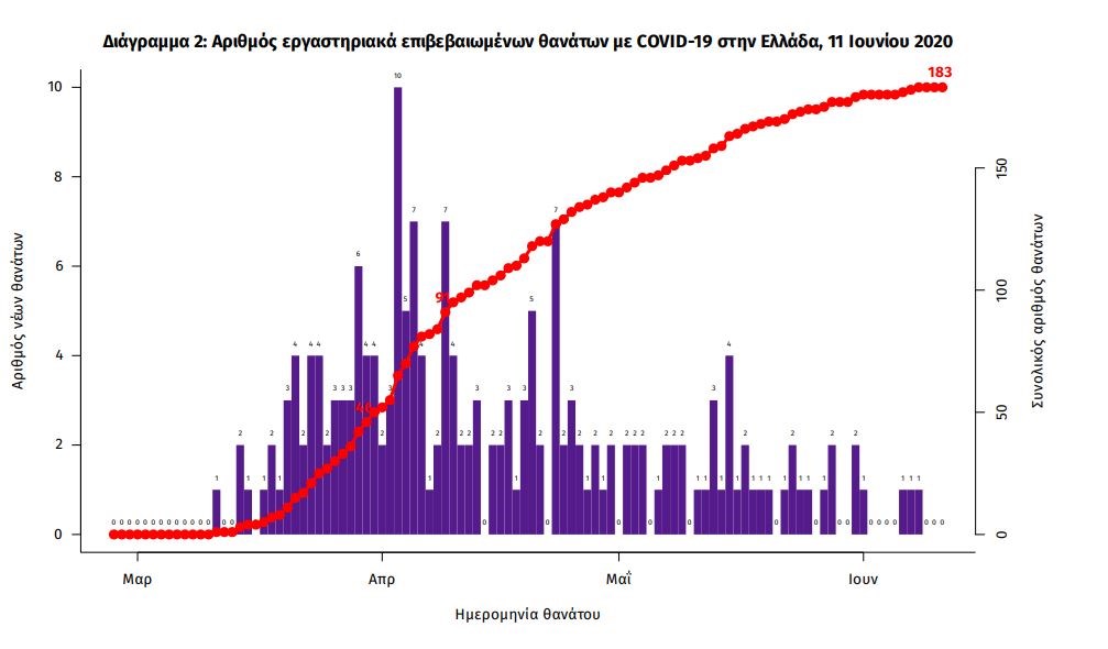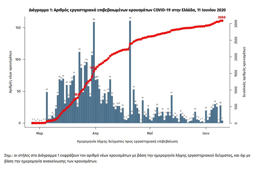 Αναλυτικά, όπως ανακοίνωσε ο ΕΟΔΥ, τα στοιχεία που παρουσιάζονται αφορούν περιστατικά από την επιδημιολογική επιτήρηση της νόσου από το νέο κορονοϊό (COVID19), με βάση τα δεδομένα που έχουν δηλωθεί στον ΕΟΔΥ και καταγραφεί μέχρι τις 11 Ιουνίου 2020 (ώρα 15:00). Τα νέα εργαστηριακά επιβεβαιωμένα κρούσματα της νόσου είναι 20.