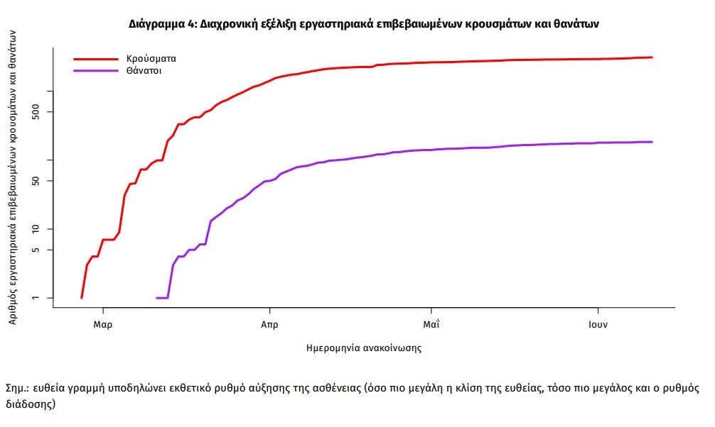 Η διαχρονική εξέλιξη των συνολικών κρουσμάτων και συνολικού αριθμού των θανάτων ασθενών COVID-19 παρουσιάζεται στο ακόλουθο διάγραμμα (σε λογαριθμική κλίμακα).
