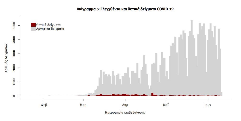 Δείγματα που έχουν ελεγχθεί στα συνεργαζόμενα με τον ΕΟΔΥ εργαστήρια: Από την 1η Ιανουαρίου 2020 μέχρι σήμερα, στα εργαστήρια που διενεργούν ελέγχους για τον νέο κορονοϊό (SARS-CoV-2) και που δηλώνουν συστηματικά στον ΕΟΔΥ το σύνολο των δειγμάτων που ελέγχουν (θετικά και αρνητικά), έχουν συνολικά ελεγχθεί 237276 κλινικά δείγματα, εκ των οποίων τα 5062 (2.1%) ήταν θετικά στον κορονοϊό (συμπεριλαμβάνονται και περισσότερα από ένα δείγματα ανά άτομο που ελέγχθηκε).